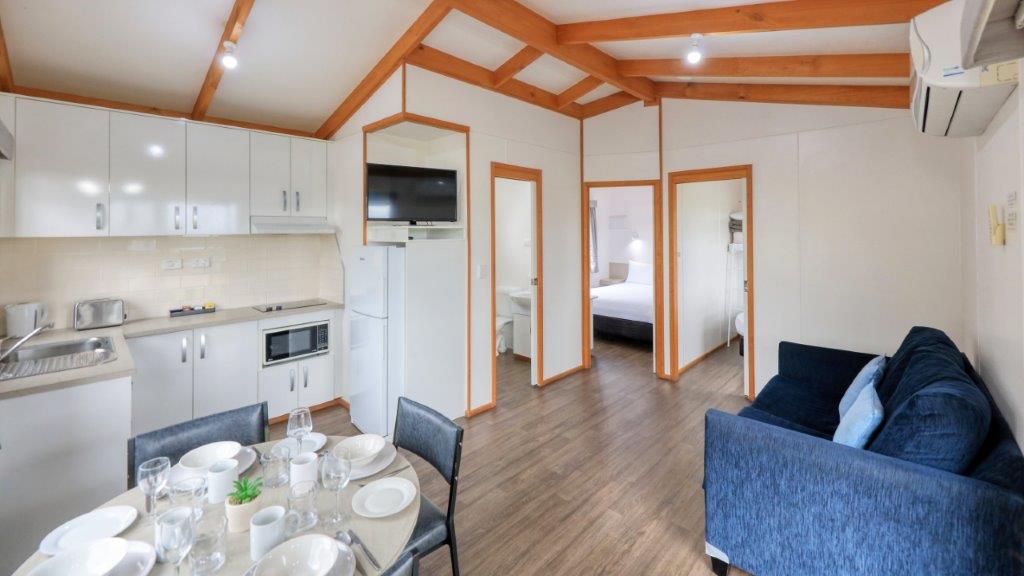 Featuring two bedrooms adorned with a queen bed, double bed and single bunk, our cabins offer a perfect blend of style and functionality for your getaway.
