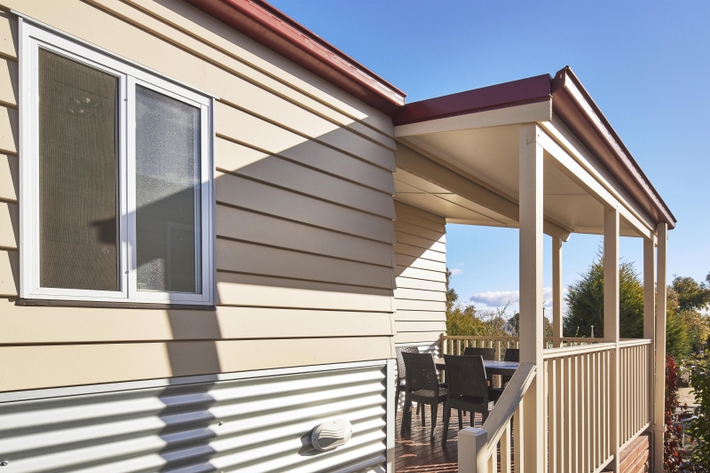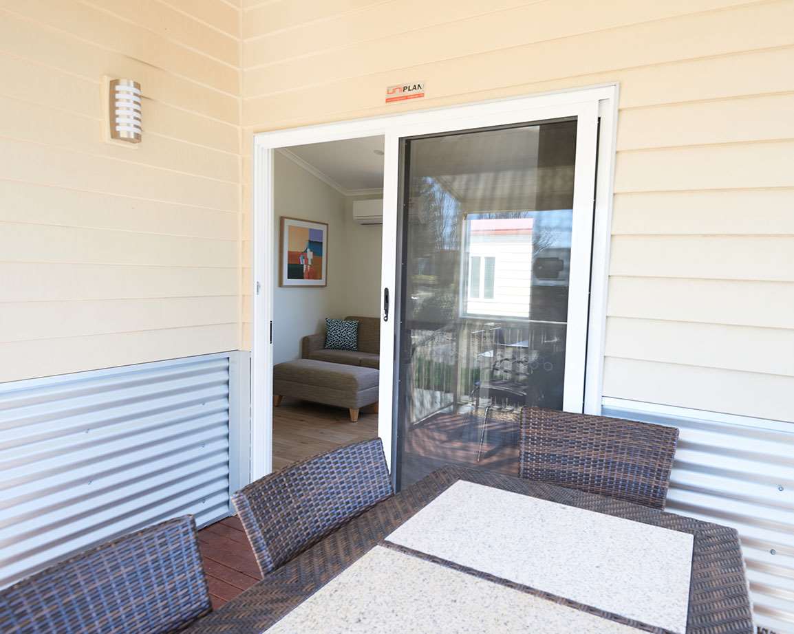 Located in a quiet area of the park. Queen bed. Features kitchen including stovetop, convection microwave and fridge; air-conditioning; one bathroom; small veranda; dining setting and lounge with flat screen television and DVD; on-site parking for one vehicle.