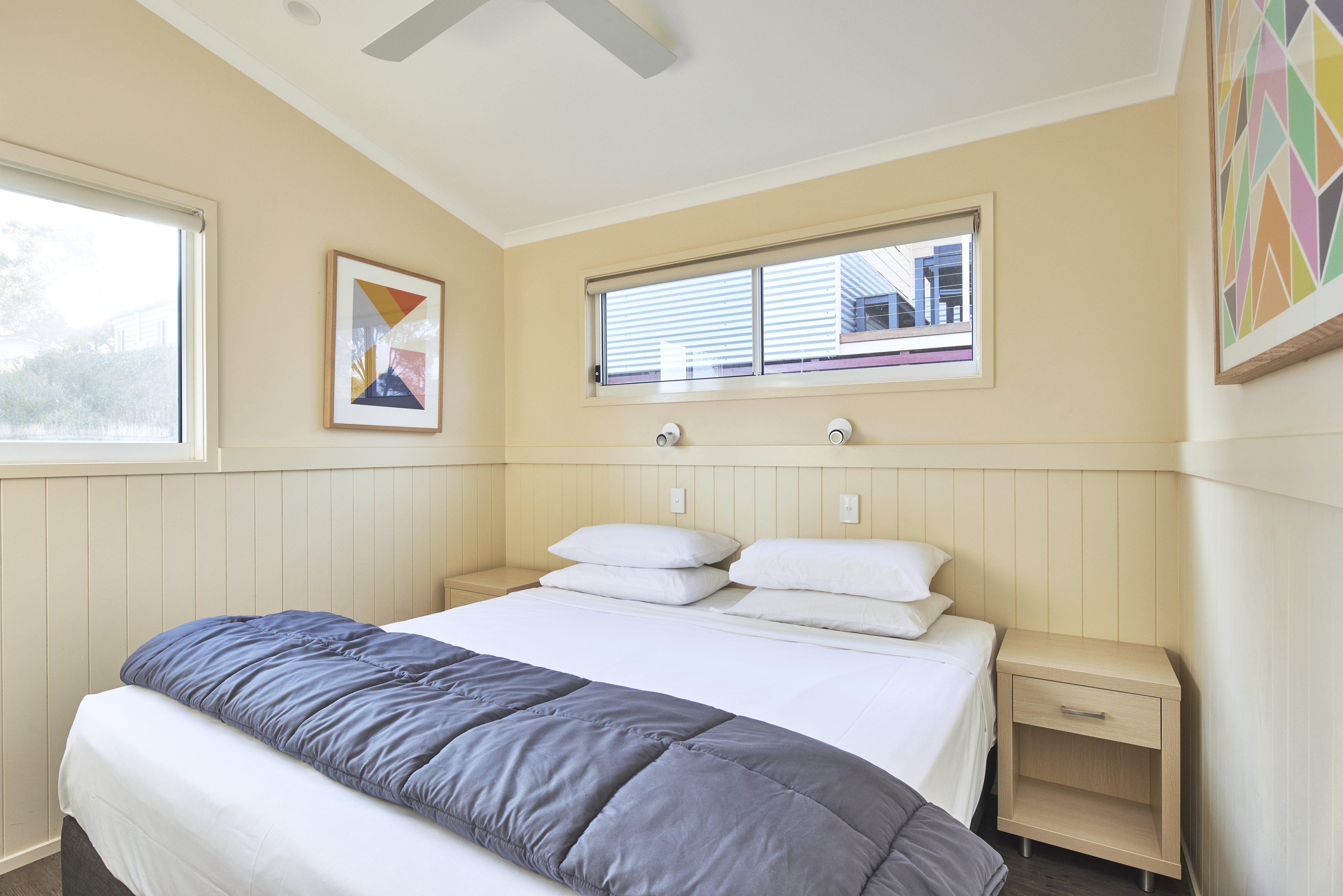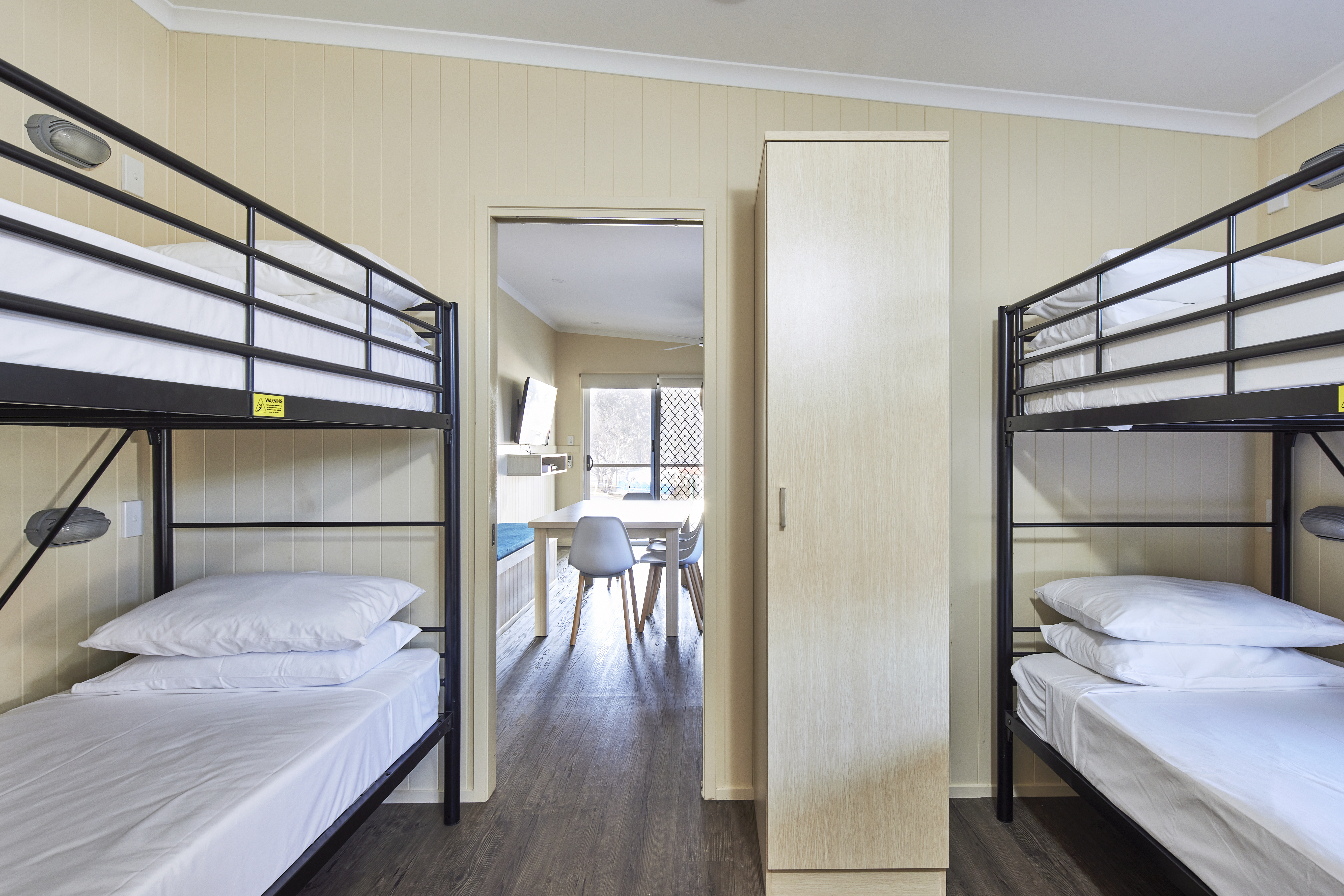 Located in close proximity to park facilities. One king, two singles and two single bunks. Features air-conditioning; heating; full kitchen with stovetop, convection microwave and fridge; lounge and dining area; TV and DVD; two bathrooms; patio with outdoor furniture.