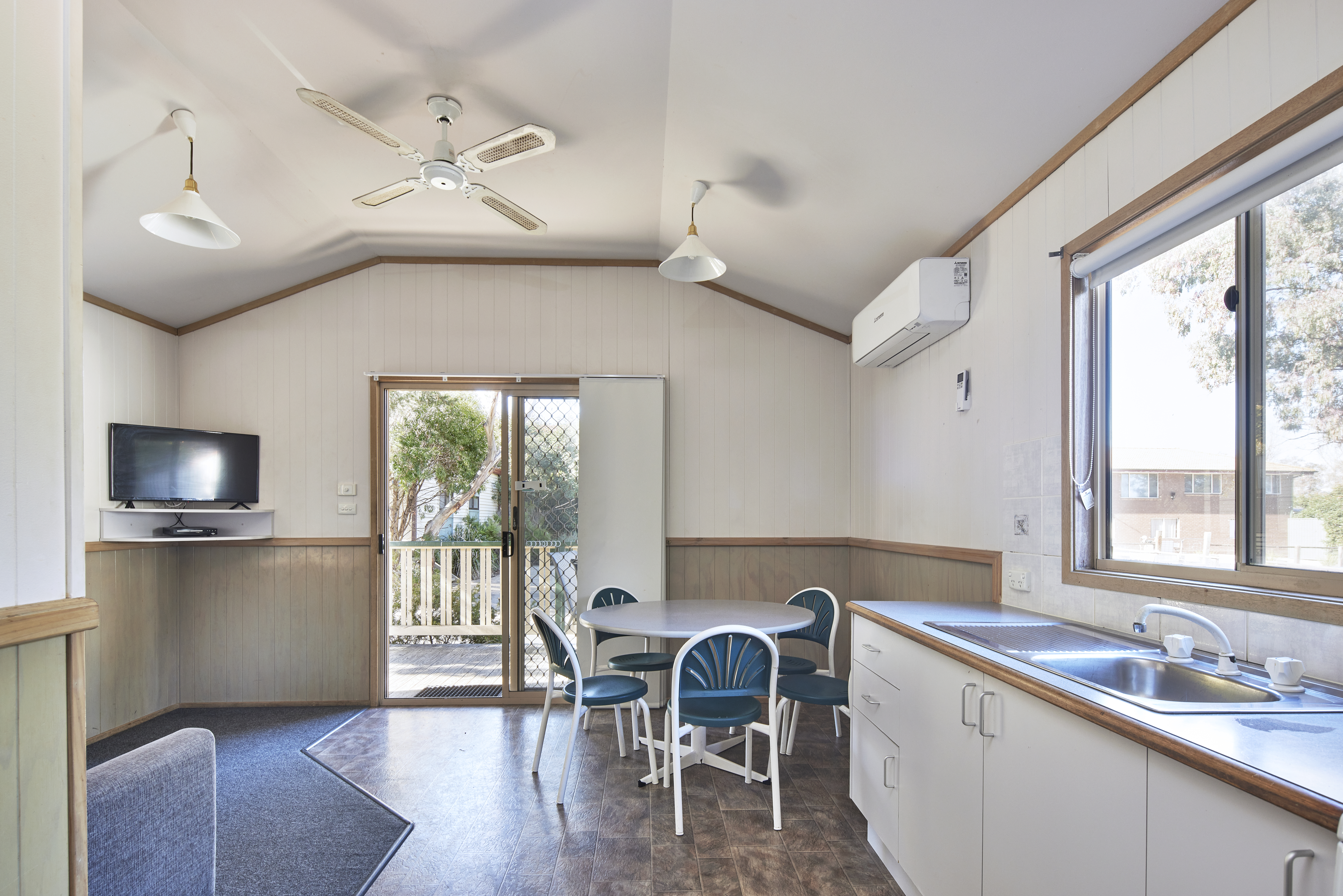 One queen, one single bunk and one single bed. Features air-conditioning; heater; full kitchen; dining and lounge; TV; bathroom; veranda and outdoor setting.