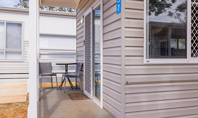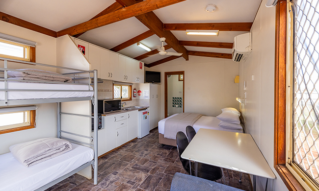 Located close to park facilities. One double and one single bunk. Features air-conditioning; heating; kitchenette including stovetop, convection microwave and bar fridge; bathroom; veranda with outdoor furniture; dining area; lounge area with TV and DVD. Select cabins have small fenced yard and single small dog house, please call the park to check availability. One pet allowed per booking. Pet fees apply.