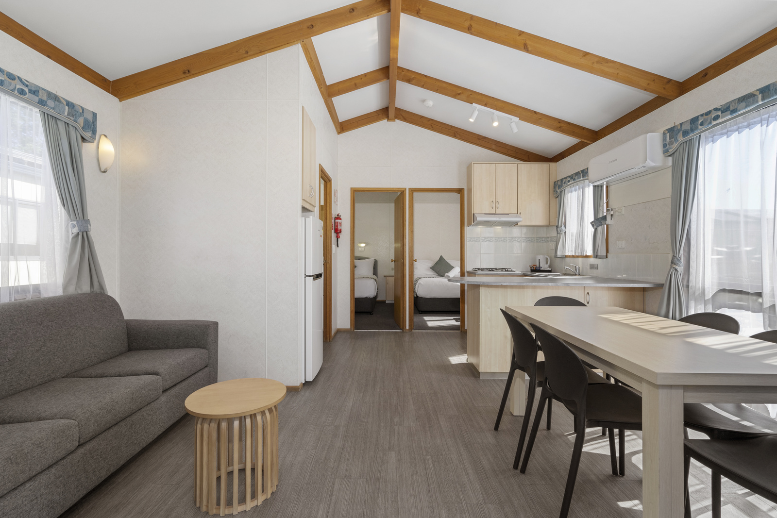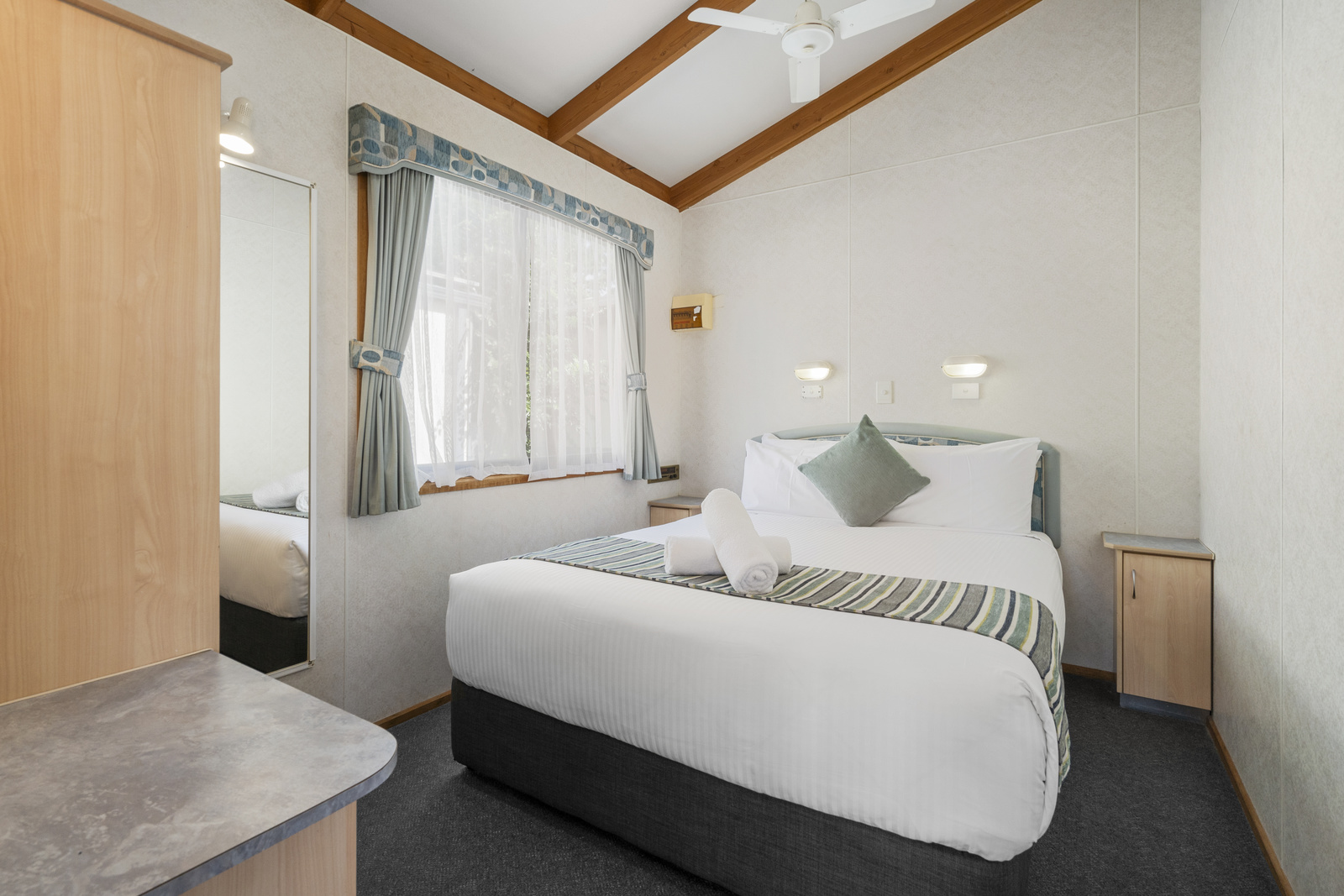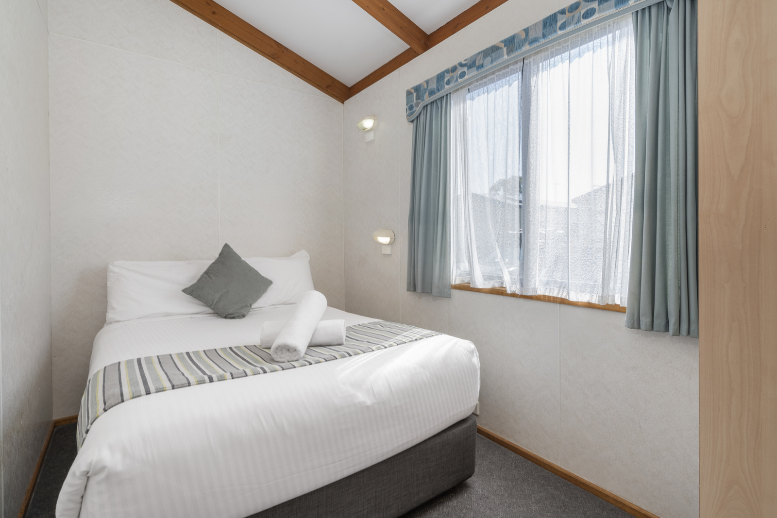 These 2 Bedroom Standard Cabins sleep up to four guests with a queen bed in the main bedroom and a double bed in the second bedroom, as well as a bathroom, living area, kitchenette, and small private deck.
