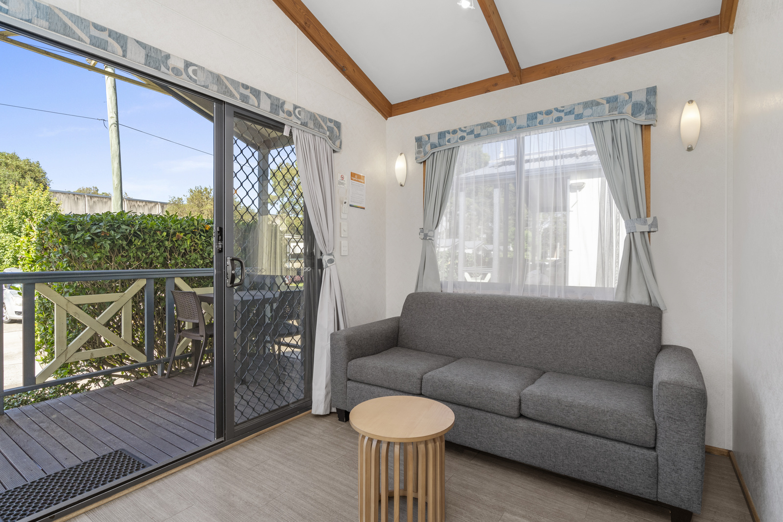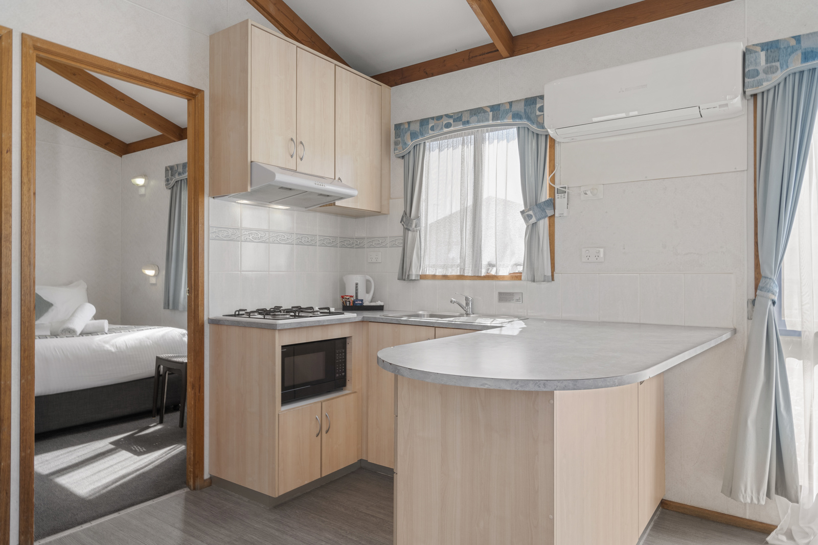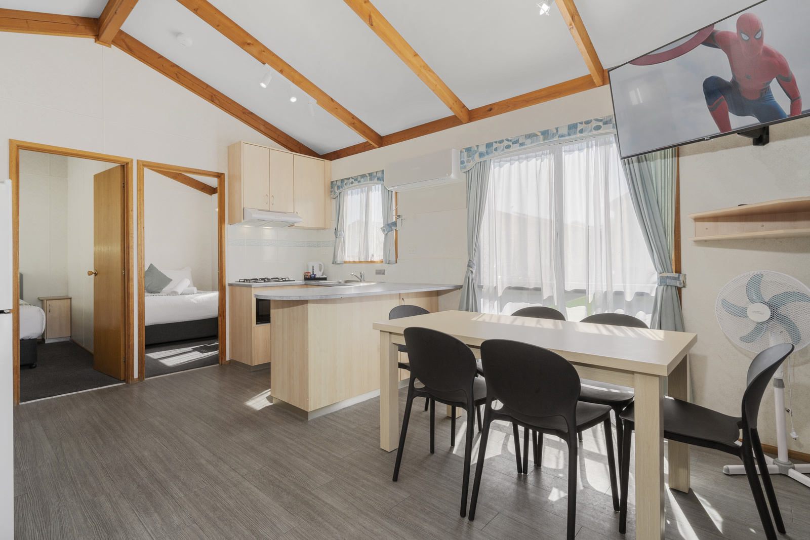 These 2 Bedroom Standard Cabins sleep up to four guests with a queen bed in the main bedroom and a double bed in the second bedroom, as well as a bathroom, living area, kitchenette, and small private deck.