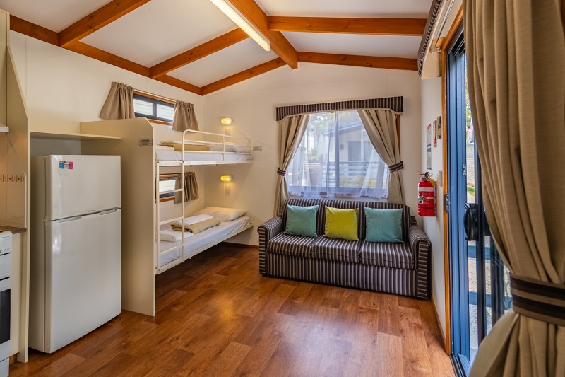Our Wren Cabins sleep up to four guests with a double bed and bunk in the open plan space, as well as an external ensuite bathroom, living area and kitchen.