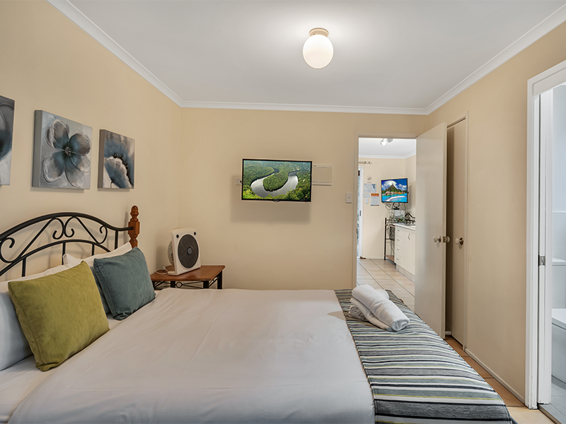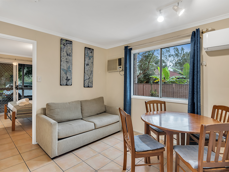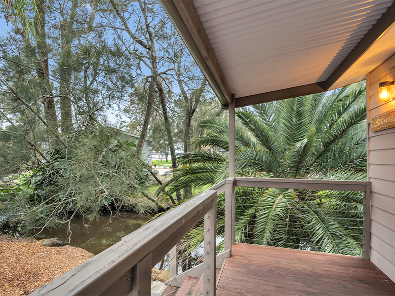 Our One Bedroom Cottage sleeps up to two guests, with a queen bed in the main bedroom and a bathroom, kitchenette and open plan living area, as well as a private deck.