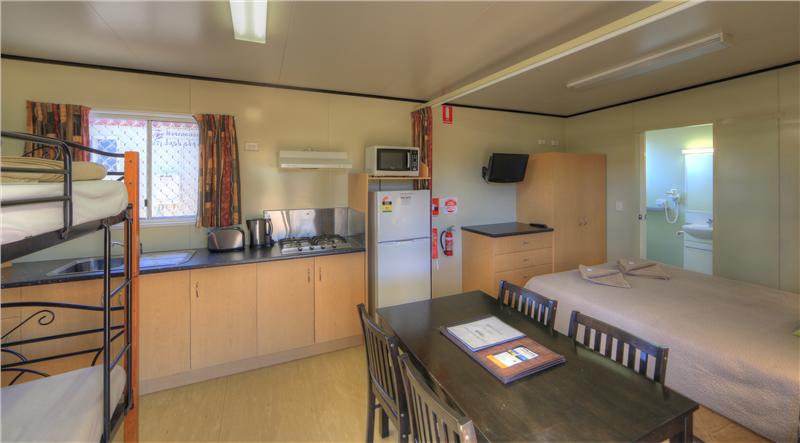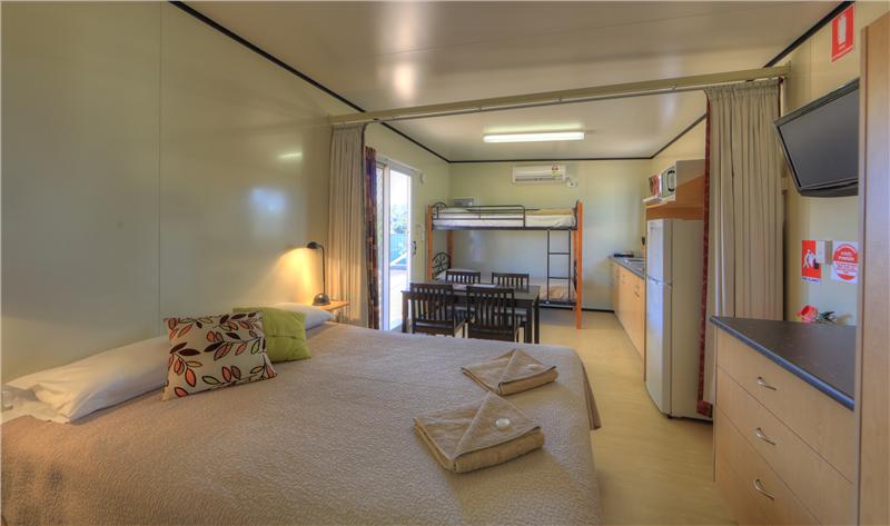 Ideal for couples or small families, this studio cabin sleeps up to four with a queen bed and a single bunk set in an open-plan layout.