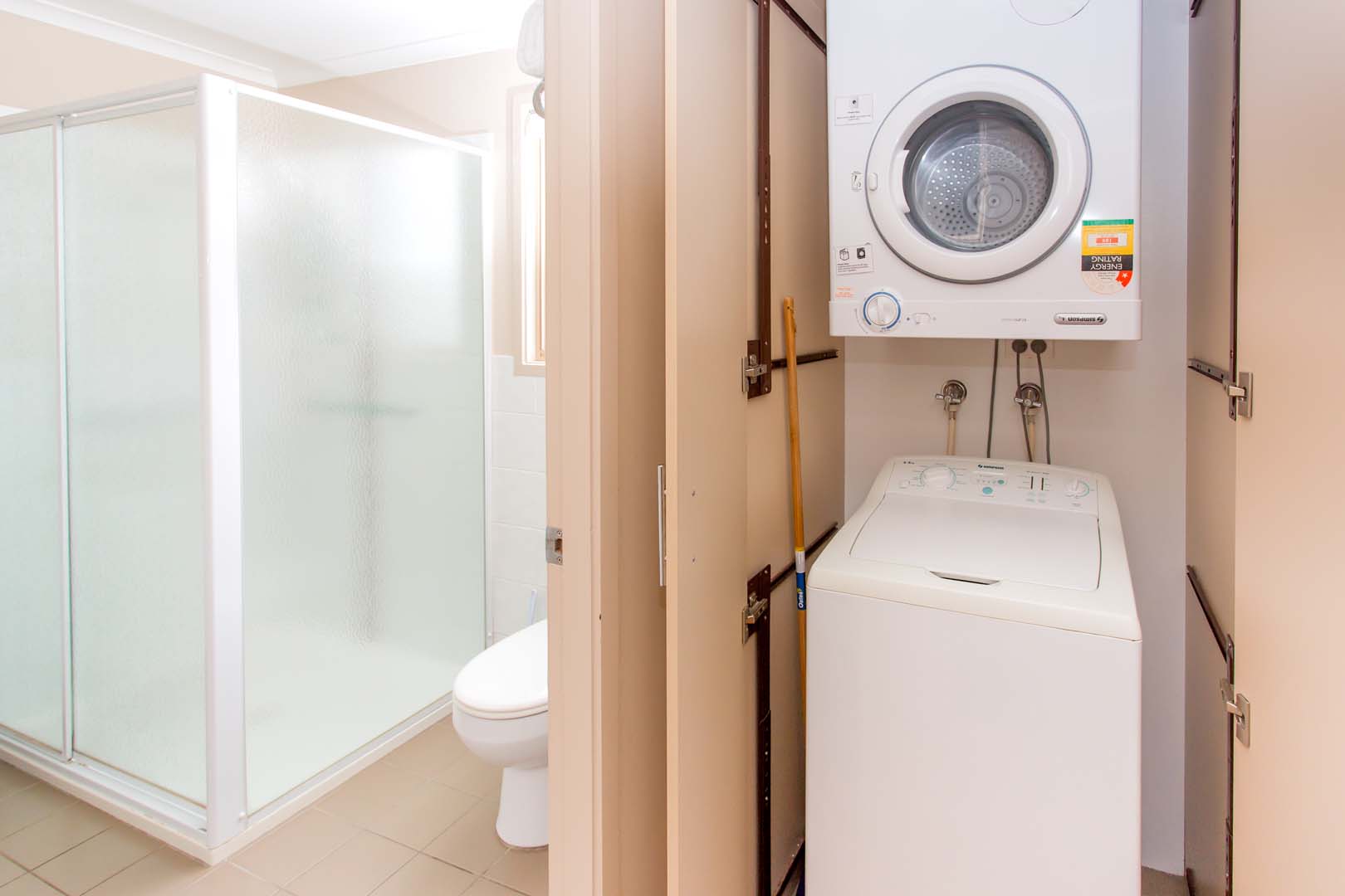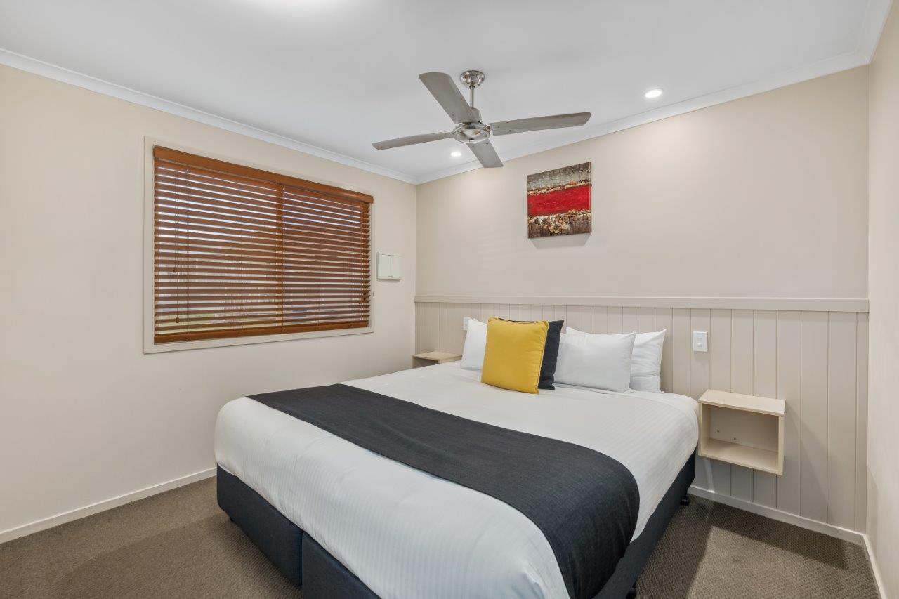 Enjoy the comfy outdoor deck with stunning views of the Peel River. The main bedroom boasts a king bed, while the second bedroom features a queen bed and bunk beds, plus both rooms come with their own TVs. Stay cool in the air-conditioned villa, which includes a fully equipped kitchen with a full-size fridge, gas cooktop, convection microwave, and dishwasher drawer. Relax in the spacious lounge area with a leather couch, large TV, and dining table. You'll also find a washing machine and dryer for your convenience.