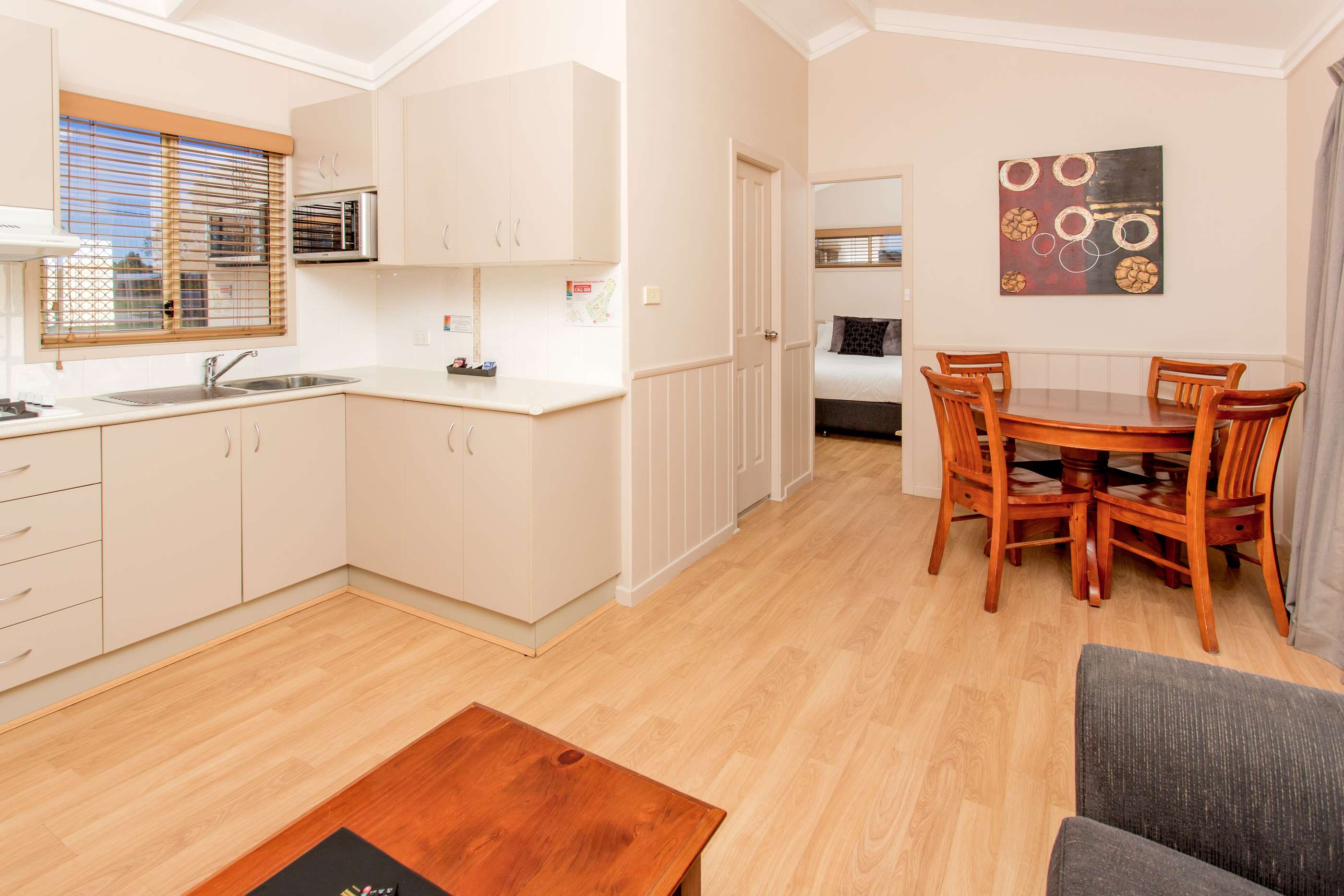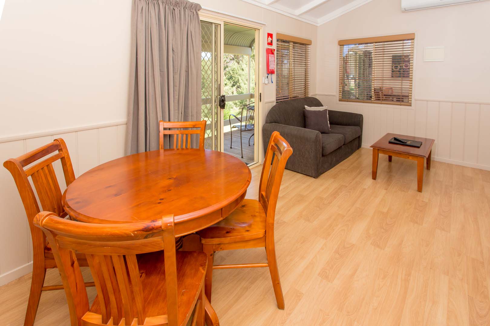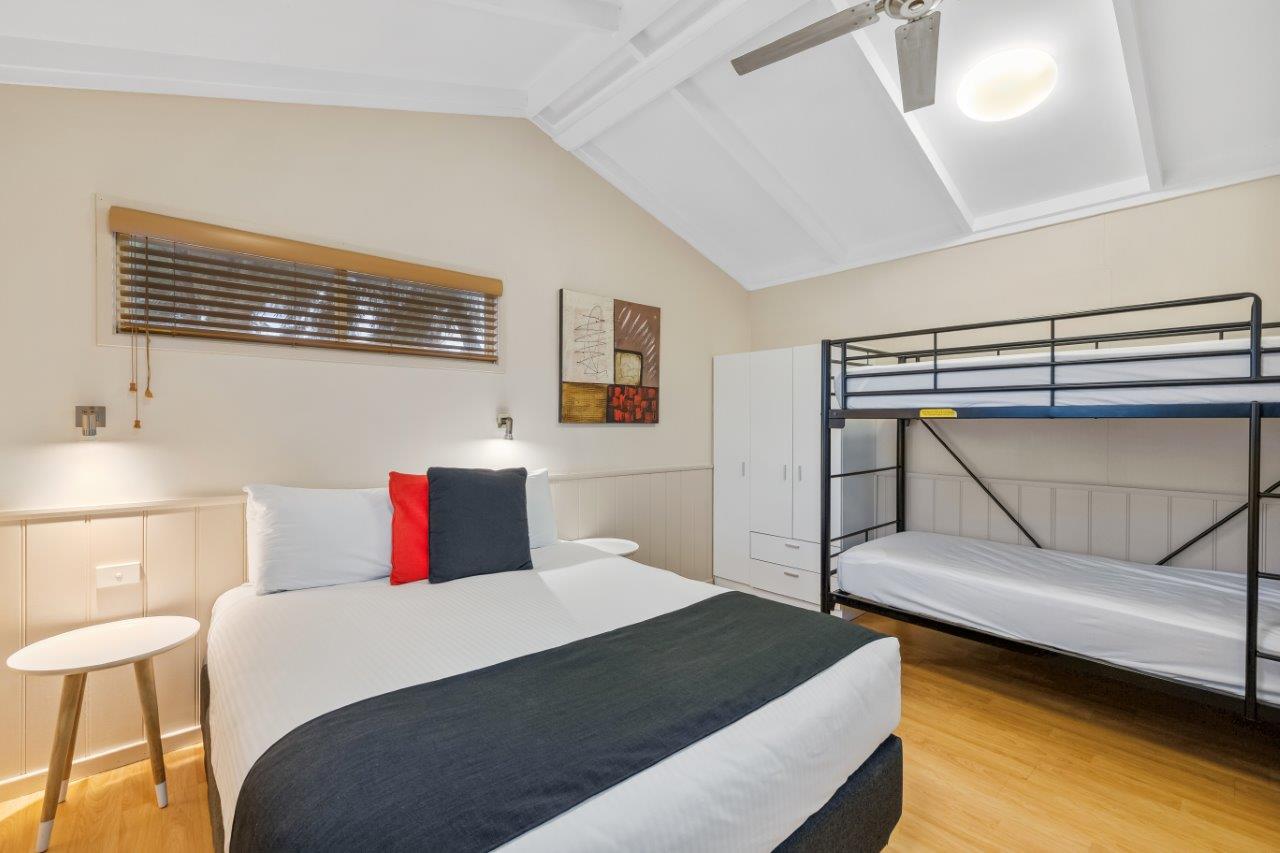 This charming cosy cabin by the river features a queen bed in the main bedroom and a set of bunks. Enjoy a TV in the bedroom too! The bathroom is conveniently located off the living area. The kitchen is equipped with a full-sized fridge, gas cooktop, and convection microwave. Stay comfy with reverse cycle air conditioning and relax on the leather lounge or around the dining table!