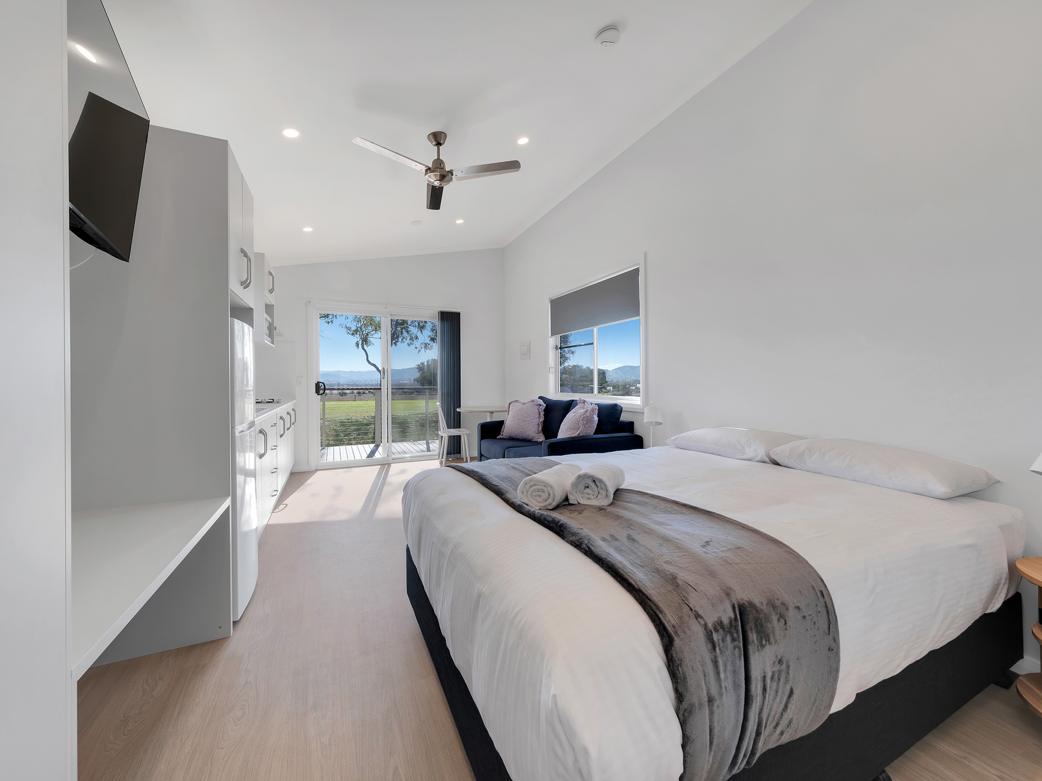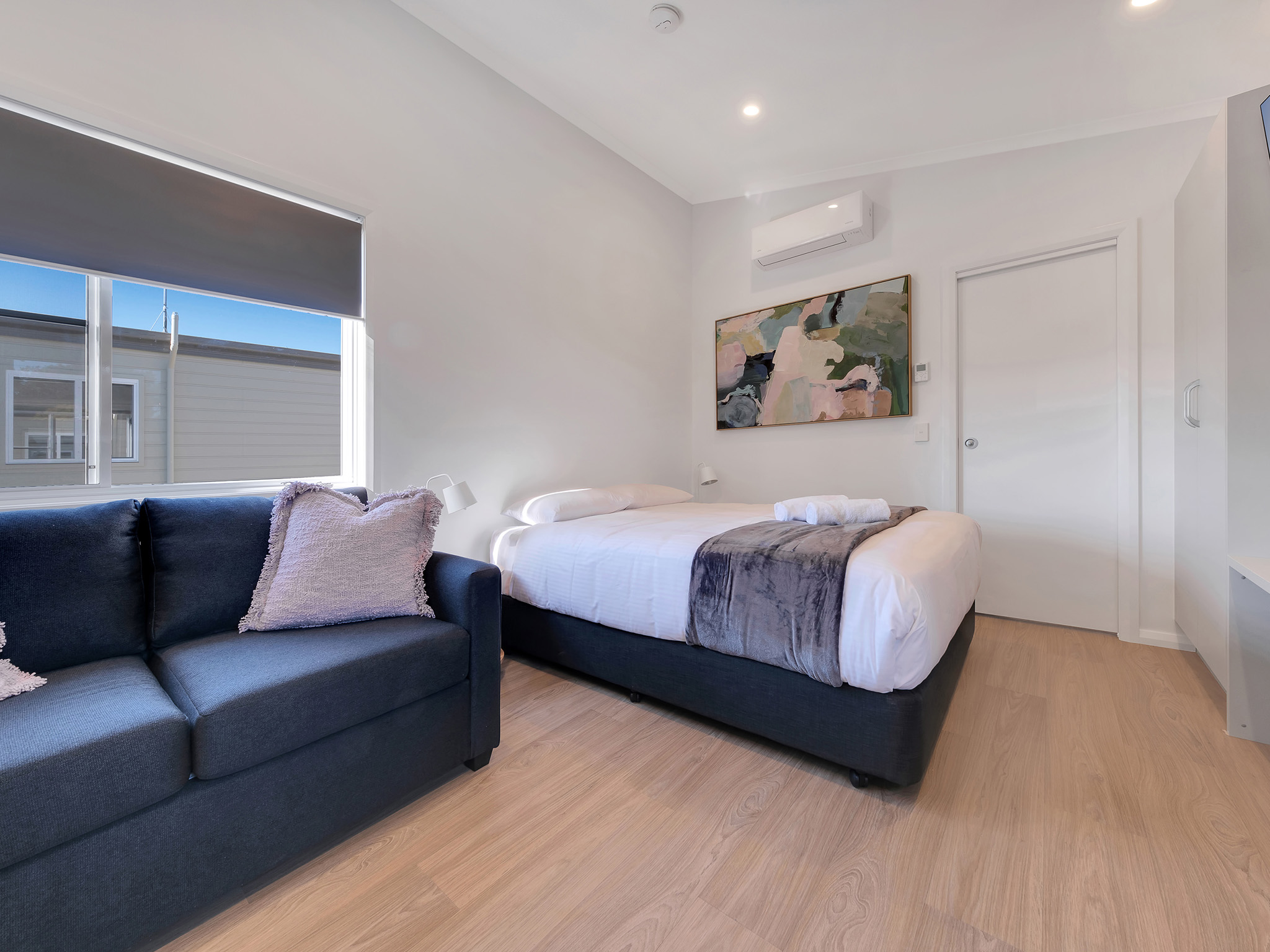 Featuring a comfortable double bed and private bathroom, it includes a well-equipped kitchenette with an electric cooktop, microwave, toaster, and bar fridge. Air-conditioning ensures comfort year-round. Step out onto your private patio, furnished with a table, chairs, and two barstools, the perfect spot for an afternoon drink while overlooking the city.