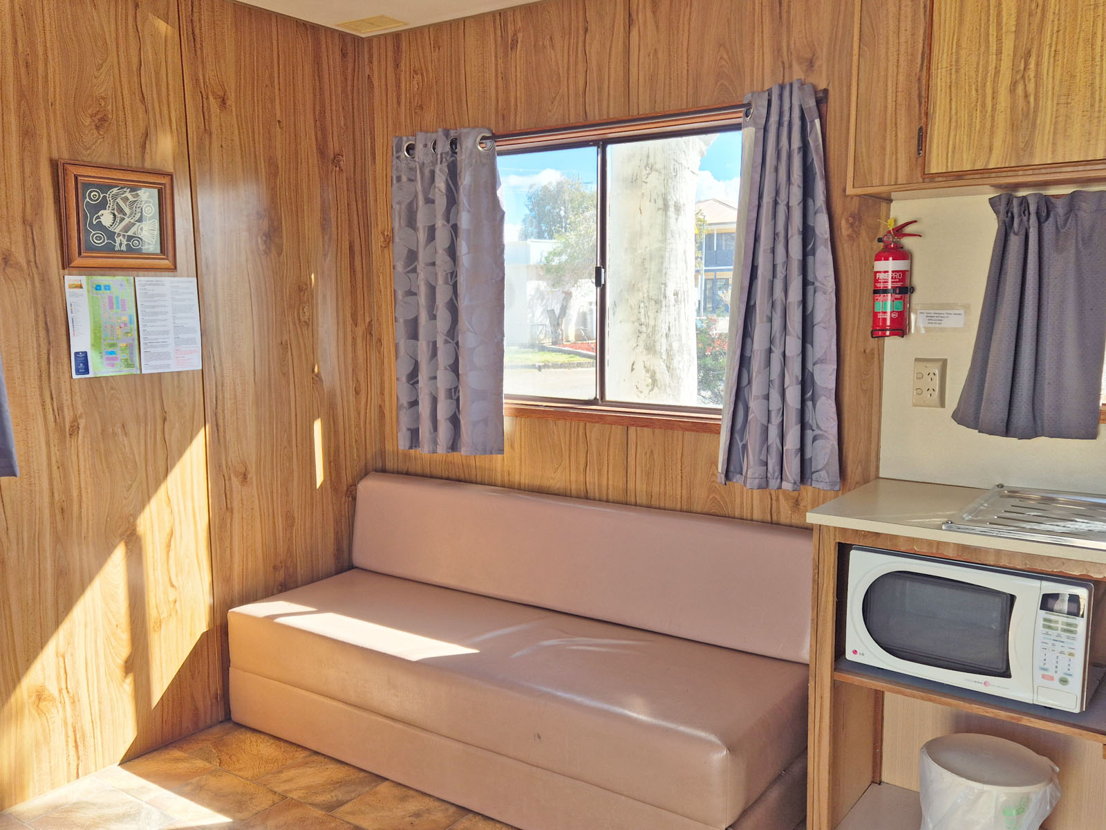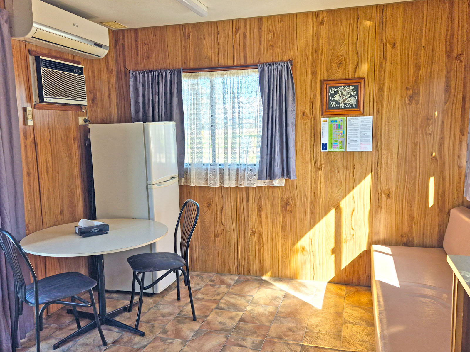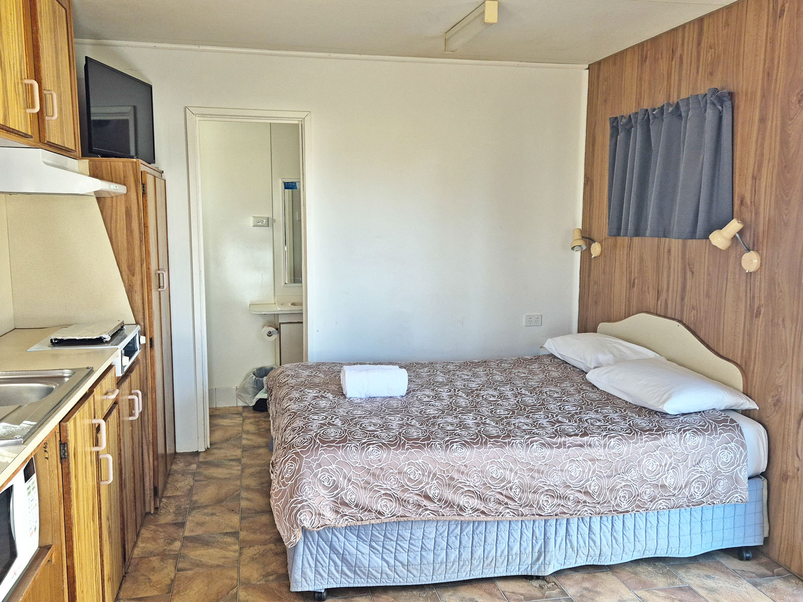 The kitchenette is equipped with an electric cooktop, microwave, toaster, and full-size fridge, making it easy to prepare simple meals. Air-conditioning, a TV, and a dining area offer a comfortable and practical space for short or extended stays.