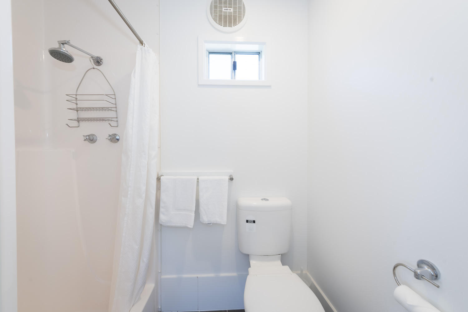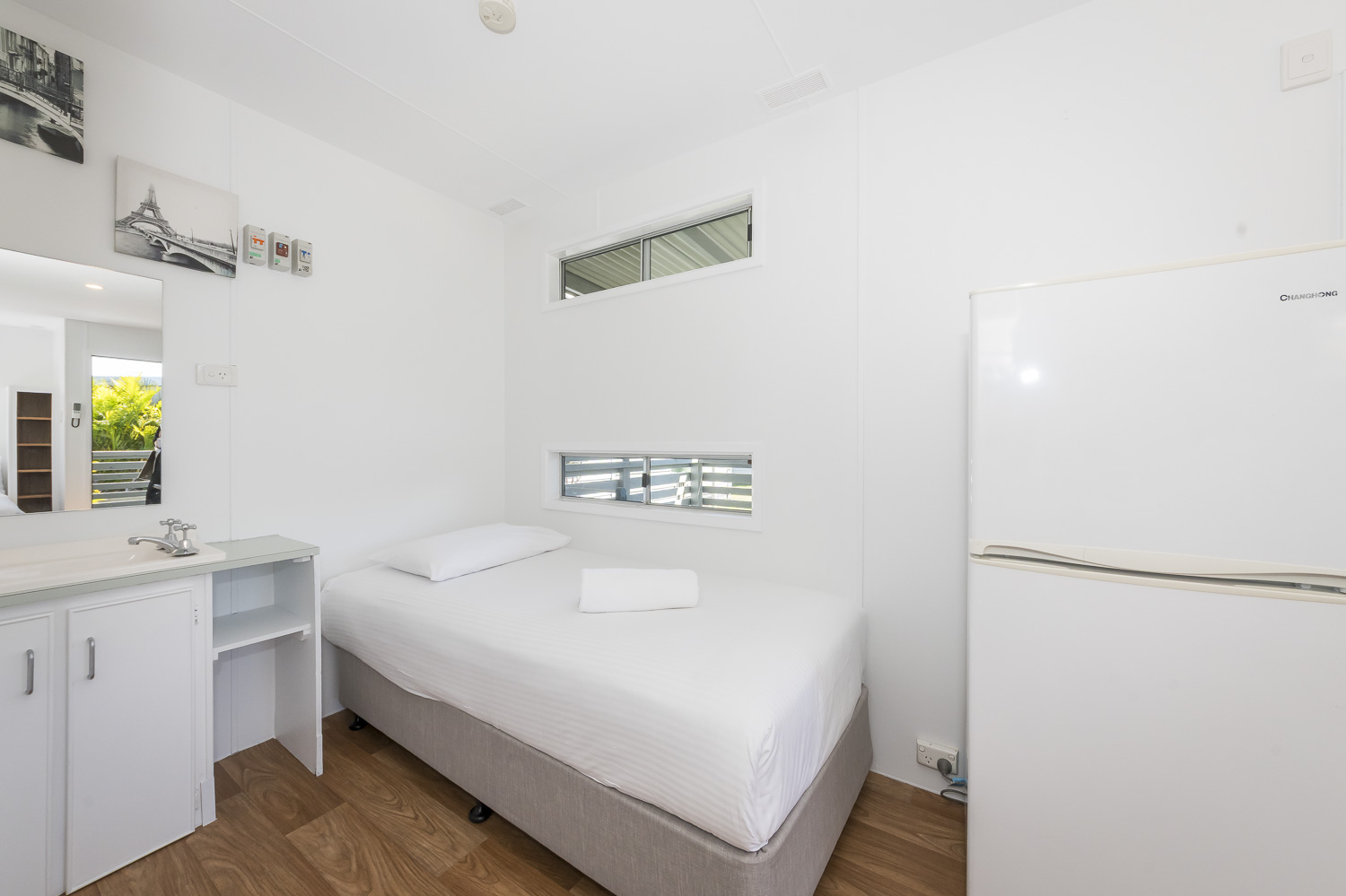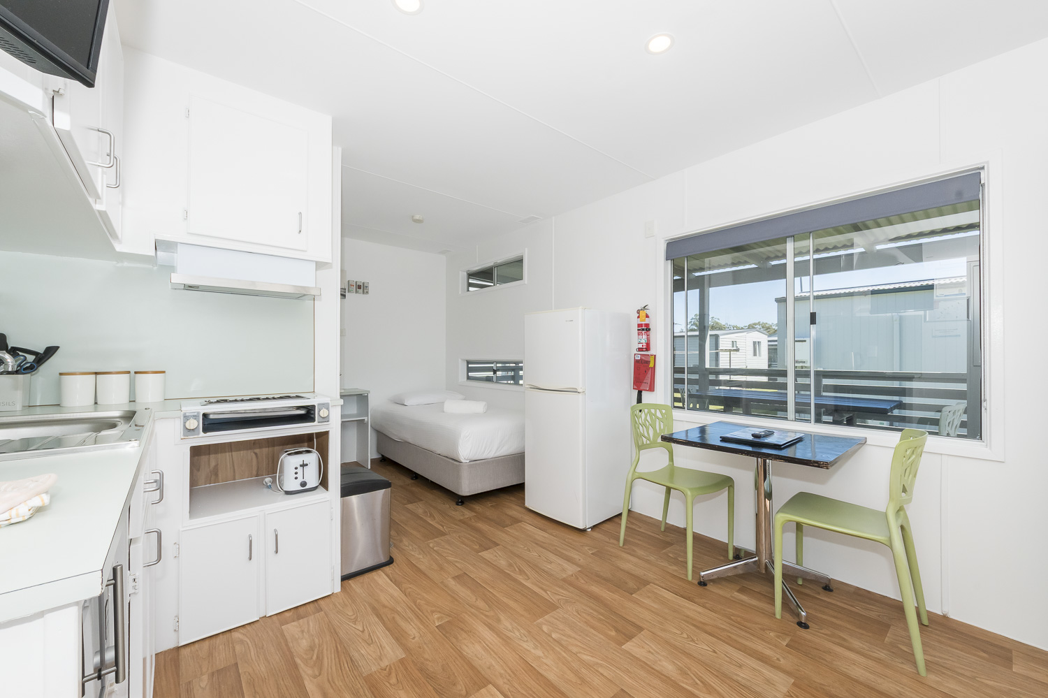 It features a comfy double bed, a dining table, a kitchenette, and an ensuite. The kitchenette includes an electric cooktop, microwave, fridge/freezer, kettle, toaster, pots, pans, and cooking utensils. The ensuite comes with a shower, toilet, and sink. Just a heads up - this cabin doesn’t have a lounge area.