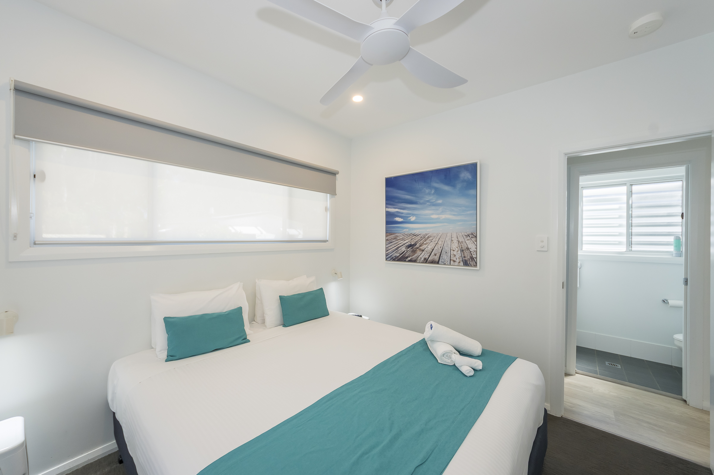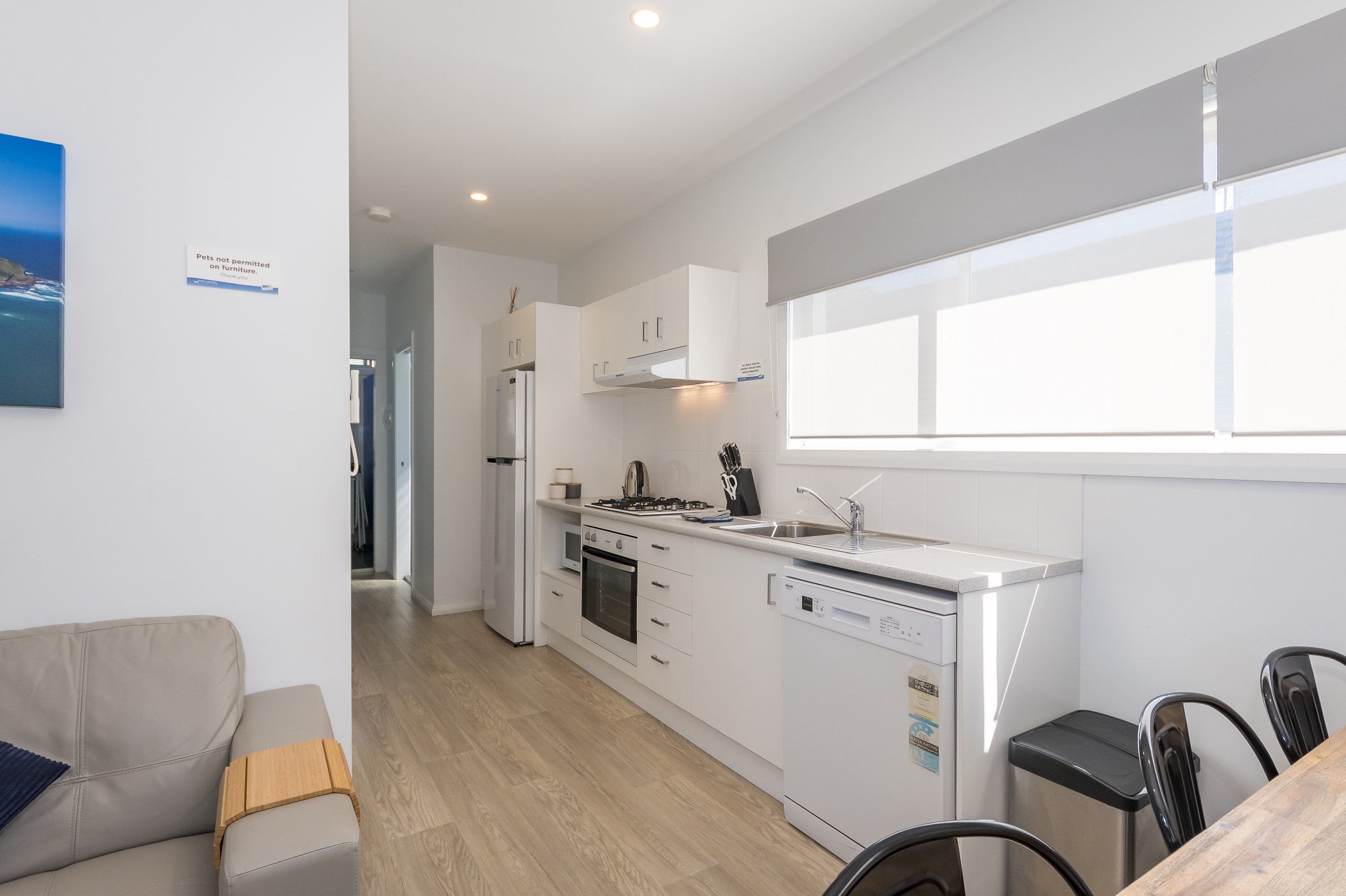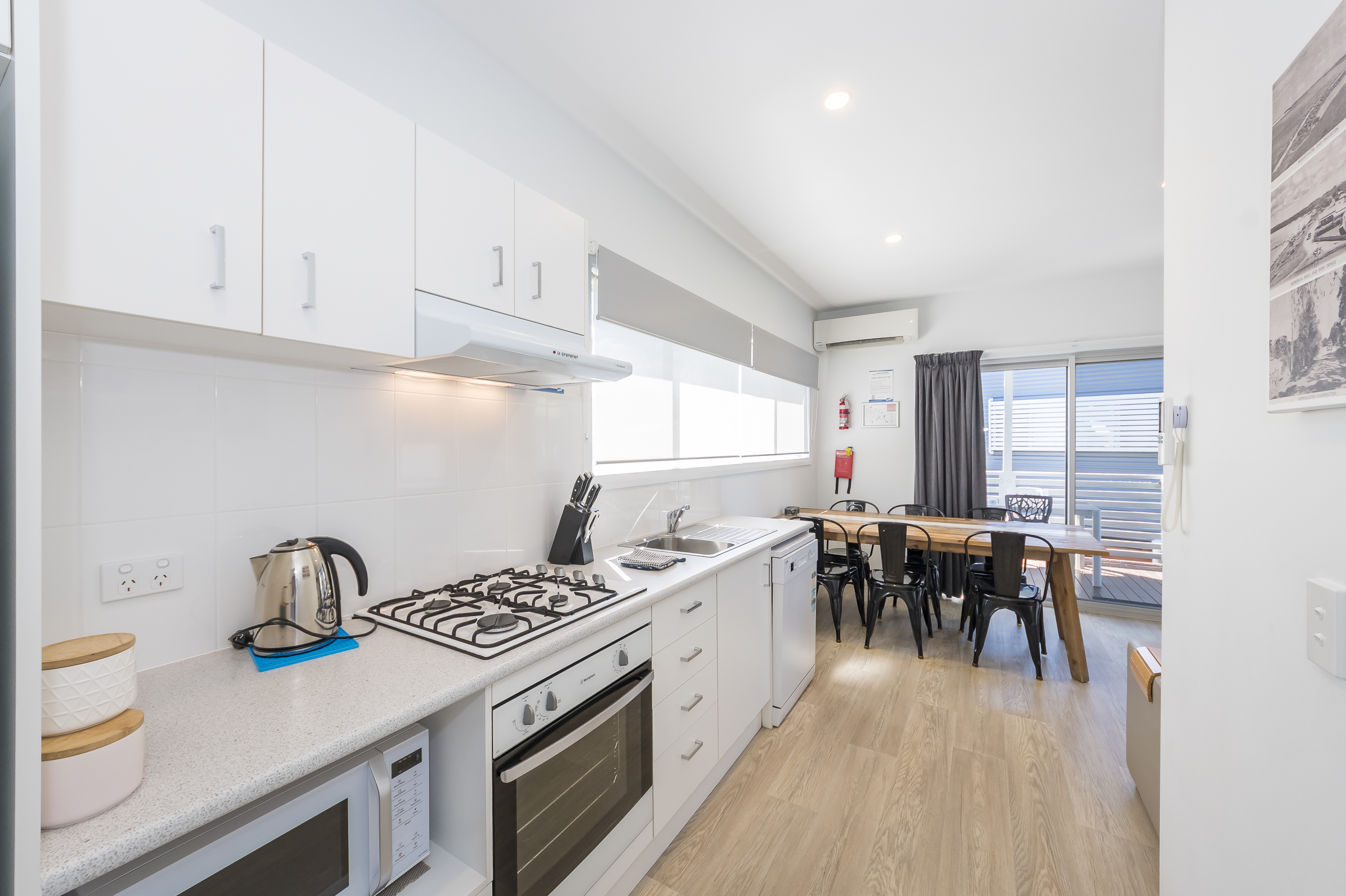 They feature an open plan living and dining area that leads to a private verandah with outdoor dining and a BBQ. The galley-style kitchen is fully equipped with an electric oven, gas stovetop, fridge, microwave, and dishwasher. The modern bathroom includes a vanity, walk-in shower, and separate toilet. Bedroom 1 has a king bed, while bedroom 2 has king singles. You can request to separate the king bed into singles or join the singles into a king bed. A trundle bed can also be added to the second bedroom, accommodating up to five guests for an extra charge.