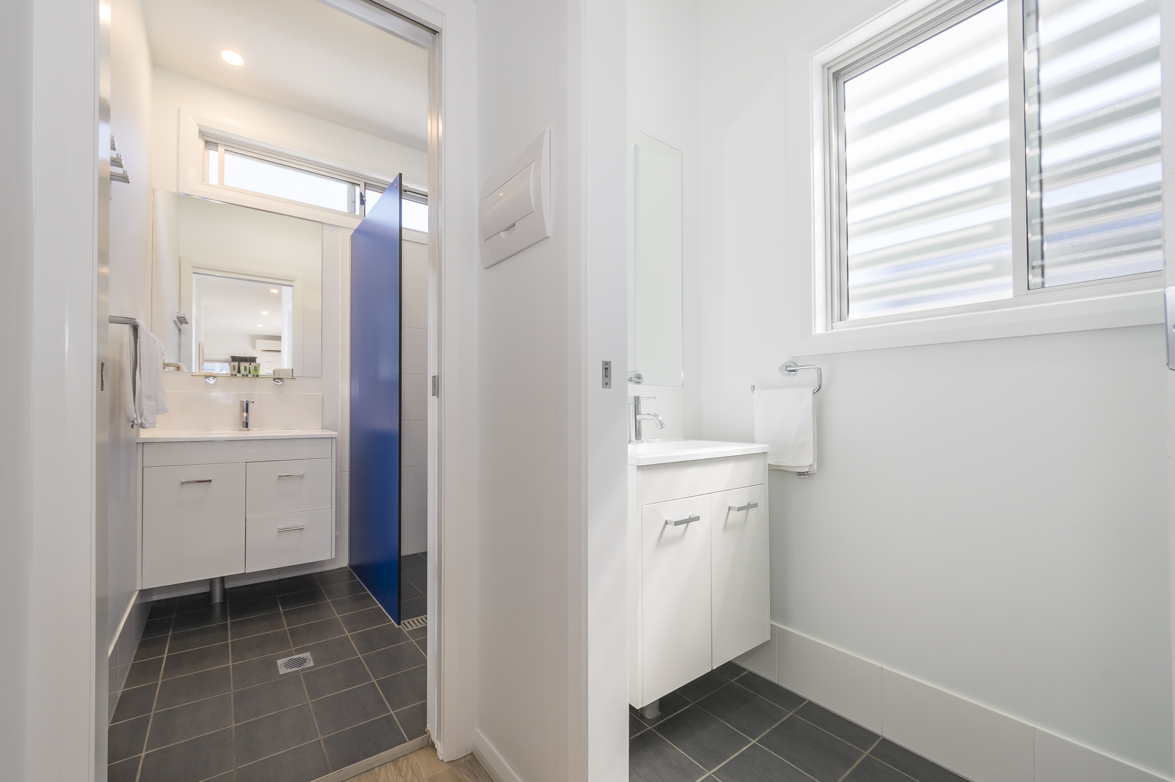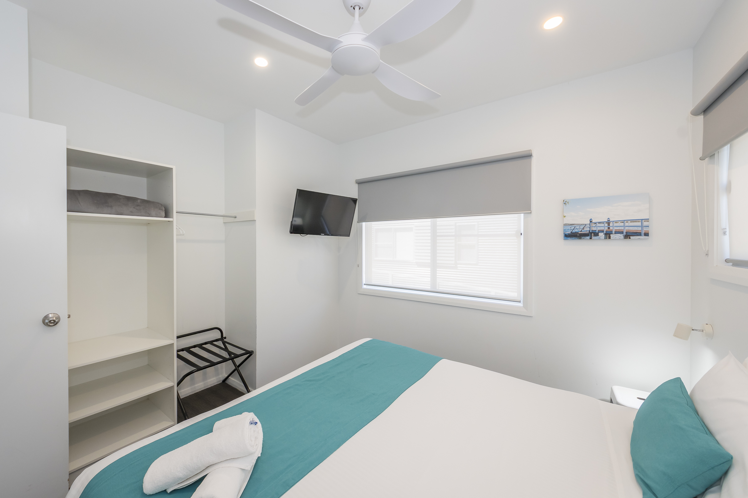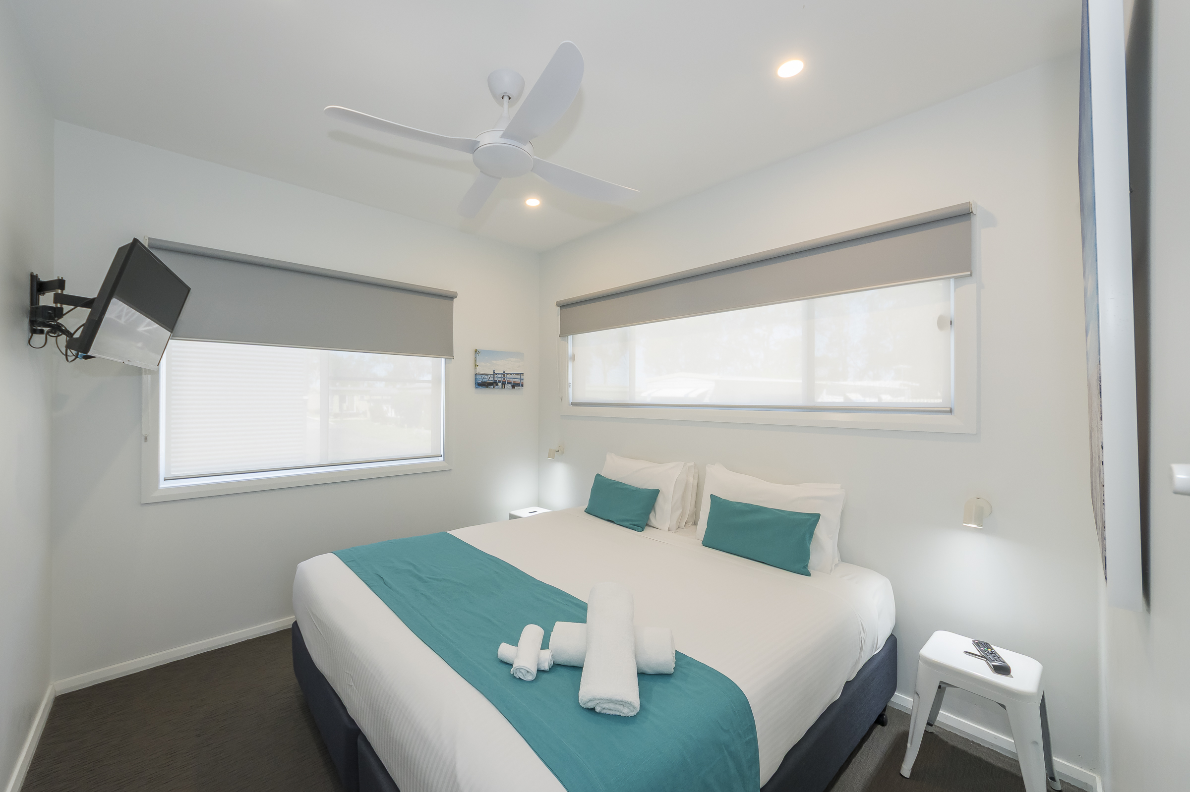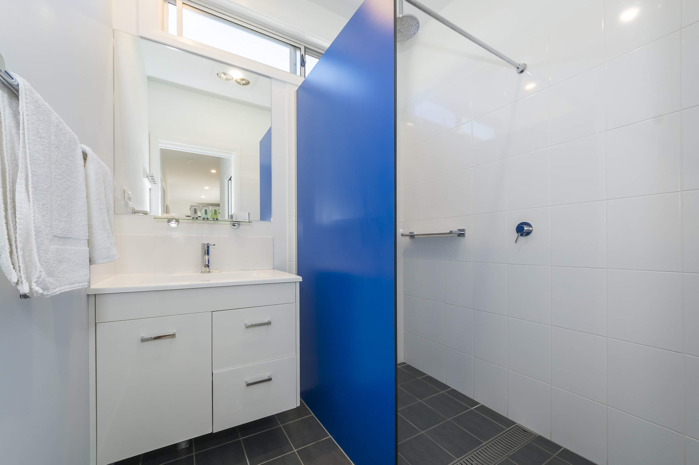 They feature an open plan living and dining area that leads to a private verandah with outdoor dining and a BBQ. The galley-style kitchen is fully equipped with an electric oven, gas stovetop, fridge, microwave, and dishwasher. The modern bathroom includes a vanity, walk-in shower, and separate toilet. Bedroom 1 has a king bed, while bedroom 2 has king singles. You can request to separate the king bed into singles or join the singles into a king bed. A trundle bed can also be added to the second bedroom, accommodating up to five guests for an extra charge.
