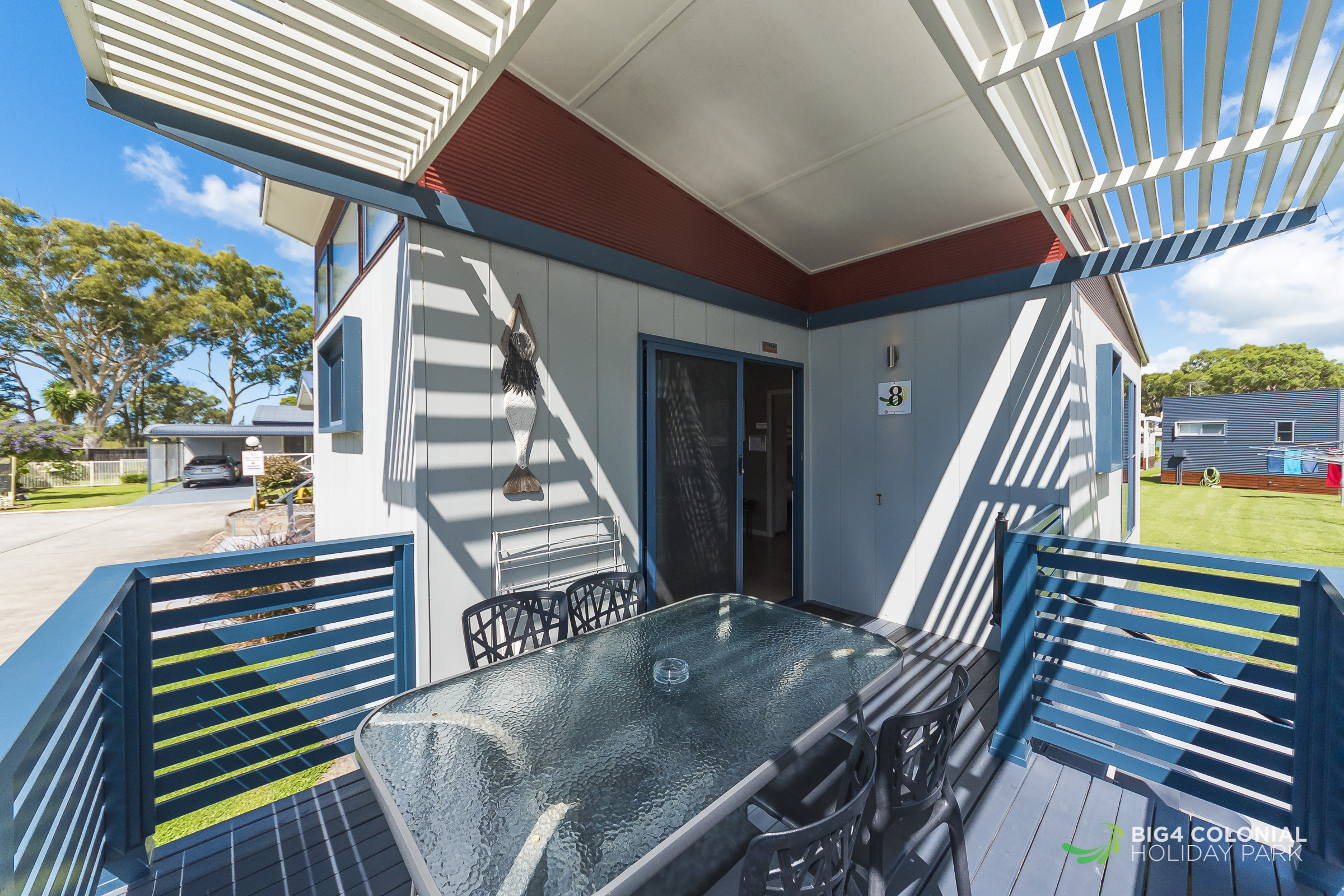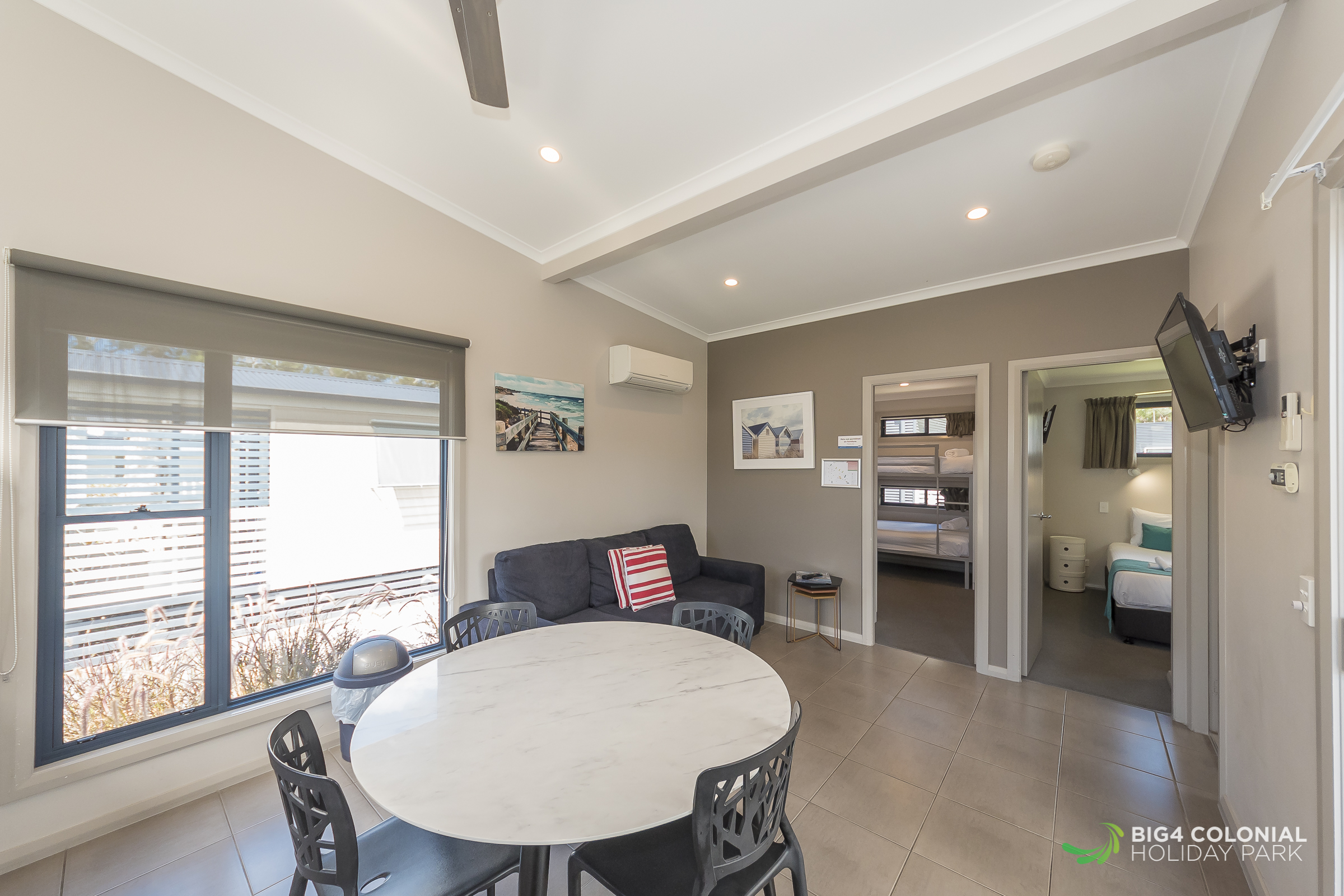 It features an open plan living, dining, and kitchen area. The kitchen includes an oven, fridge/freezer, microwave, sink, kettle, toaster, and cooking utensils. There are two bedrooms: the master bedroom has a queen bed, while the second bedroom contains two sets of single bunks. The modern bathroom offers a shower, toilet, and vanity. Enjoy the secure verandah with an outdoor dining table, perfect for relaxing outside.