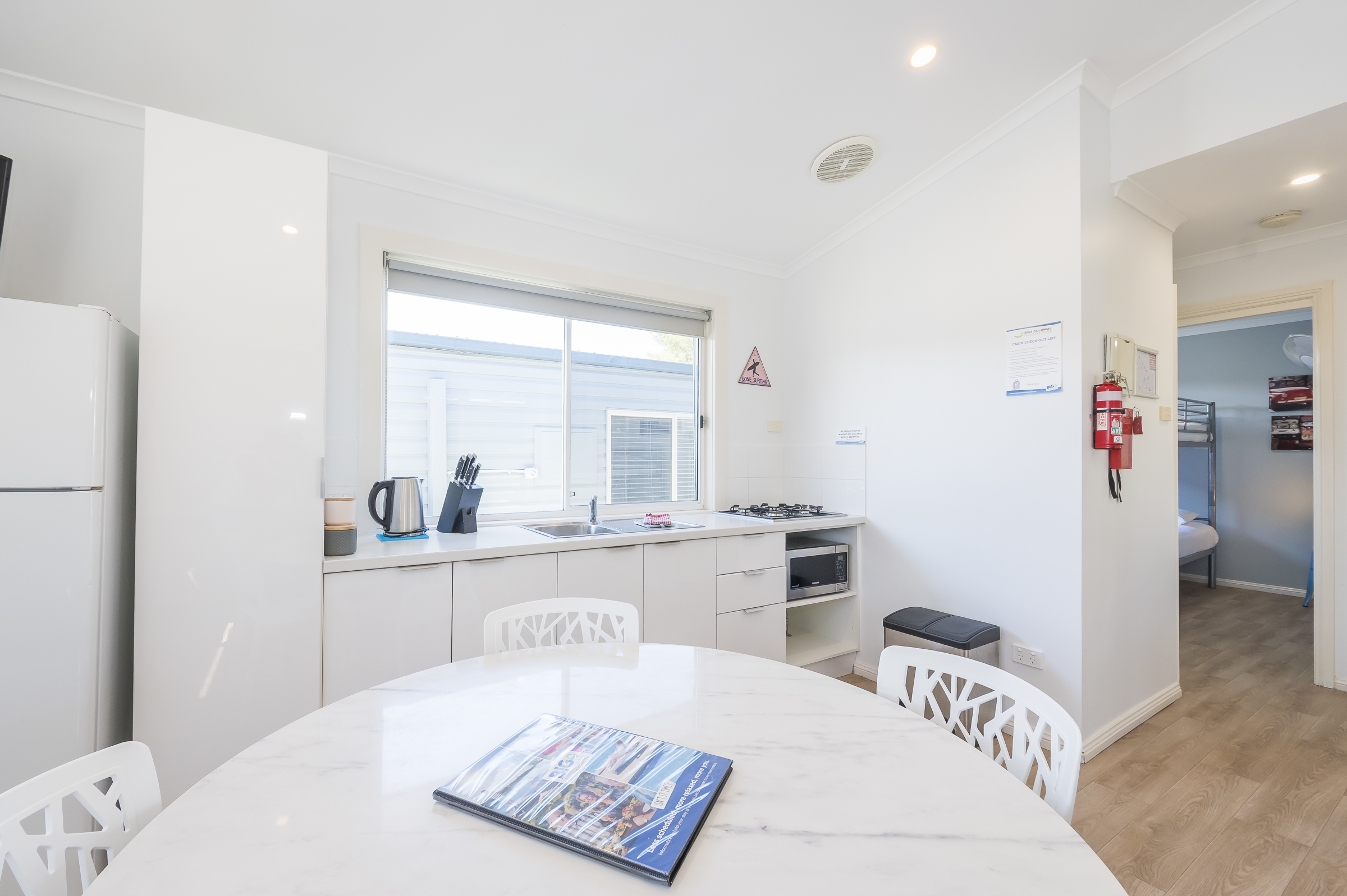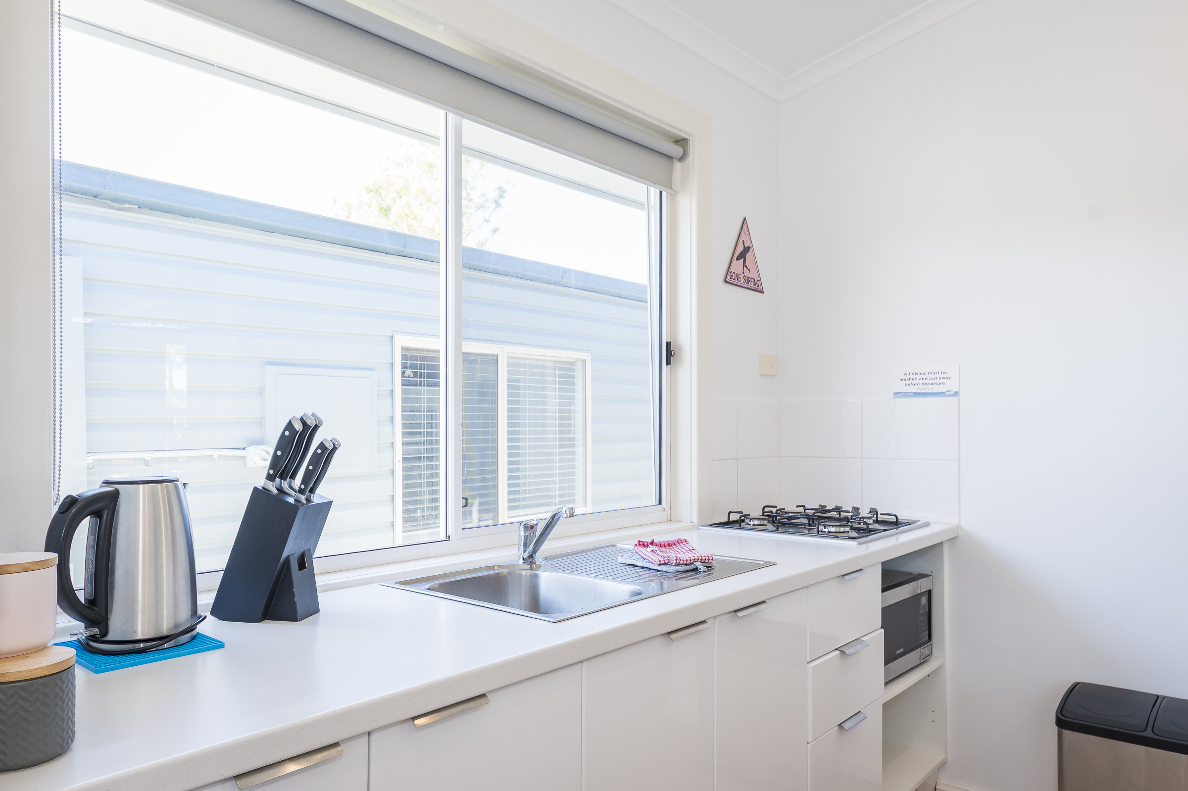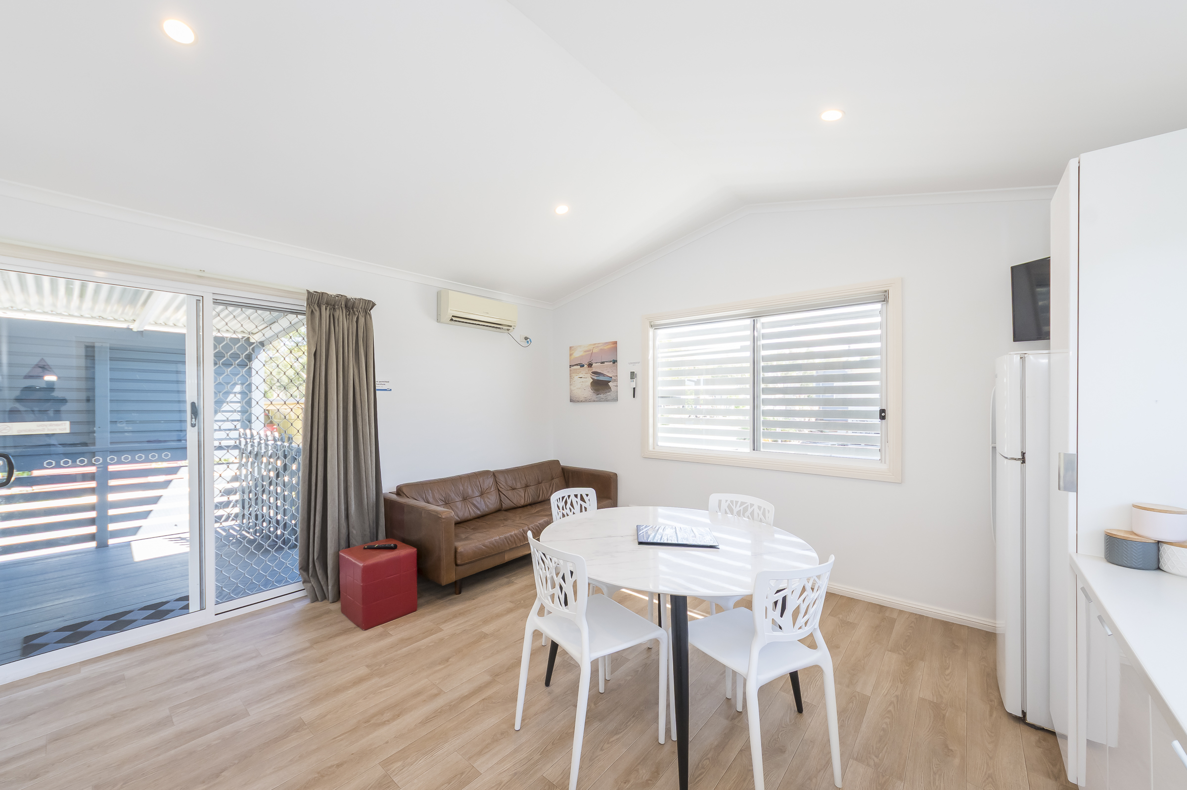 It features a fully equipped kitchen with a microwave, gas cooktop, fridge/freezer, kettle, toaster, and all the necessary cooking utensils. The spacious air-conditioned lounge and dining area, along with the large covered outdoor verandah, provide great spots to unwind together. The main bedroom has a queen-size bed, while the second bedroom includes a set of single bunks. The compact bathroom has a shower and vanity, and a separate toilet is located nearby.