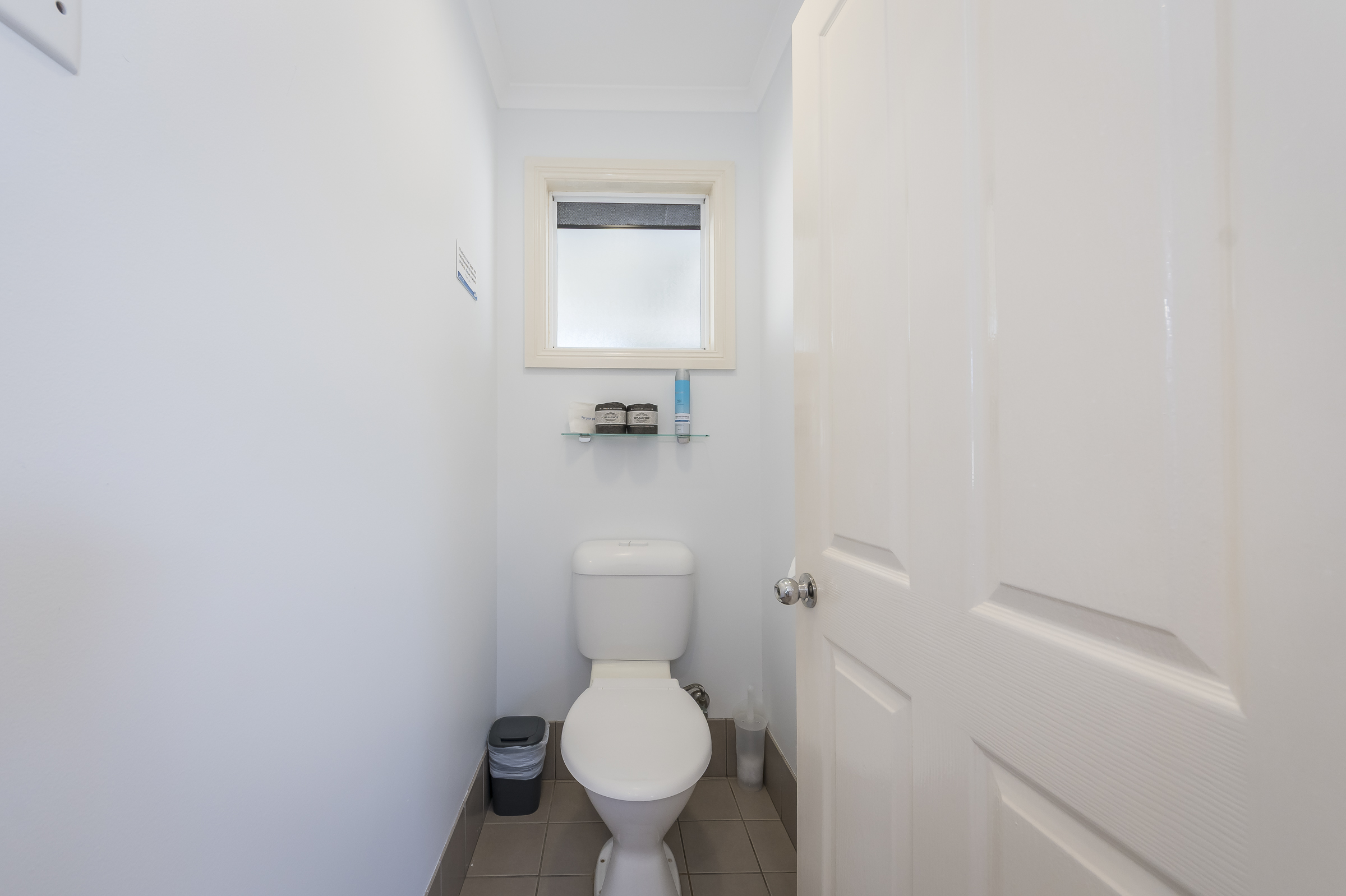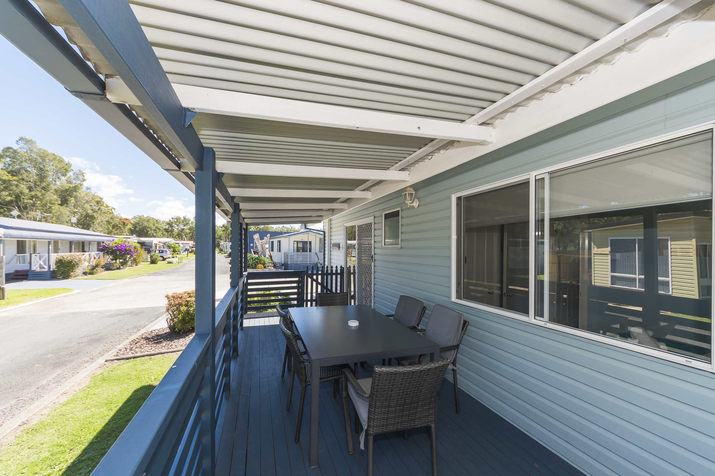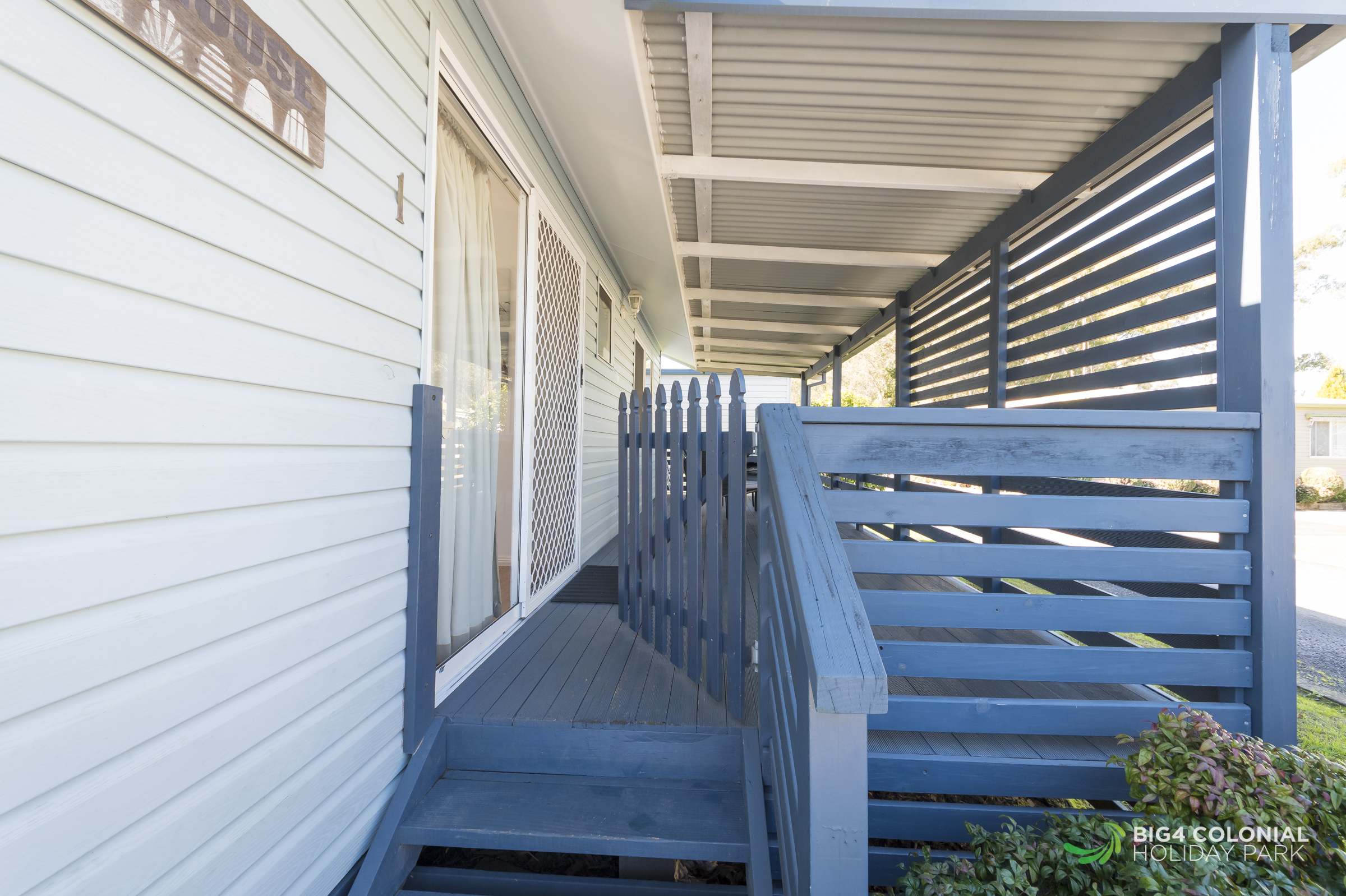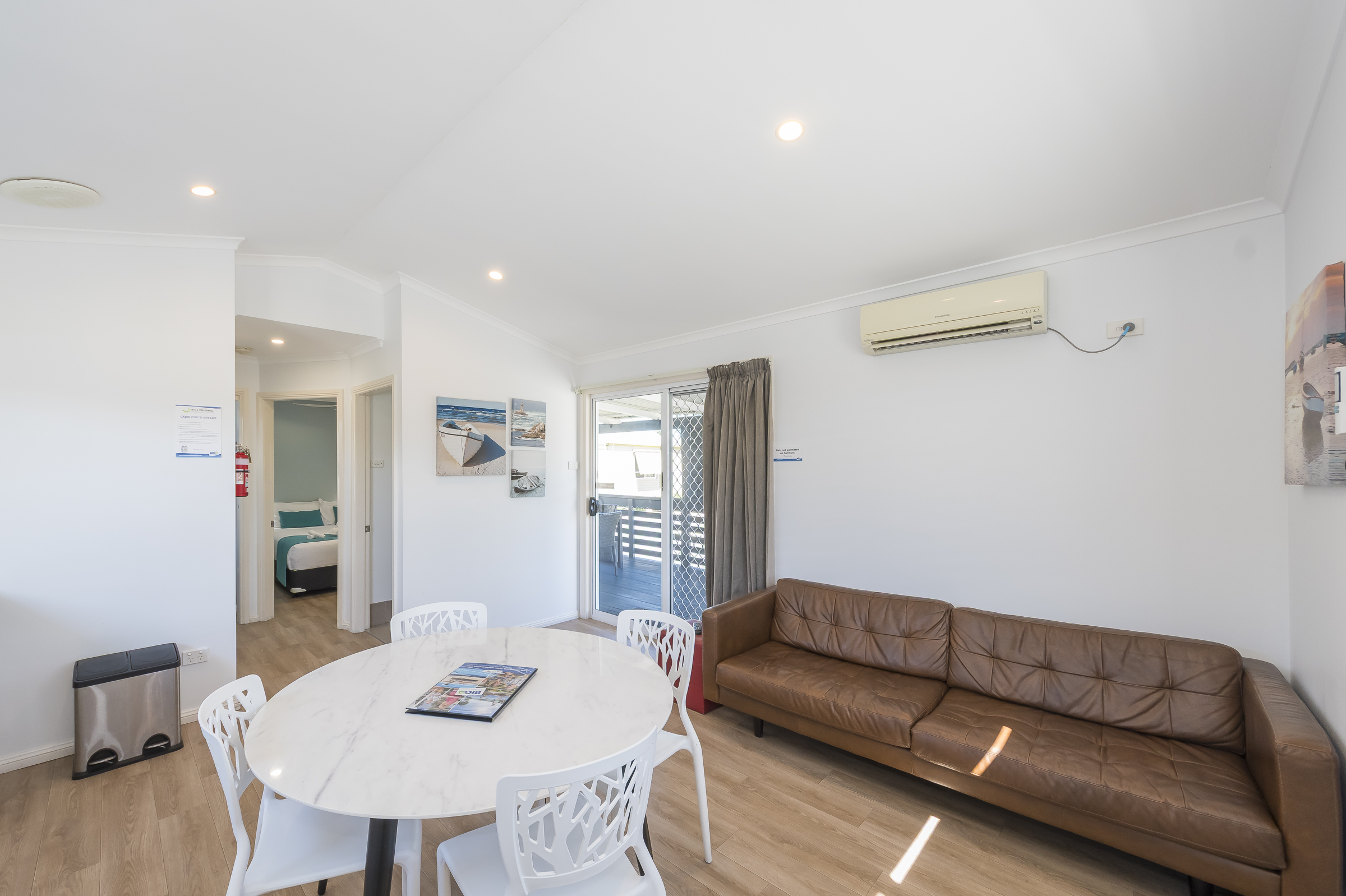 It features a fully equipped kitchen with a microwave, gas cooktop, fridge/freezer, kettle, toaster, and all the necessary cooking utensils. The spacious air-conditioned lounge and dining area, along with the large covered outdoor verandah, provide great spots to unwind together. The main bedroom has a queen-size bed, while the second bedroom includes a set of single bunks. The compact bathroom has a shower and vanity, and a separate toilet is located nearby.