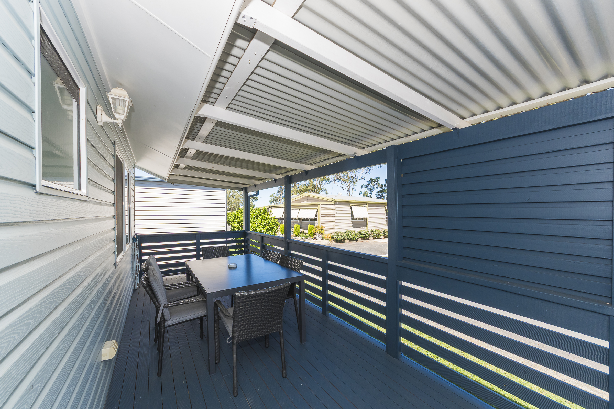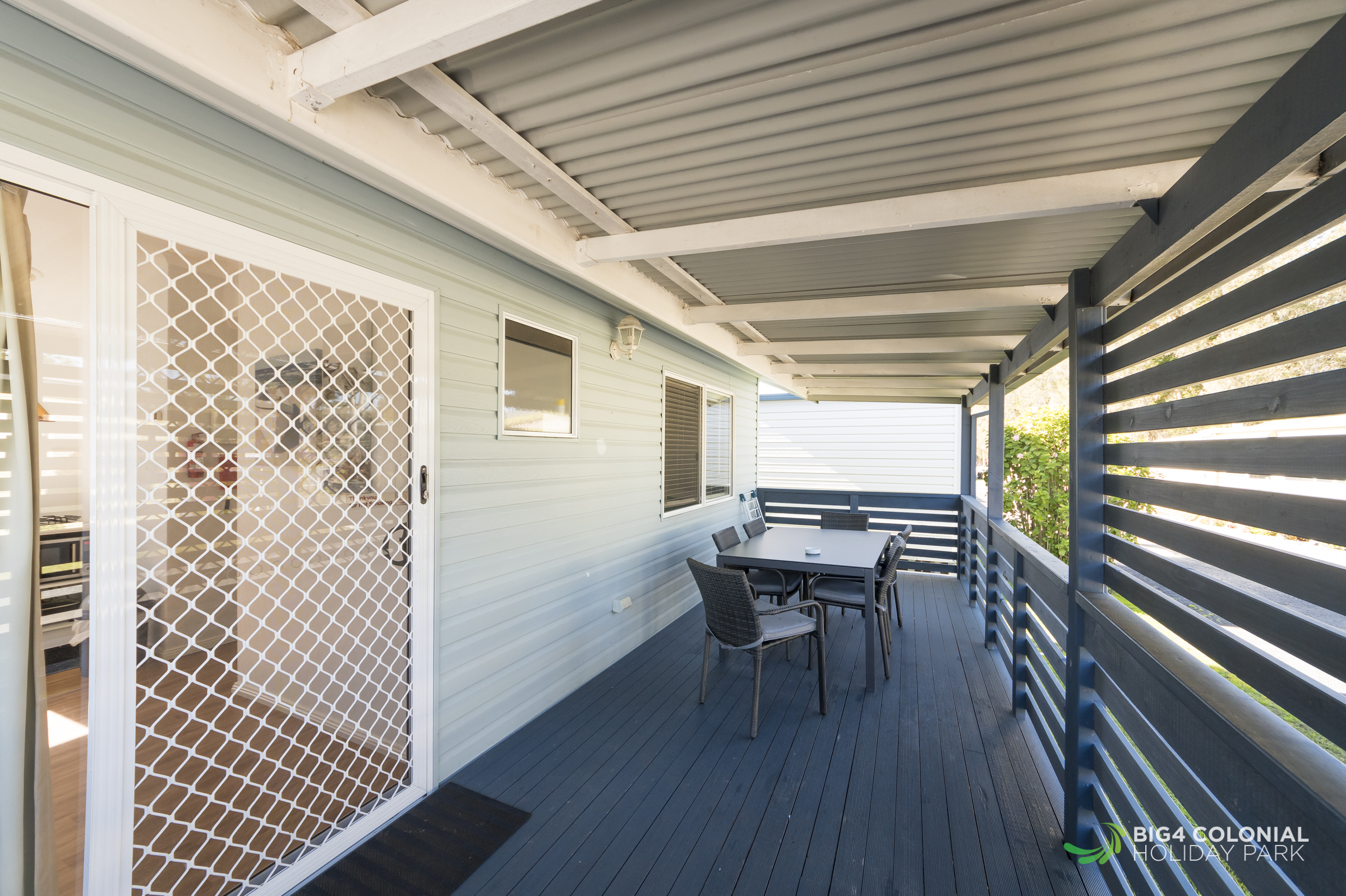 The generous covered verandah includes a table and chairs for alfresco dining and is gated to keep dogs and small children safe. There’s a parking space right next to the cabin for one vehicle.
