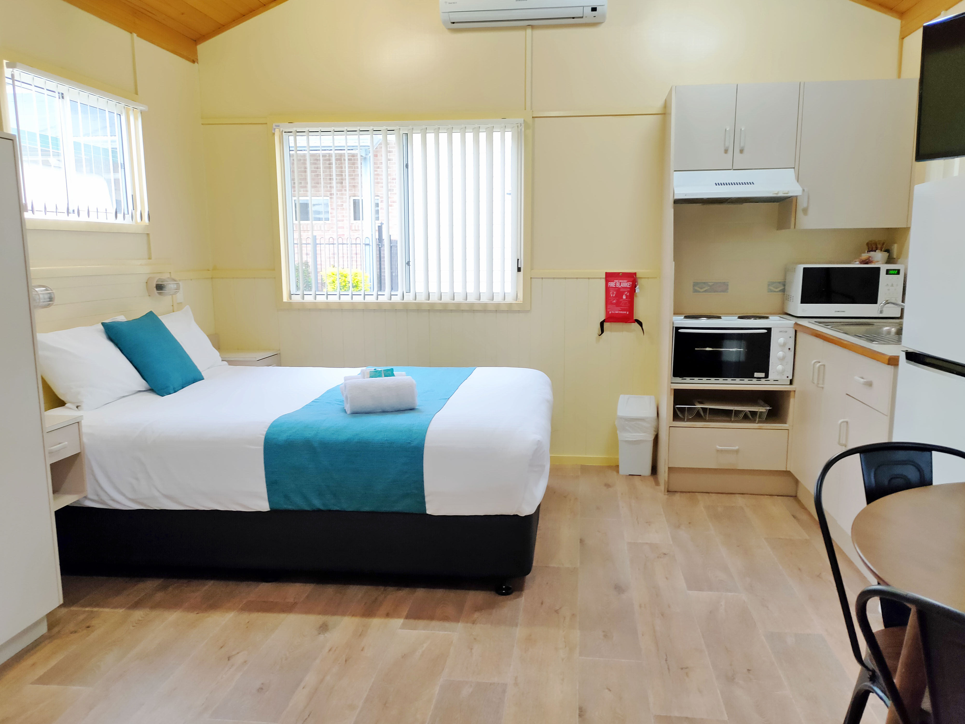 Ideal for couples or small families, this compact one-bedroom studio sleeps up to four with a queen bed in the open-plan area and single bunk in a separate room.