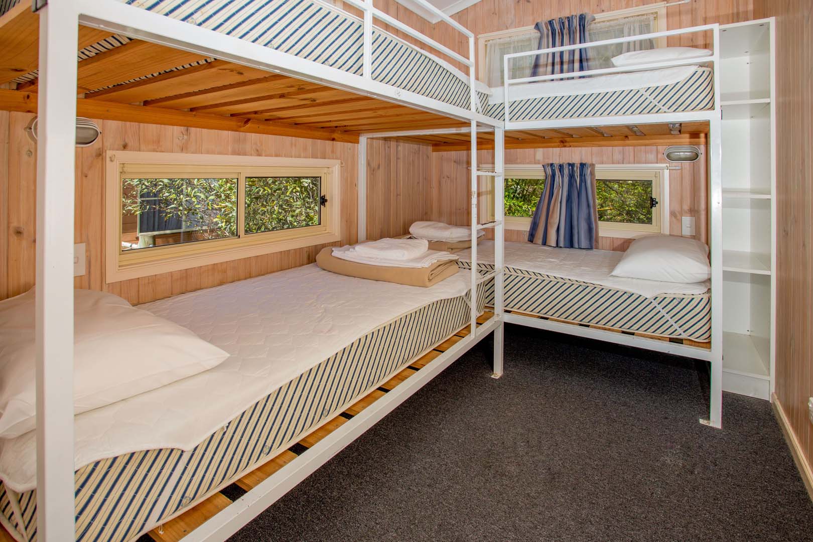 Perfect for families, this two-bedroom cabin sleeps up to five with a queen bed and two sets of single bunks.