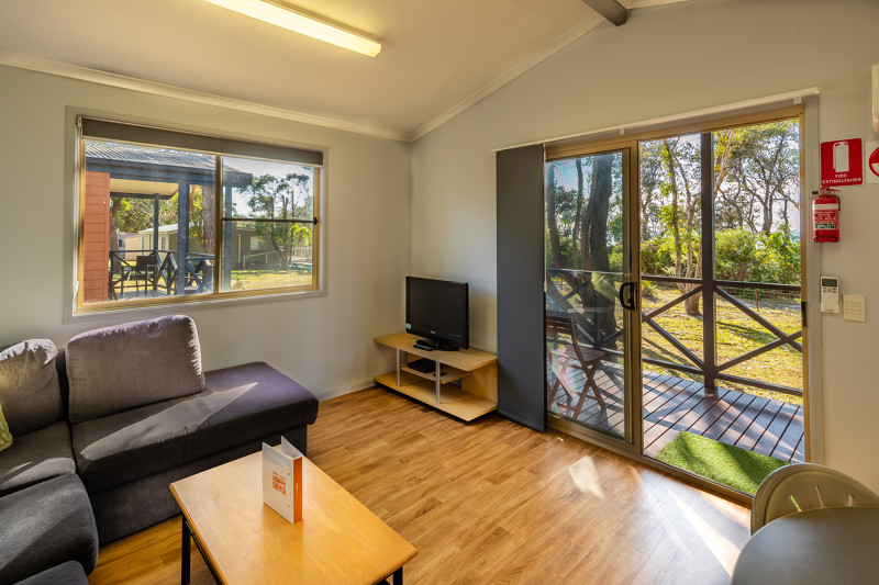 Stay amongst a bush landscape with an incredible ocean view. Our Ocean View Spa Cottage sleeps up to four guests with a queen bed in the main bedroom and a single bed over a double bunk in the second bedroom, as well as a bathroom, living area, kitchenette, and private deck offering a stunning view.