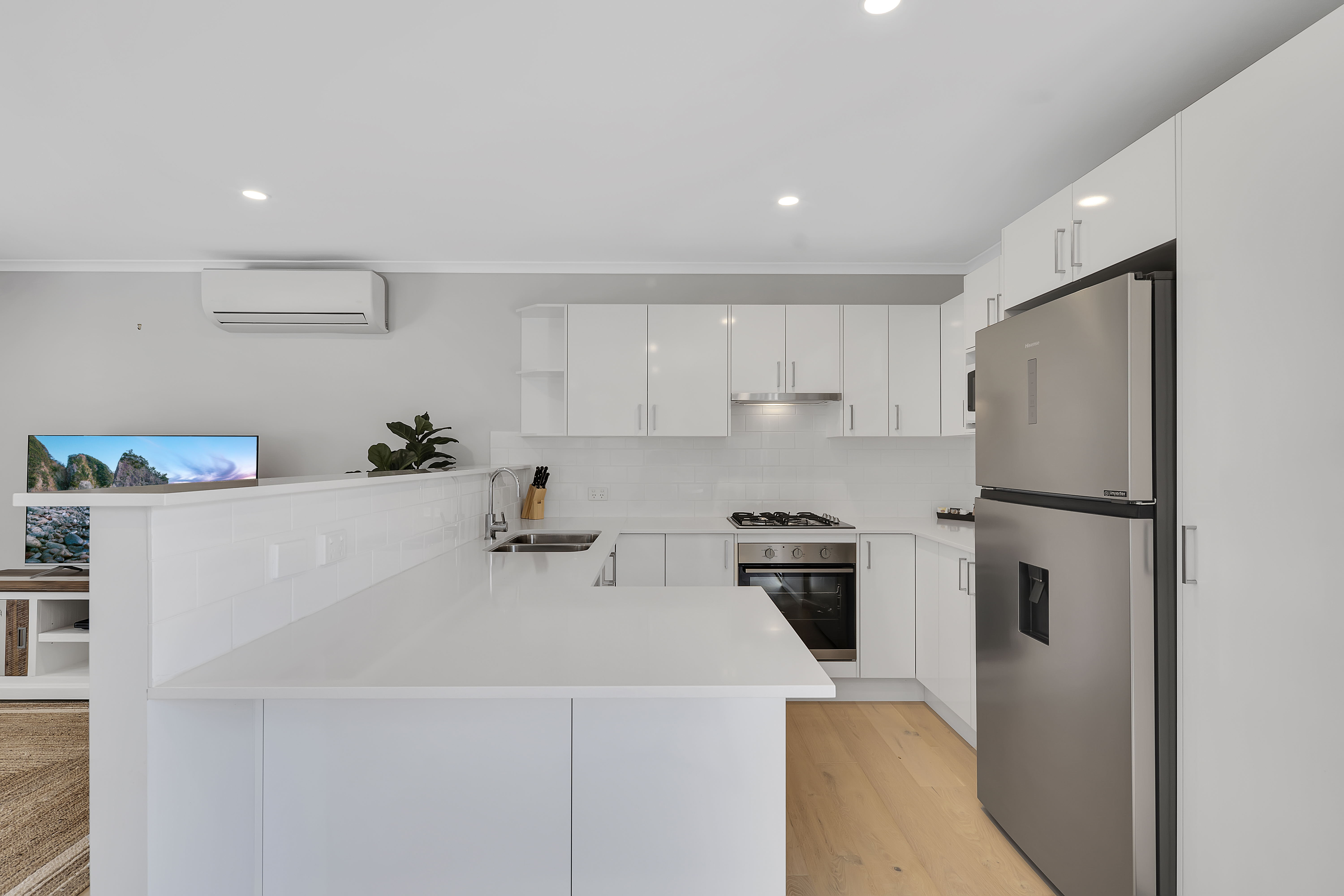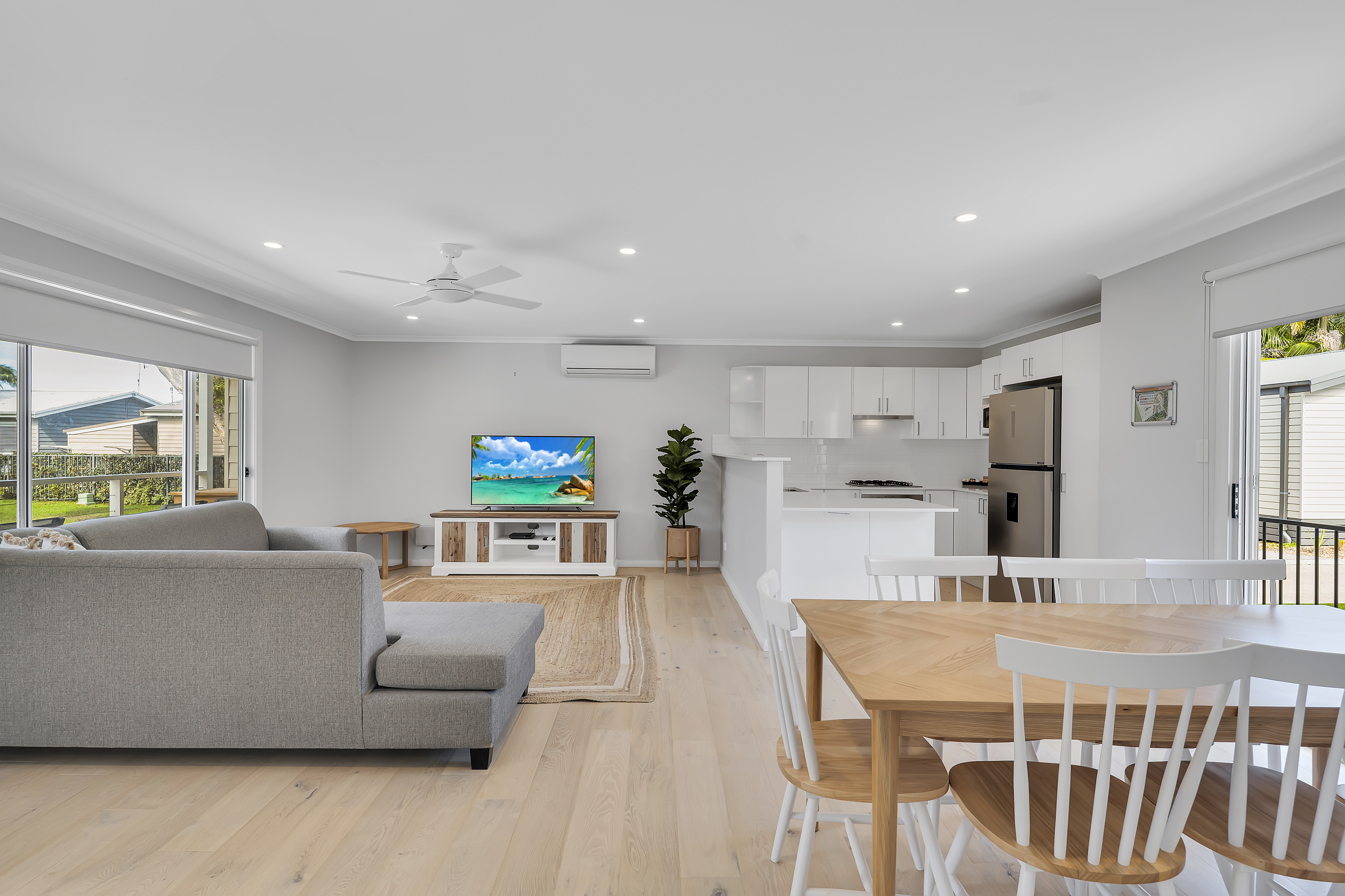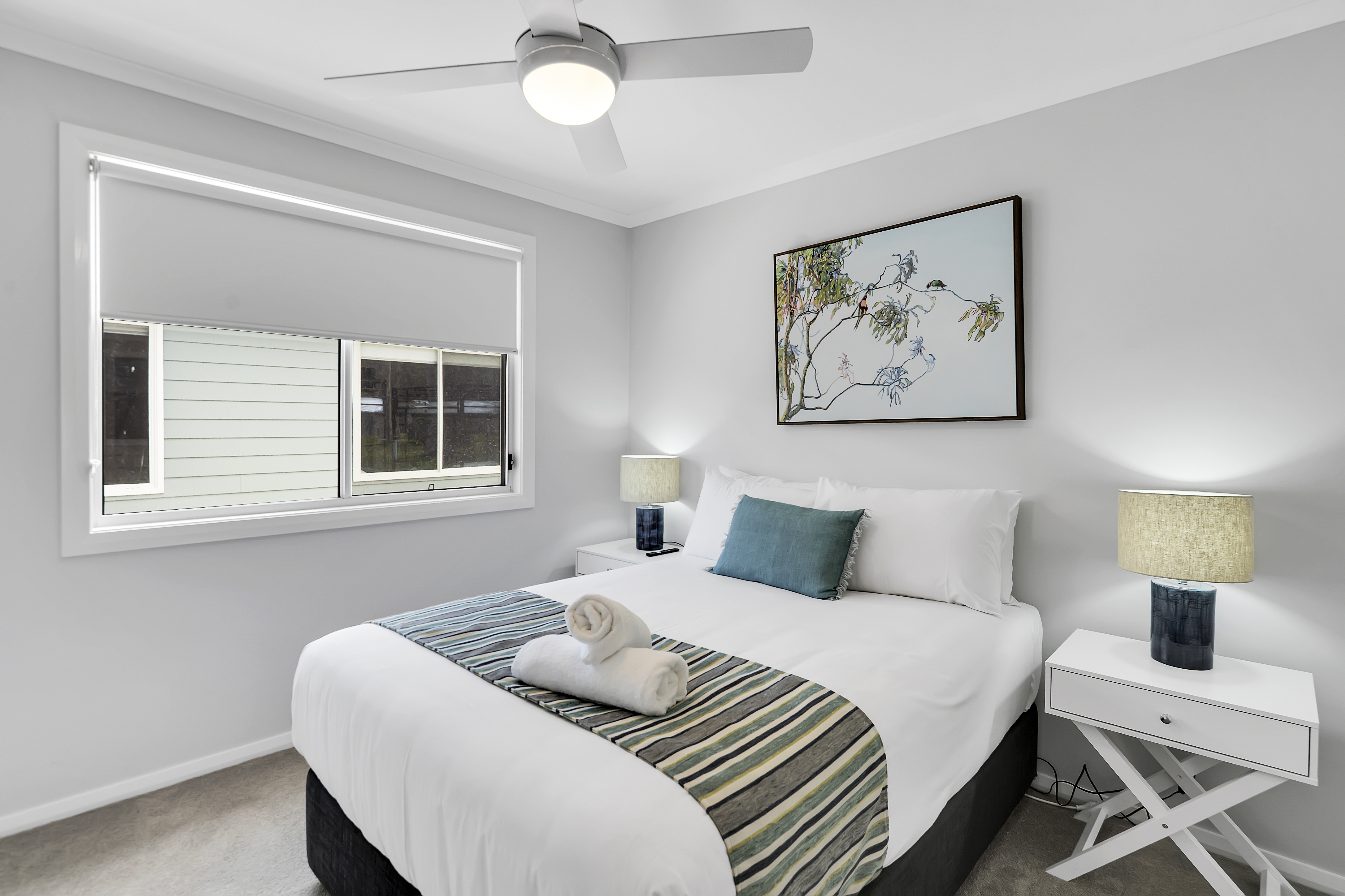 Experience a modern home away from home. Our Paperbark Cabin sleeps up to eight guests with a queen bed in the main bedroom, a double bed in the second bedroom and two bunks in the third bedroom, as well as a bathroom, separate second toilet, living area, kitchen, internal laundry, and private deck.