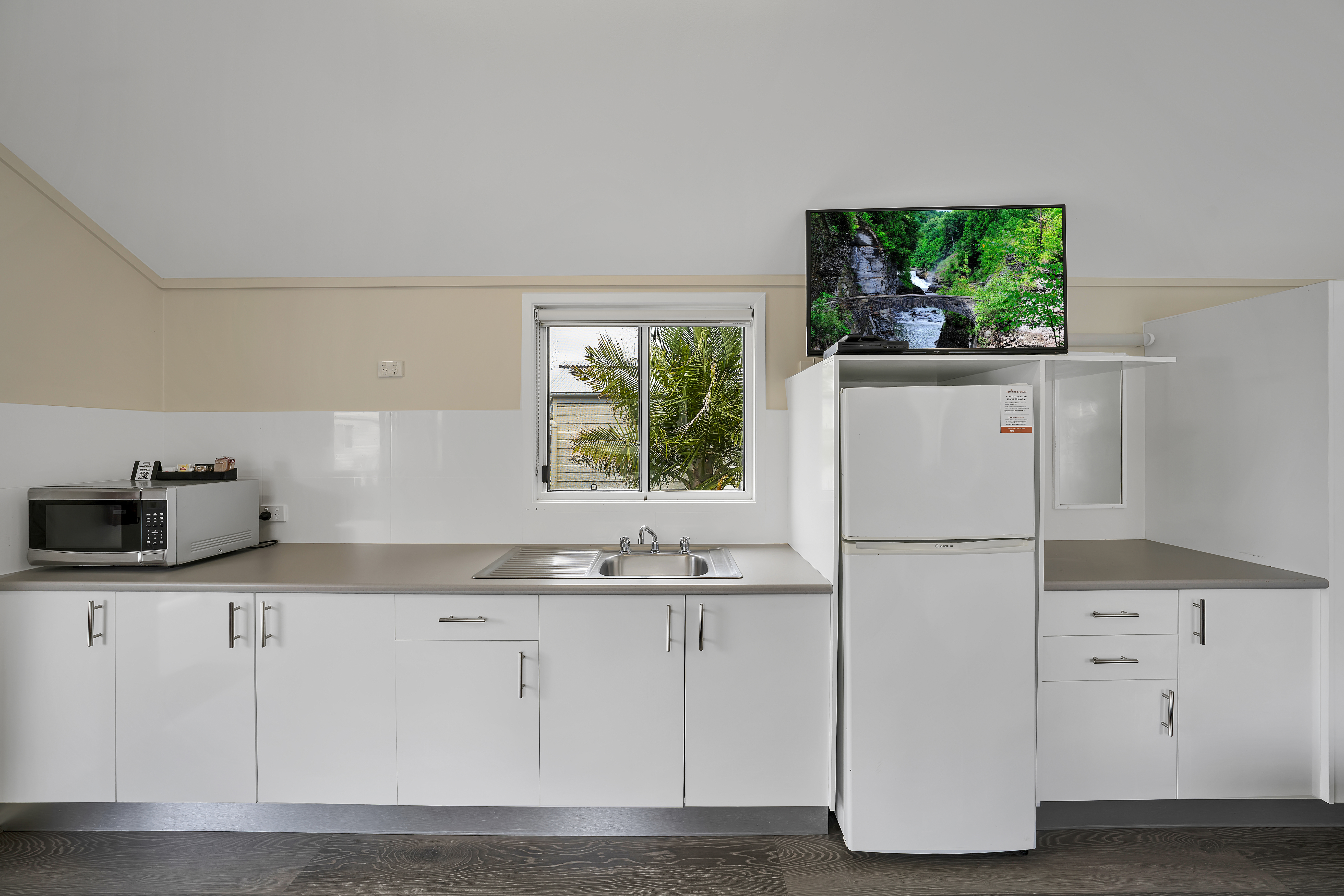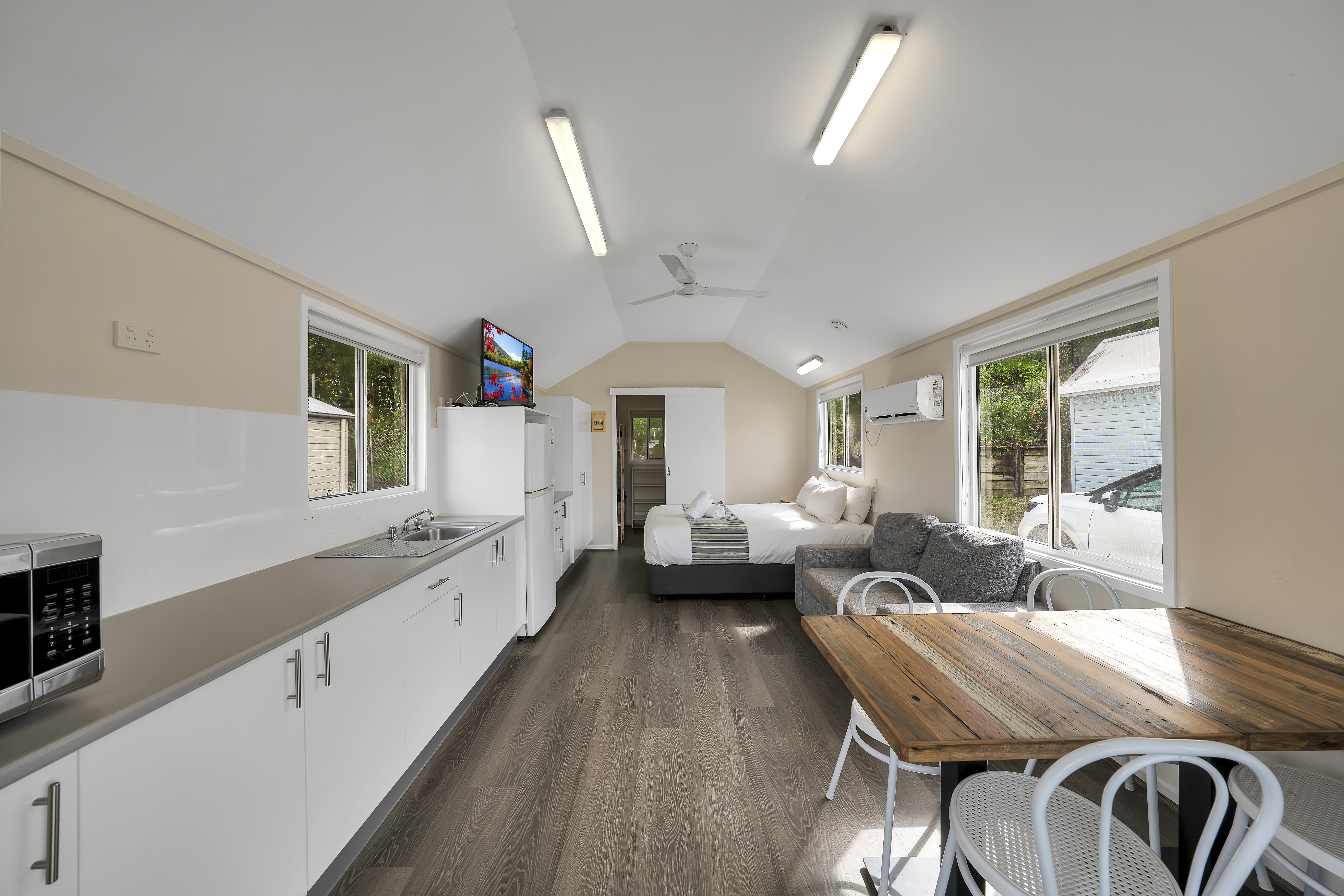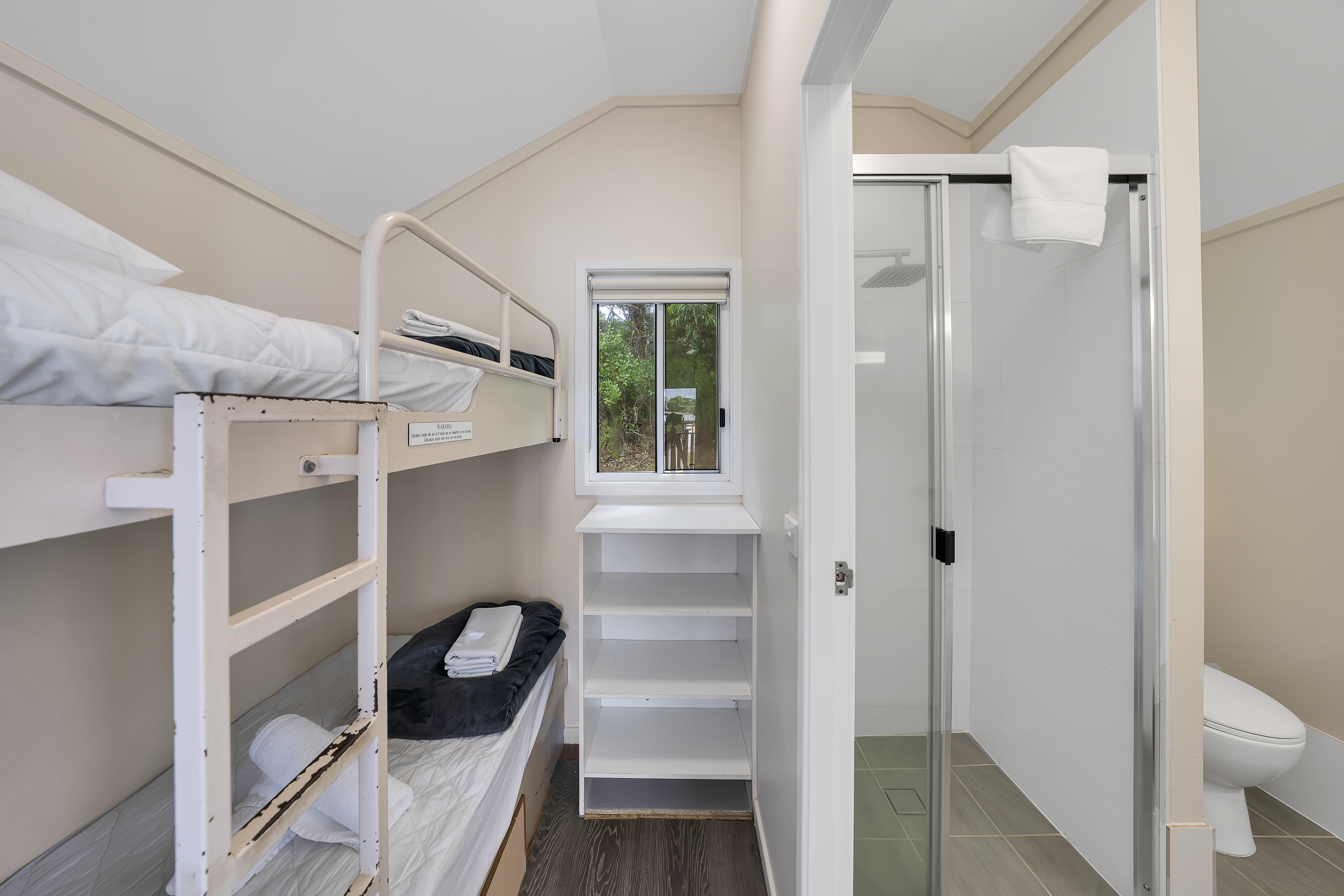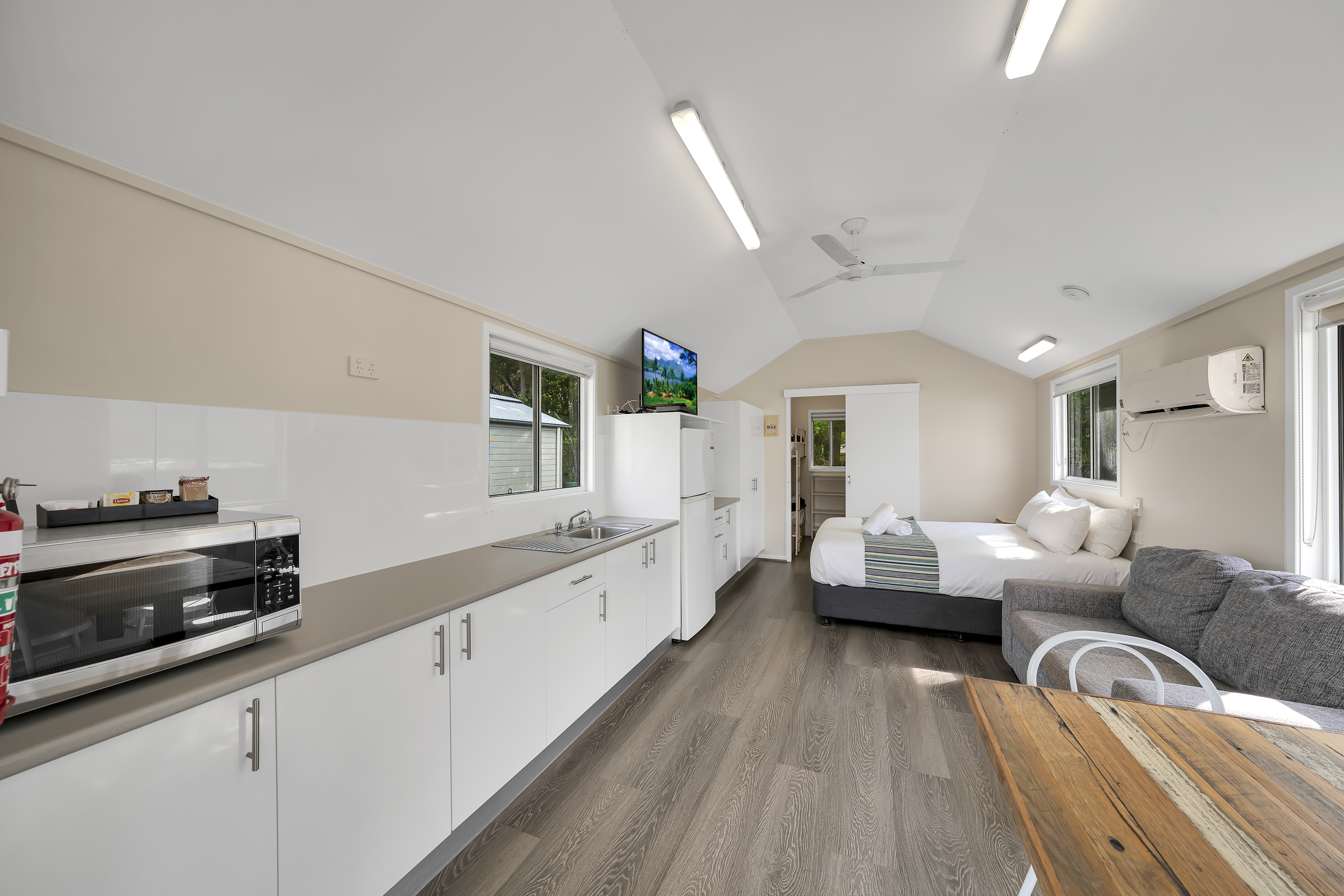 Experience open plan living with added privacy. Our Parkview Cabins sleep up to two adults and two children, with a queen bed in the open plan space and a bunk and ensuite in the separate bedroom, as well as a kitchenette, living area, and private deck.