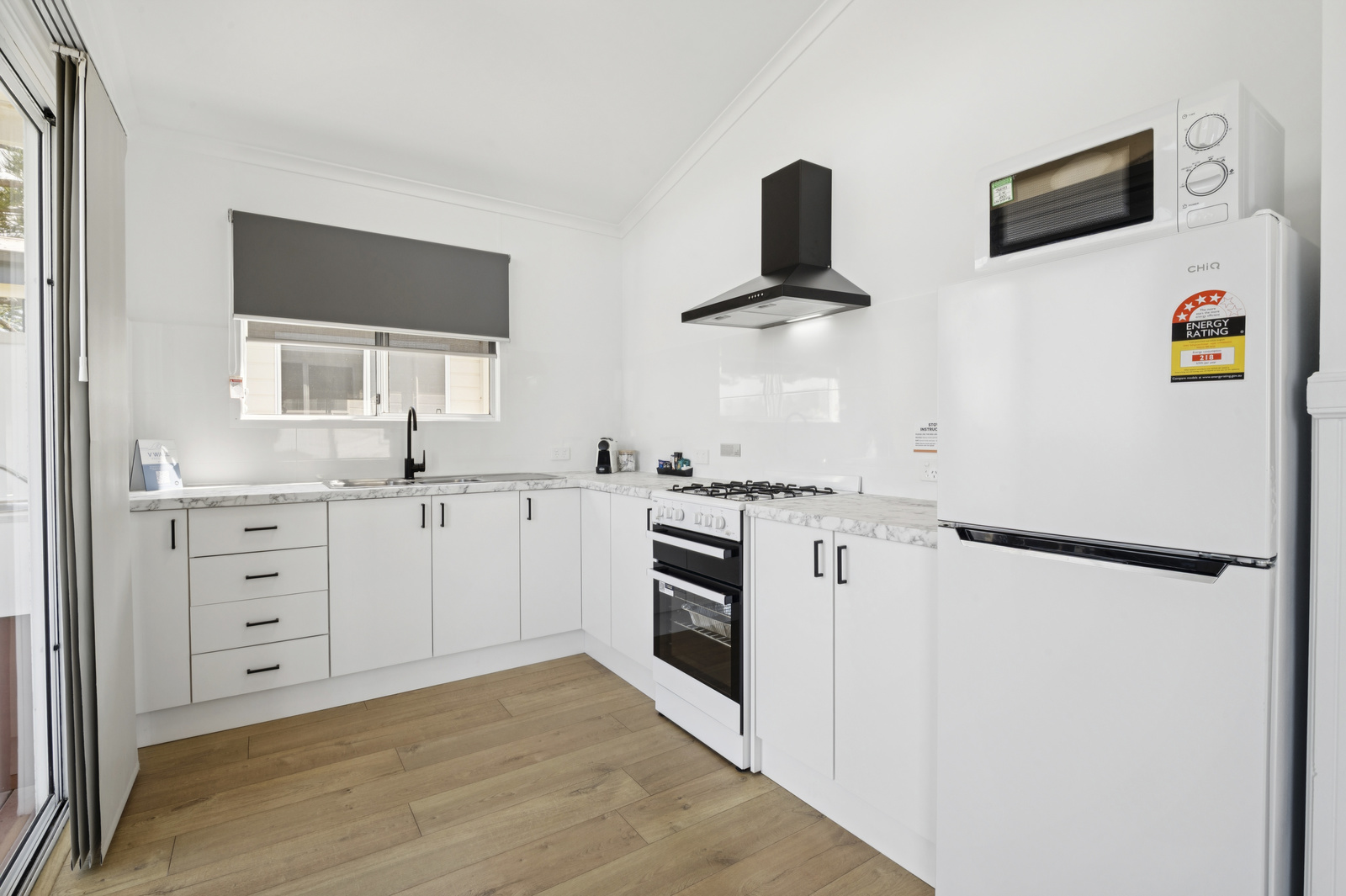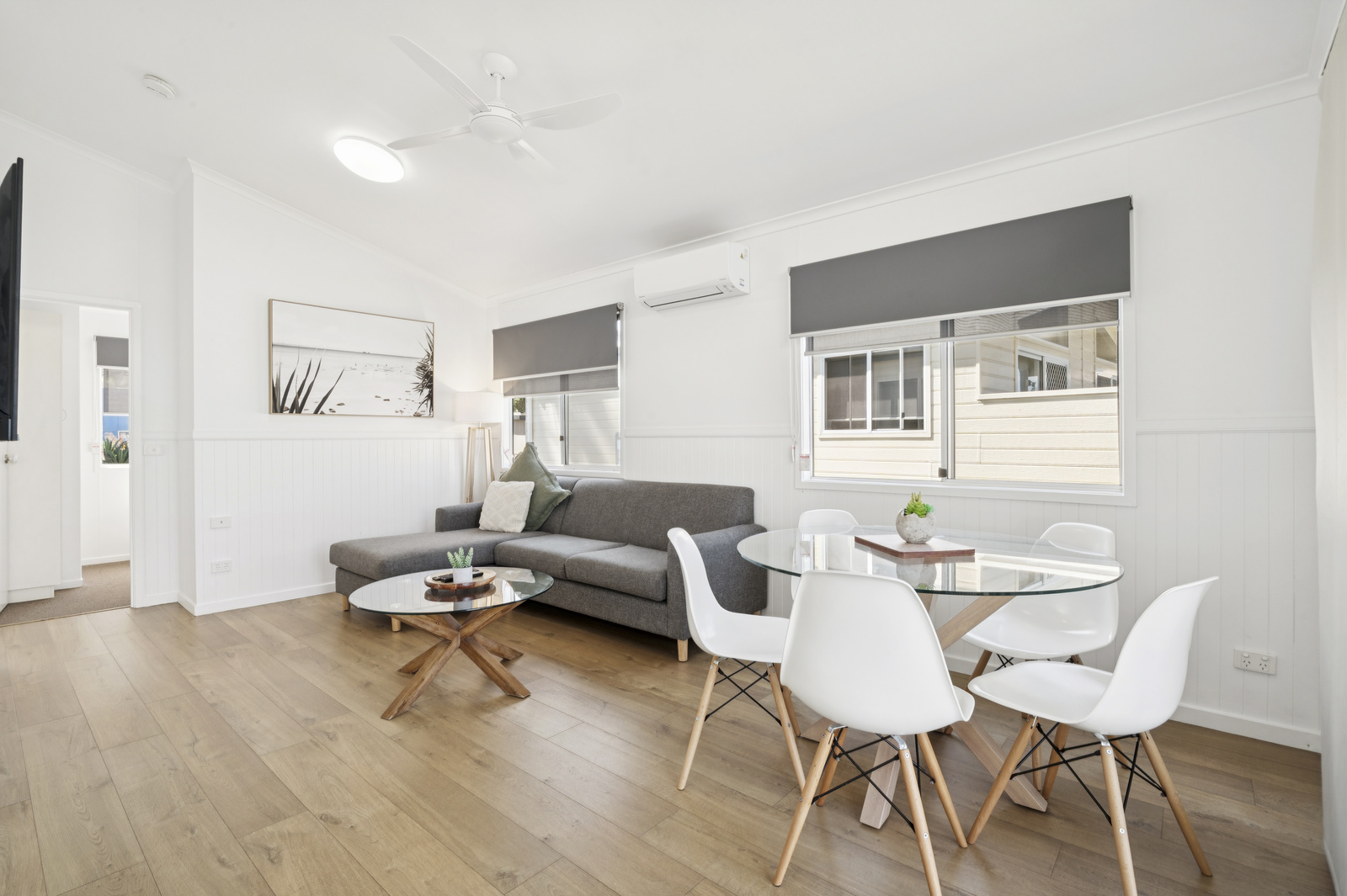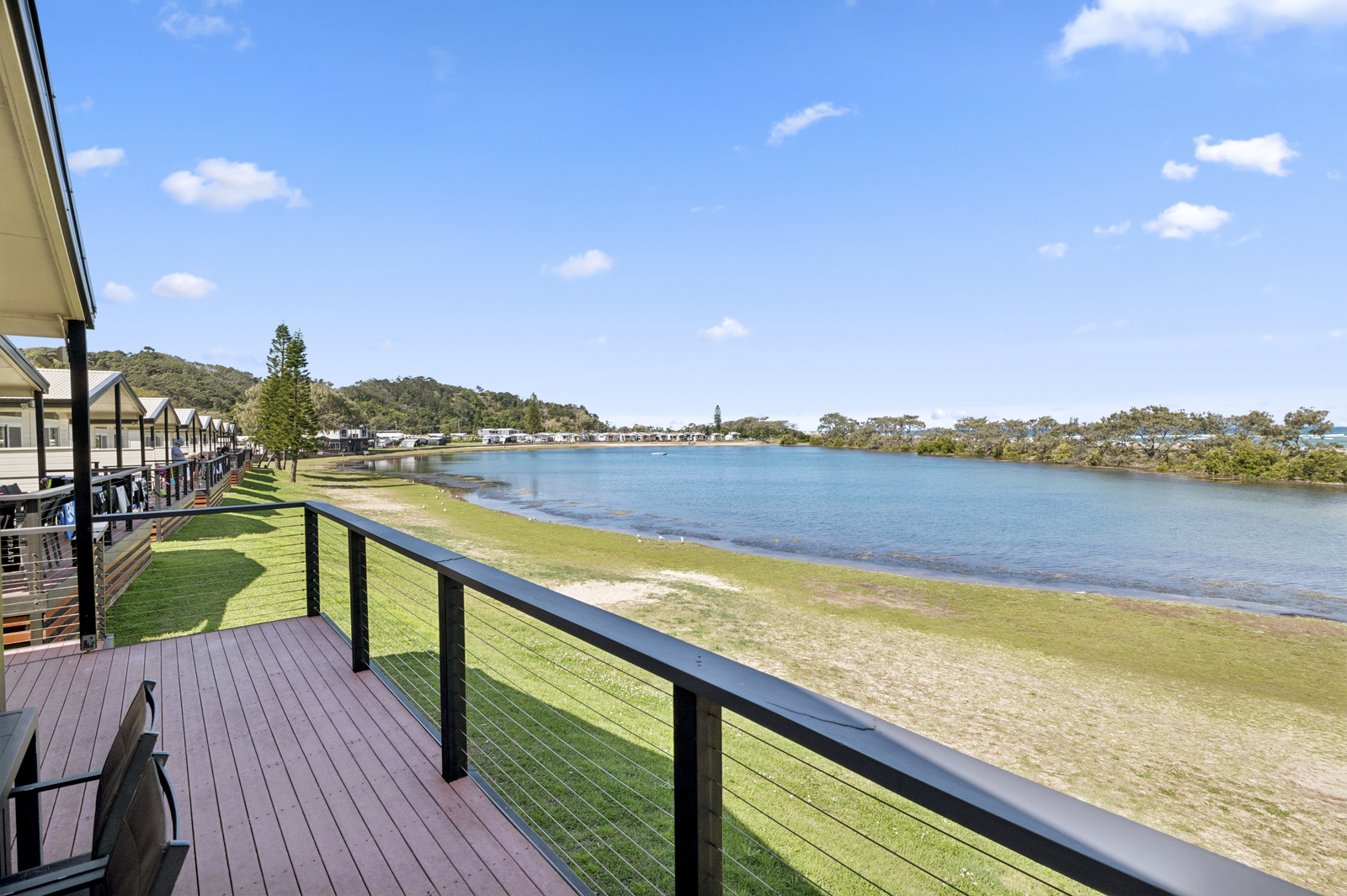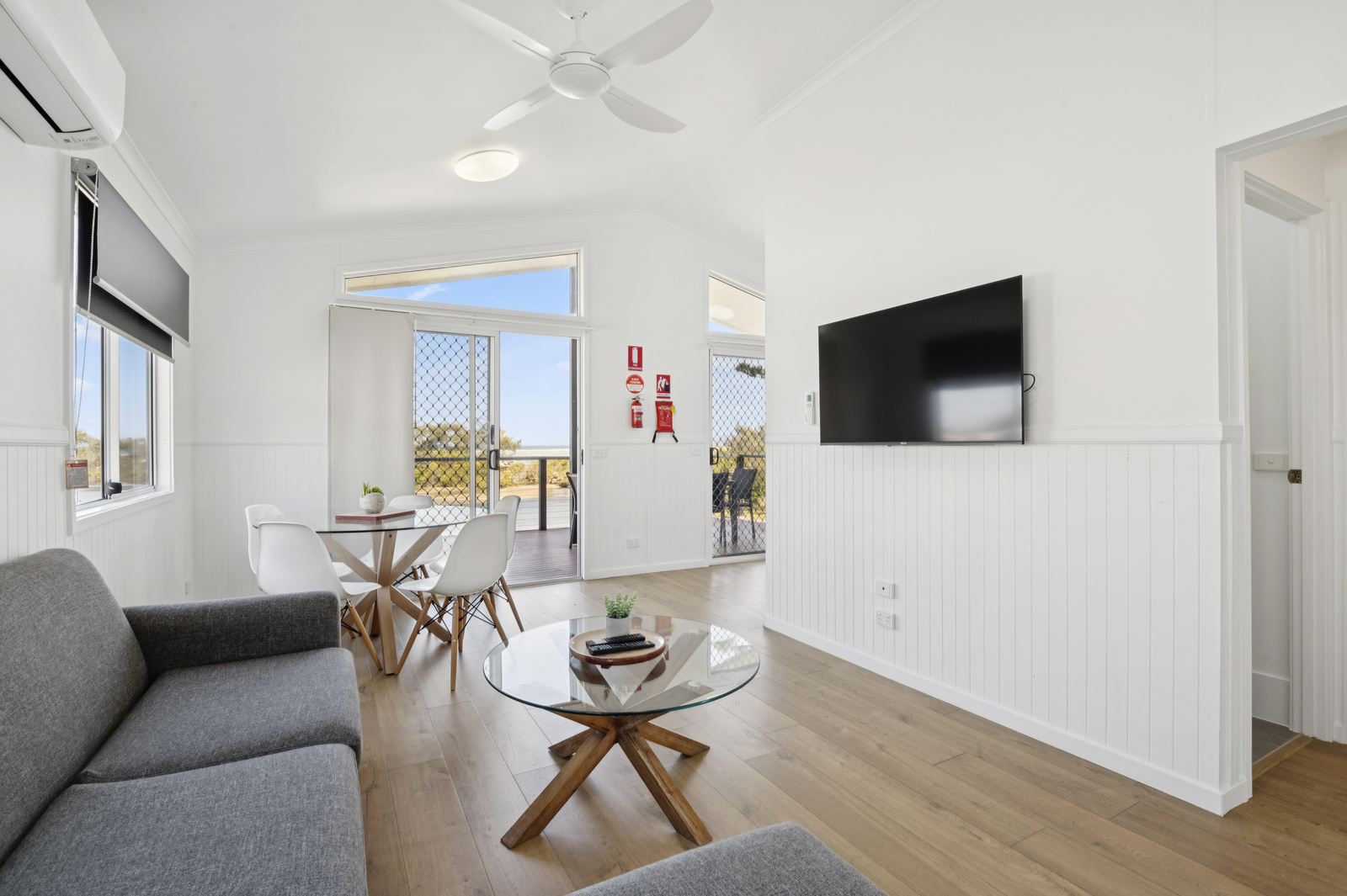 Experience a relaxing and luxurious stay on the waterfront. Our Waterfront Deluxe Spa Cabin sleeps up to five guests with a queen bed in the main bedroom and a bunk plus single bed in the second bedroom, as well as a bathroom with corner spa, living area, kitchen and private deck with spectacular water views.