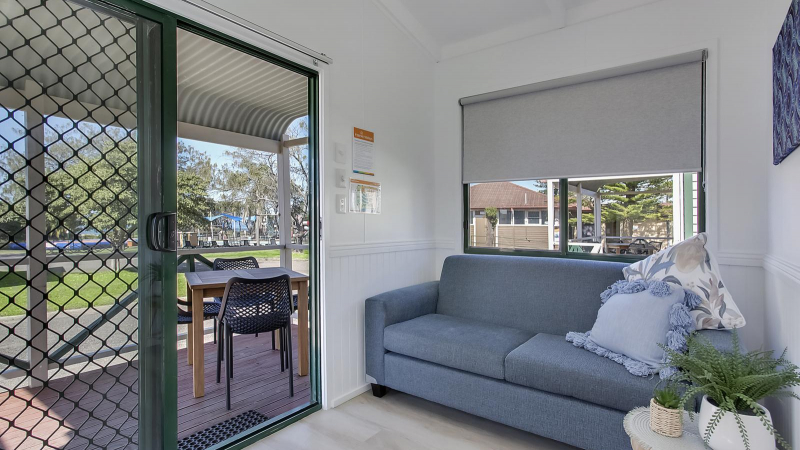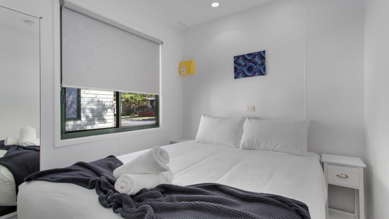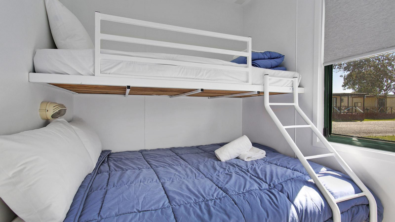 Stay in spacious comfort. Our 2 Bedroom Standard Cabins sleep up to four guests with a double bed in the main bedroom and a bunk in the second bedroom, as well as a bathroom, living area, kitchen, and private deck.