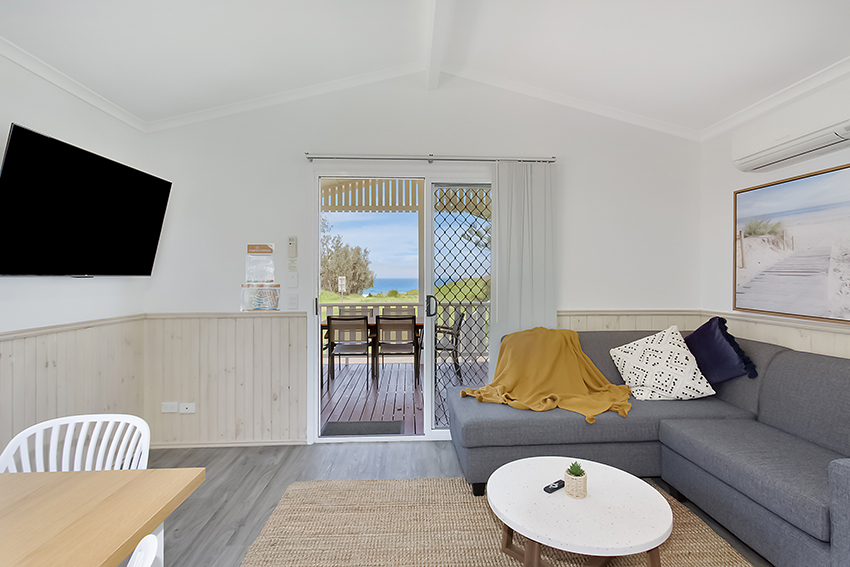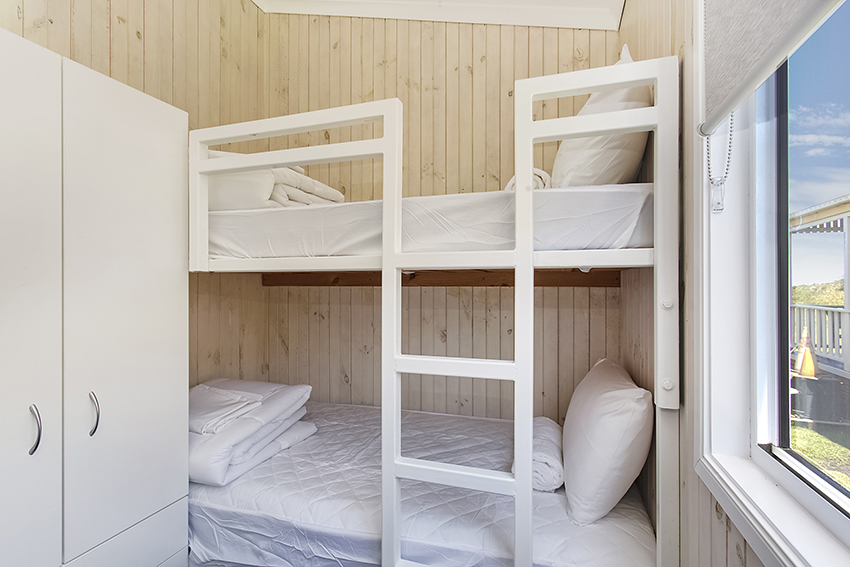 Stay in a bright and relaxed villa. Our 2 Bedroom Surf Villa sleeps up to six people with a queen bed in the main bedroom and two bunks in the second bedroom, as well as a bathroom, living area, kitchen, and private deck.