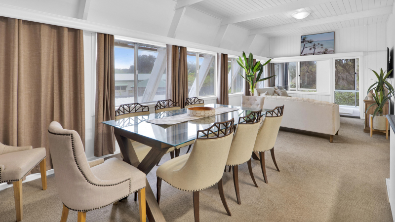 Experience luxe coastal living only metres from the beach in this bright and modern home away from home. Our Beach House sleeps up to nine people with king beds in two bedrooms and two single beds in each of the other two bedrooms, as well as a bathroom, living area, kitchen, and outdoor entertaining area.