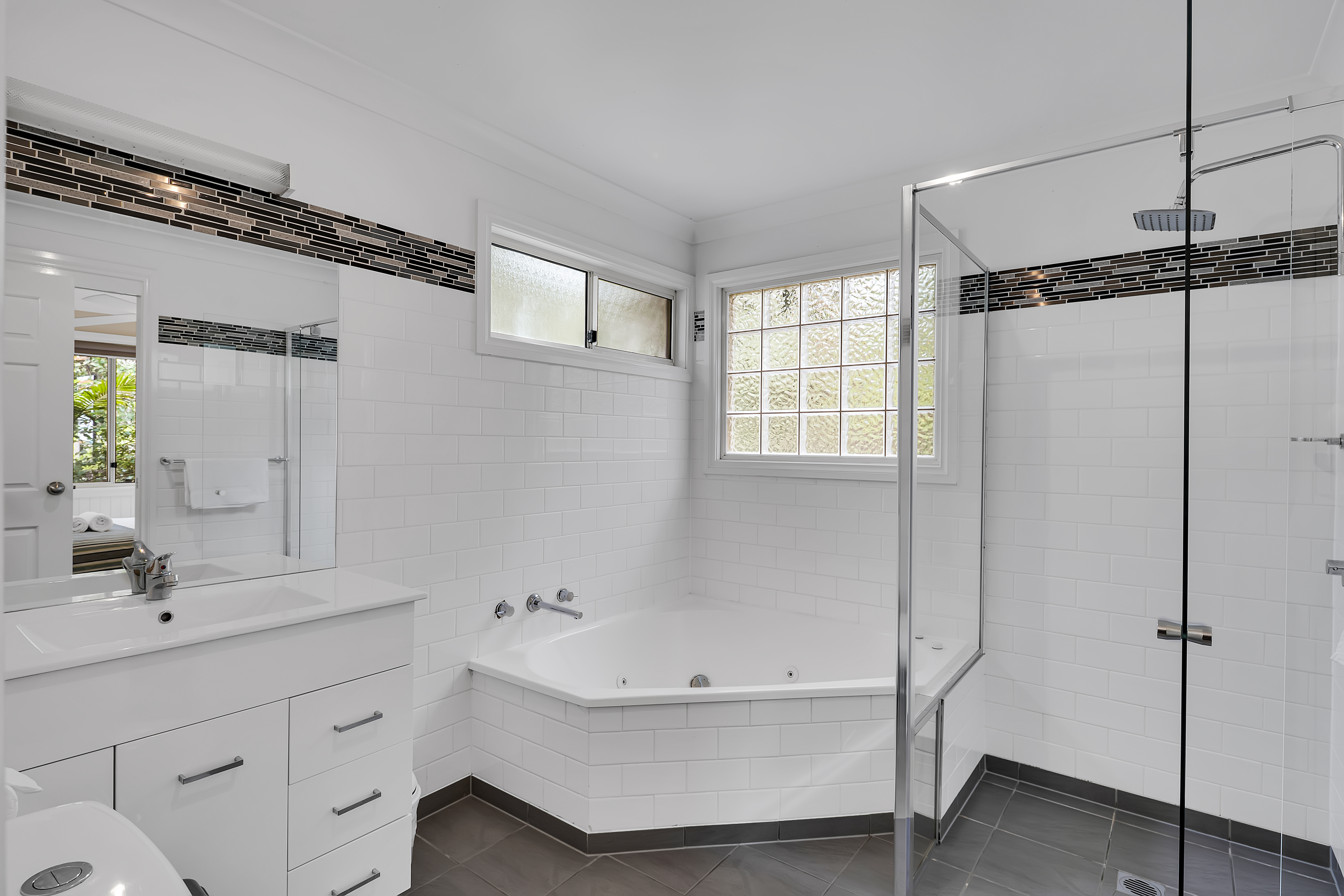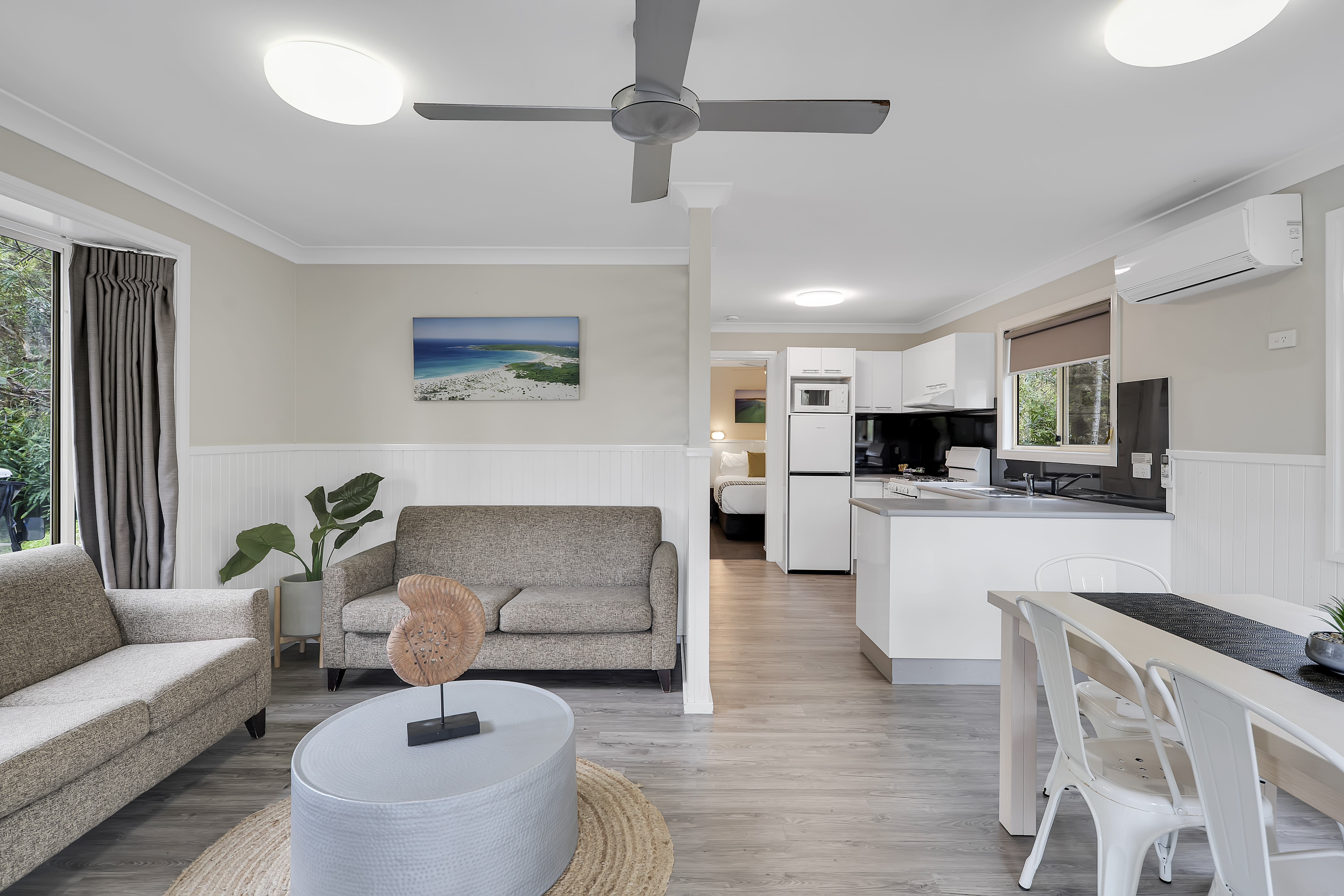 Enjoy the luxuries of modern living. These Spa Cabins sleep up to five guests with a queen bed in the main bedroom, a single over double bunk in the second bedroom and a bathroom with a shower over spa bath, as well as a living area, kitchen, and deck.