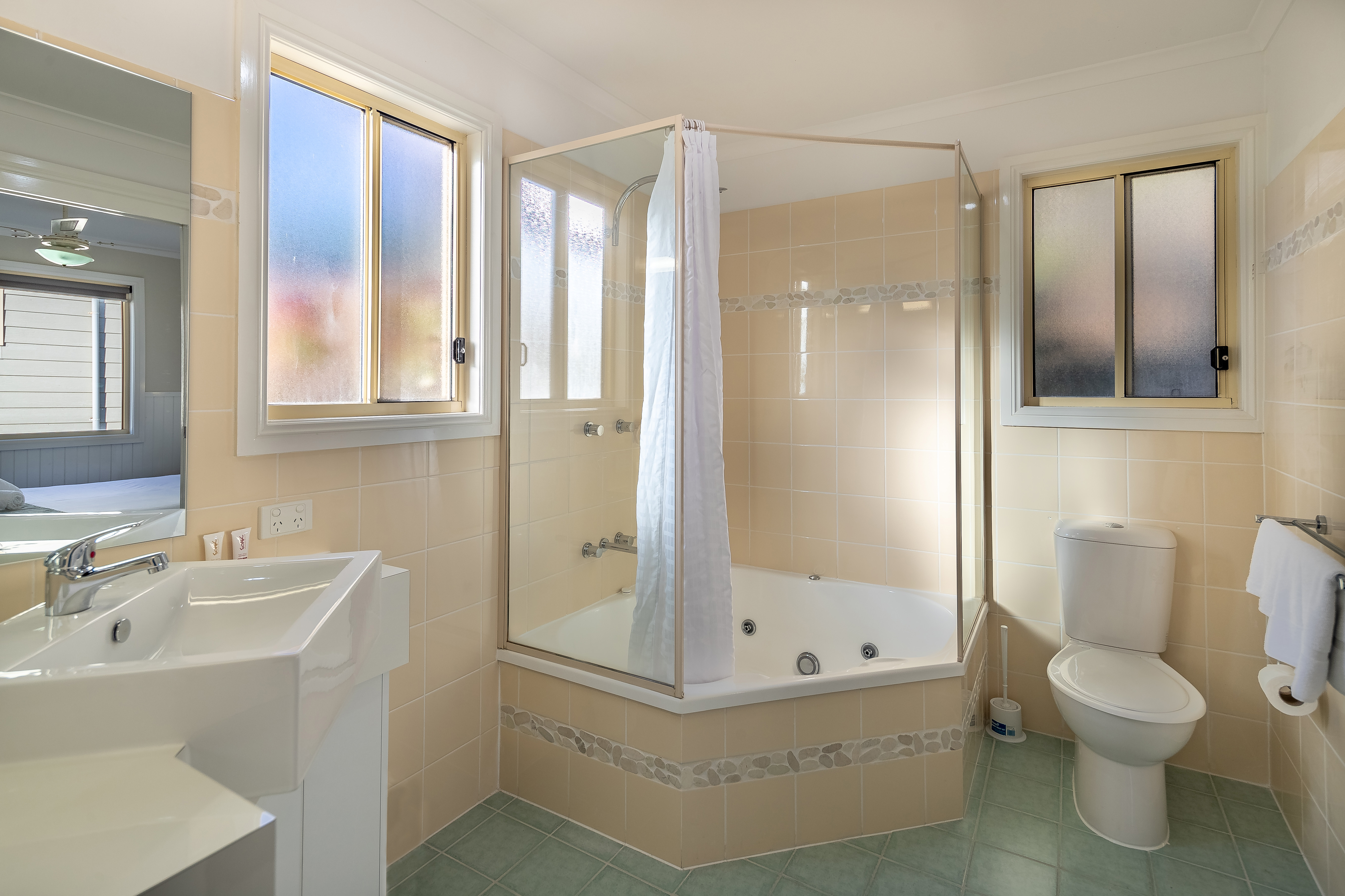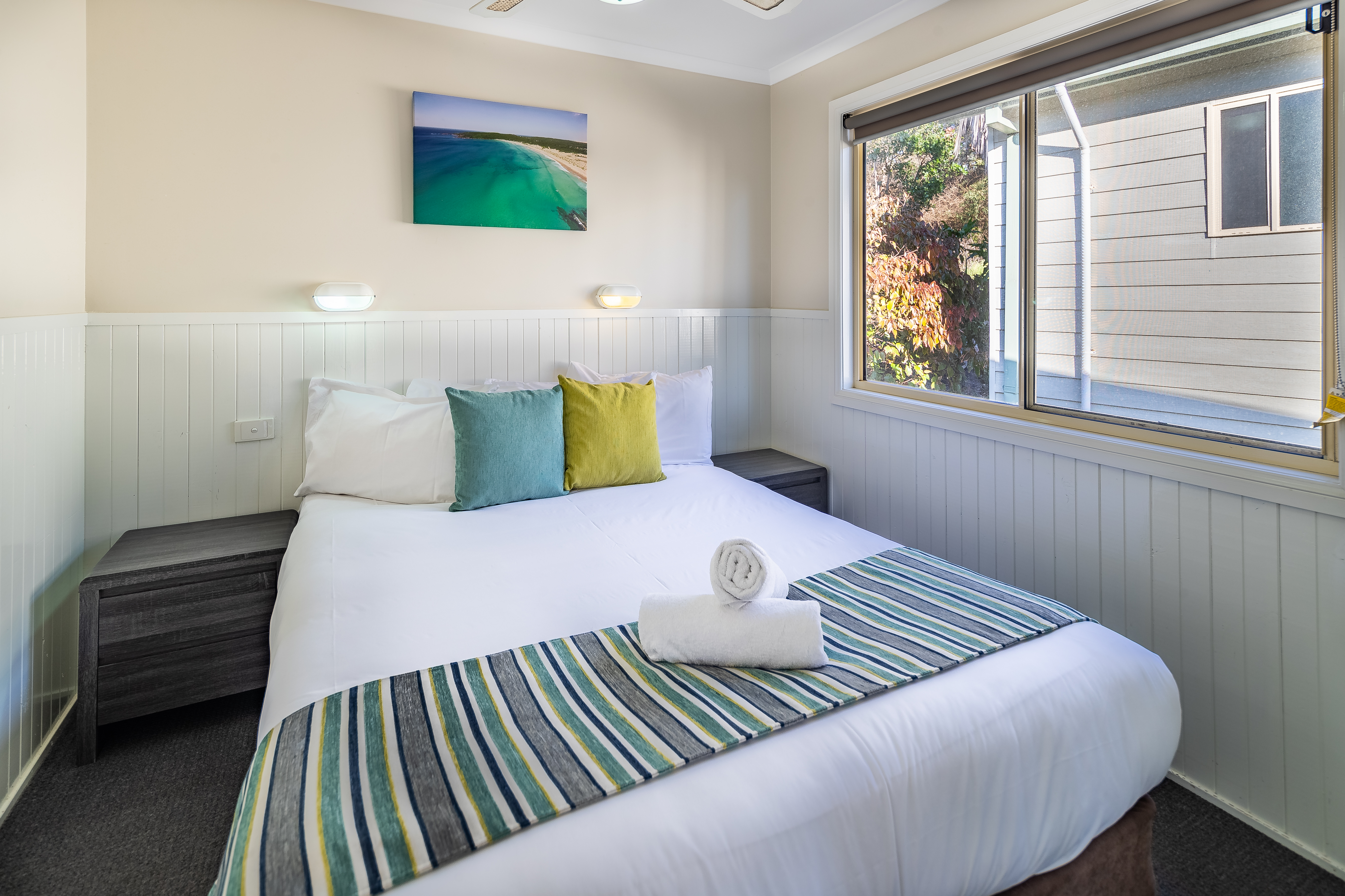 Experience a comfortable stay with a little bit of luxury. These Spa Cabins sleep up to six guests with a queen bed in the main bedroom, two bunks in the second bedroom and a bathroom with a shower over spa bath, as well as a living area, kitchen, and deck.