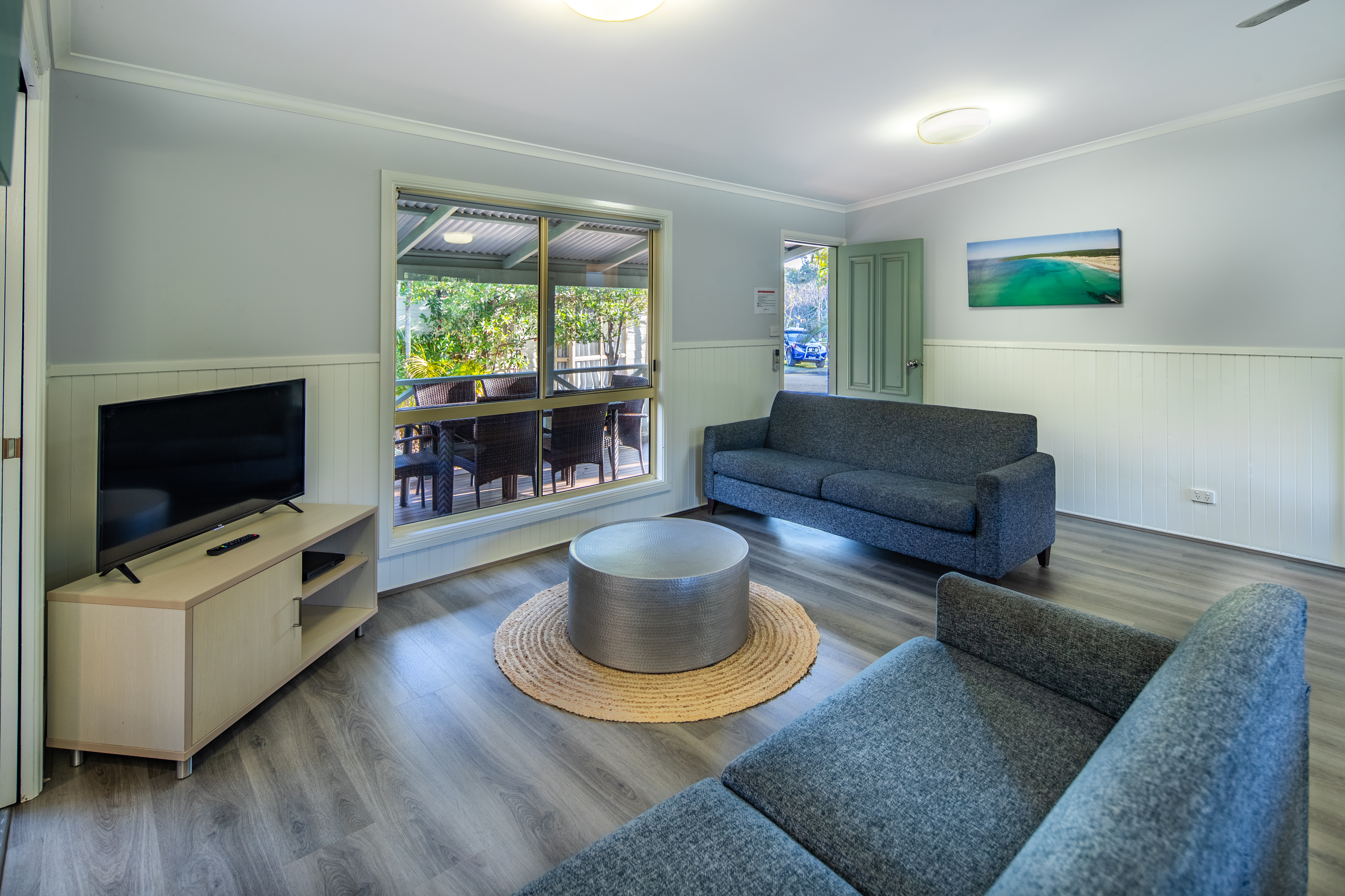 Experience a modern and spacious cabin stay. Our 3 Bedroom Superior Cabin sleep up to eight guests with a queen bed in the main and second bedrooms and two bunks in the third bedroom, as well as a bathroom plus separate toilet, a living area, kitchen, and deck with BBQ.
