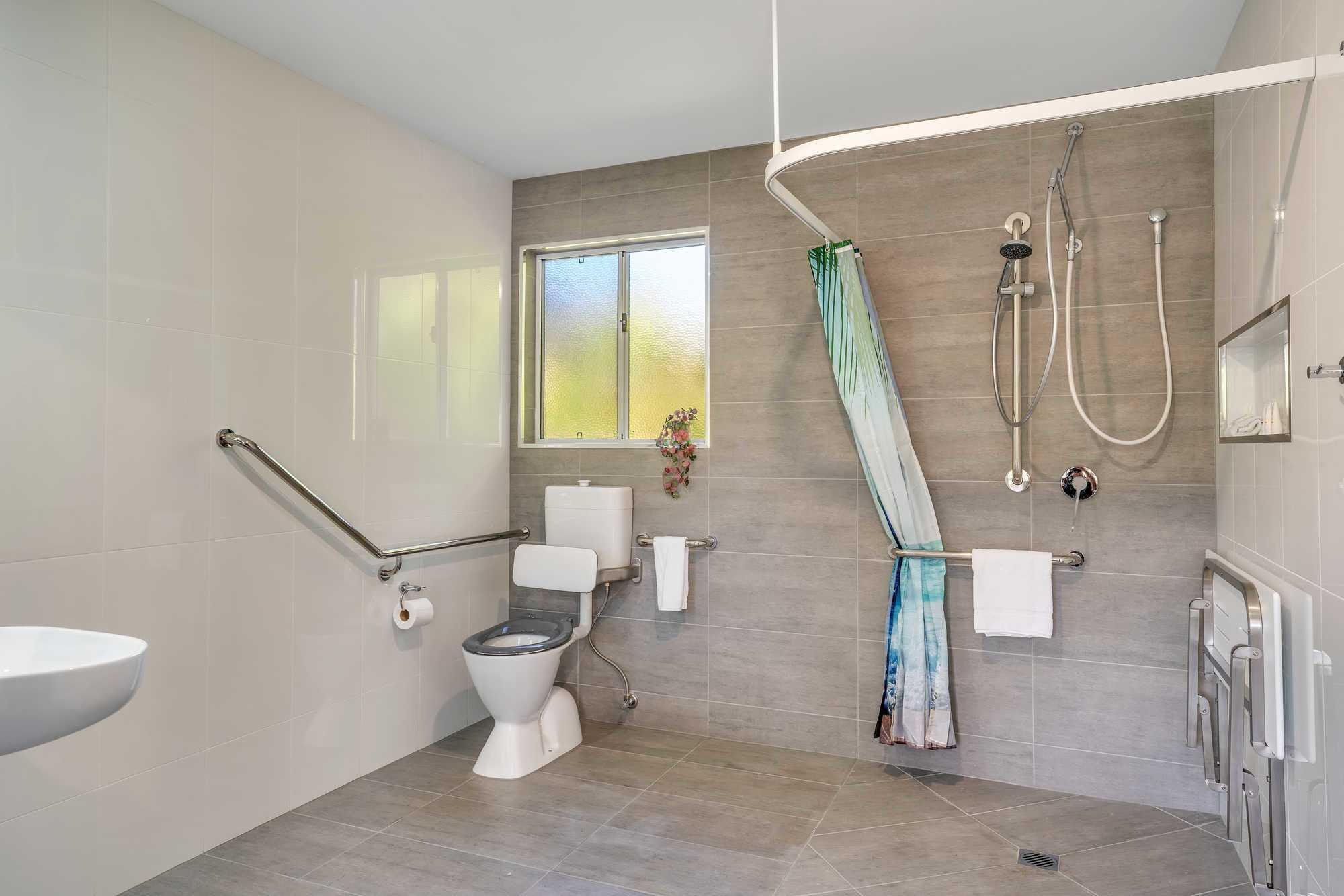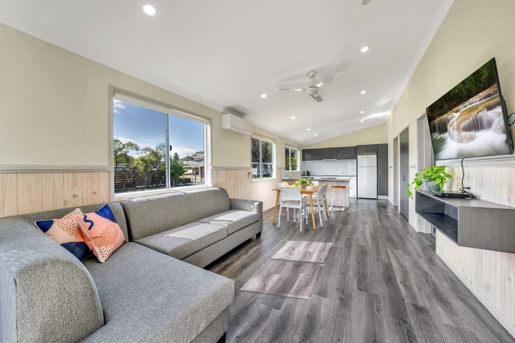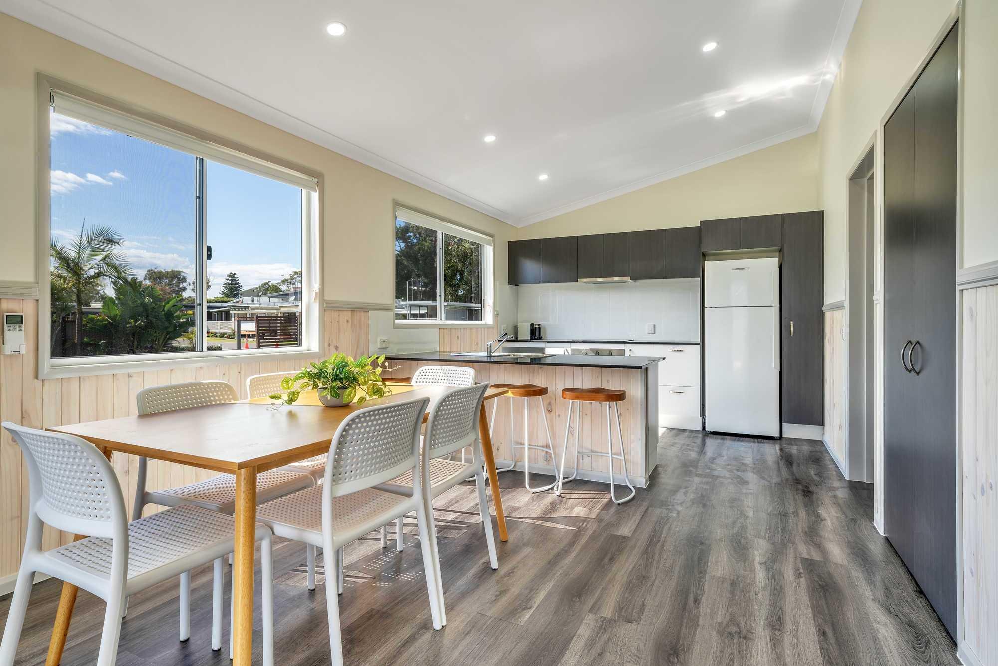 An accessible experience at Soldier's Point, modern and customised for the comfort of guests with access requirements. Our Easy Access Cabin sleeps up to five guests with a queen bed in the main bedroom, as well as a bunk and single bed in the second bedroom. Entry to the villa is via a low-incline access ramp, and the villa features an extra-large bathroom with handrails, wheelchair access and a detachable shower head. Enjoy an open plan layout with living space, large kitchen with accessible benchtops, storage space, an internal laundry and a deck.
