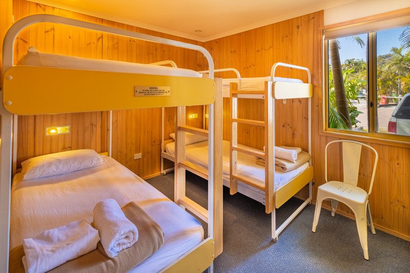Stay in relaxation, surrounded by gardens. Our Cascade Cabins sleep up to six guests with a queen bed in the main bedroom and two bunks in the second bedroom, as well as a bathroom, open plan living area, kitchen, and deck.