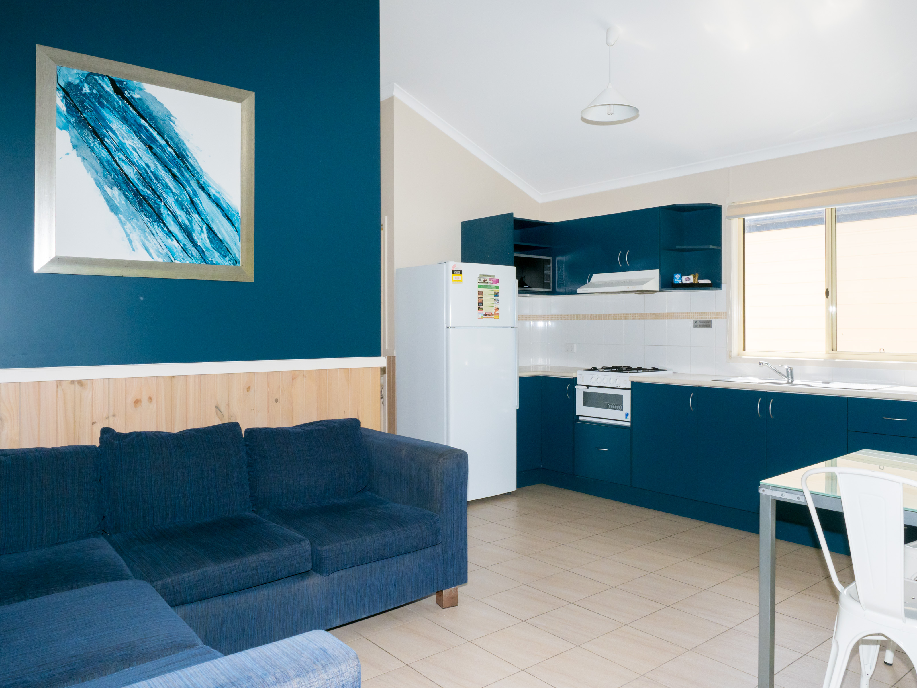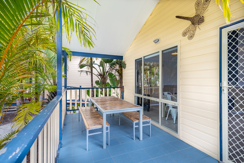 Look out over the lawn in this lush garden setting. Our Oasis Cabins sleep up to six guests with a queen bed in the main bedroom and a double bunk and single bed in the second bedroom, as well as a bathroom, living area, kitchen and deck, overlooking an expansive lawn.