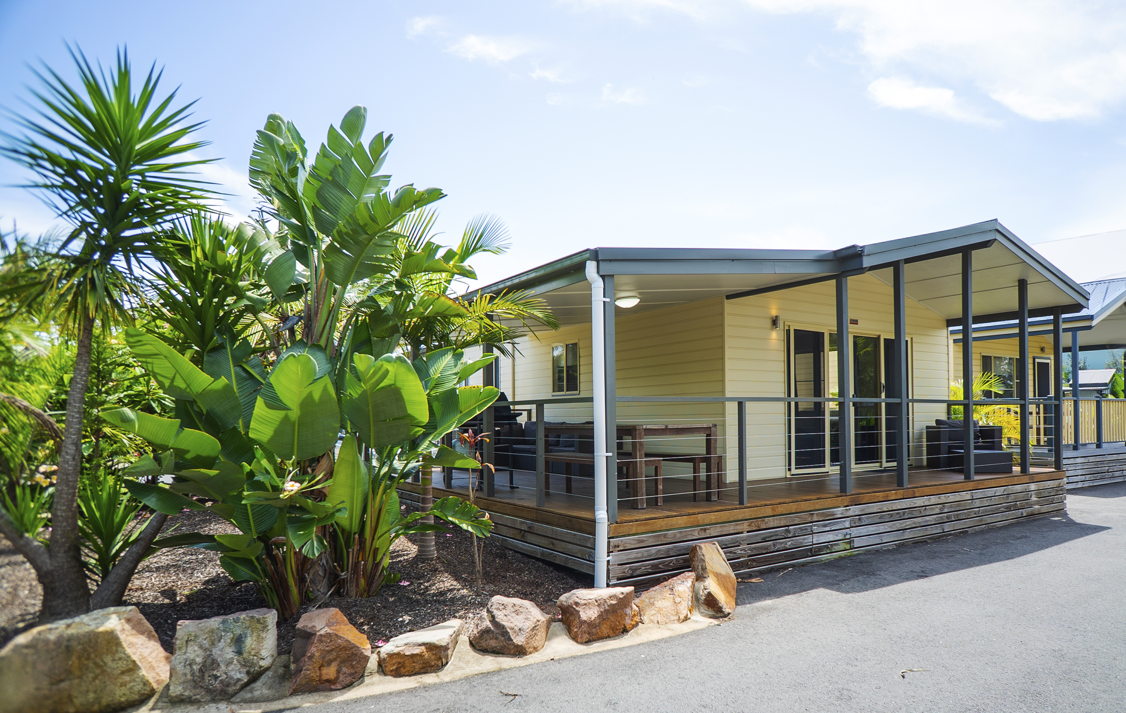 Enjoy spacious and modern comfort. Our Savannah Cabins sleep up to eight guests with a queen bed and ensuite in the main bedroom, a double bed in the second bedroom and two bunks in the third bedroom, as well as a second bathroom. Also features a living area, kitchen, and large deck, all located close to the pools.