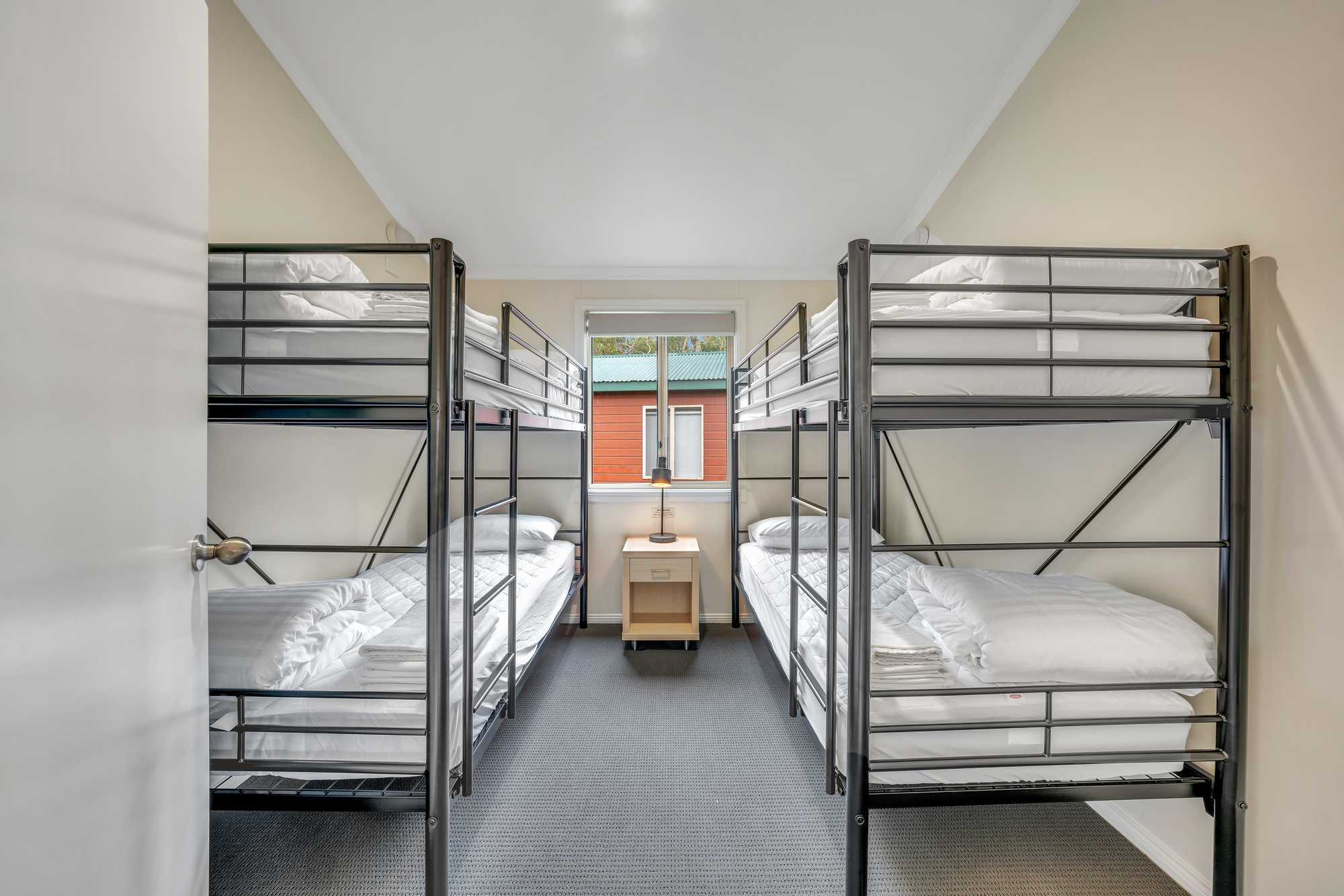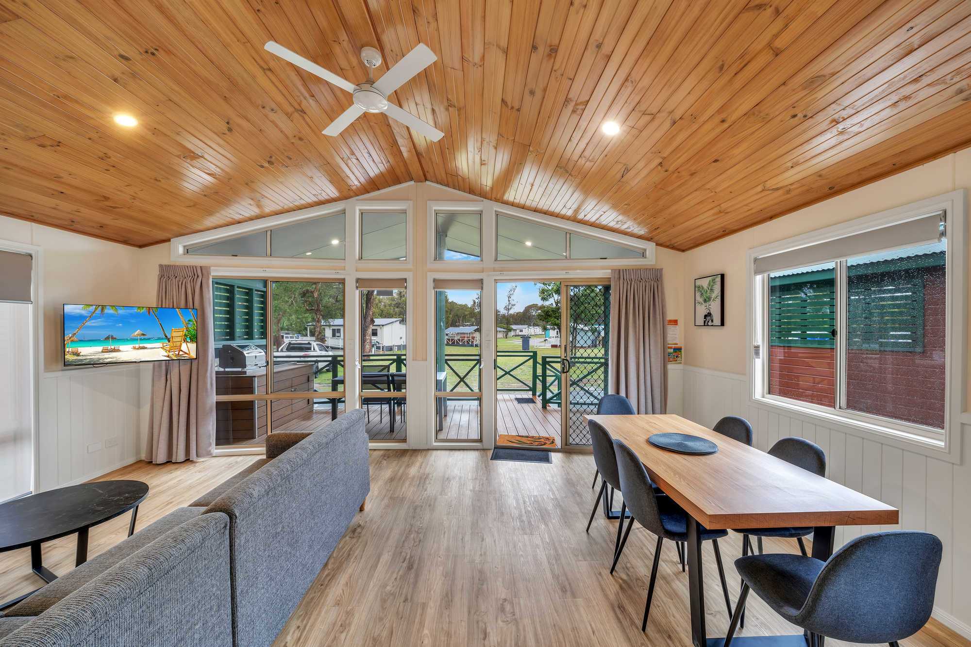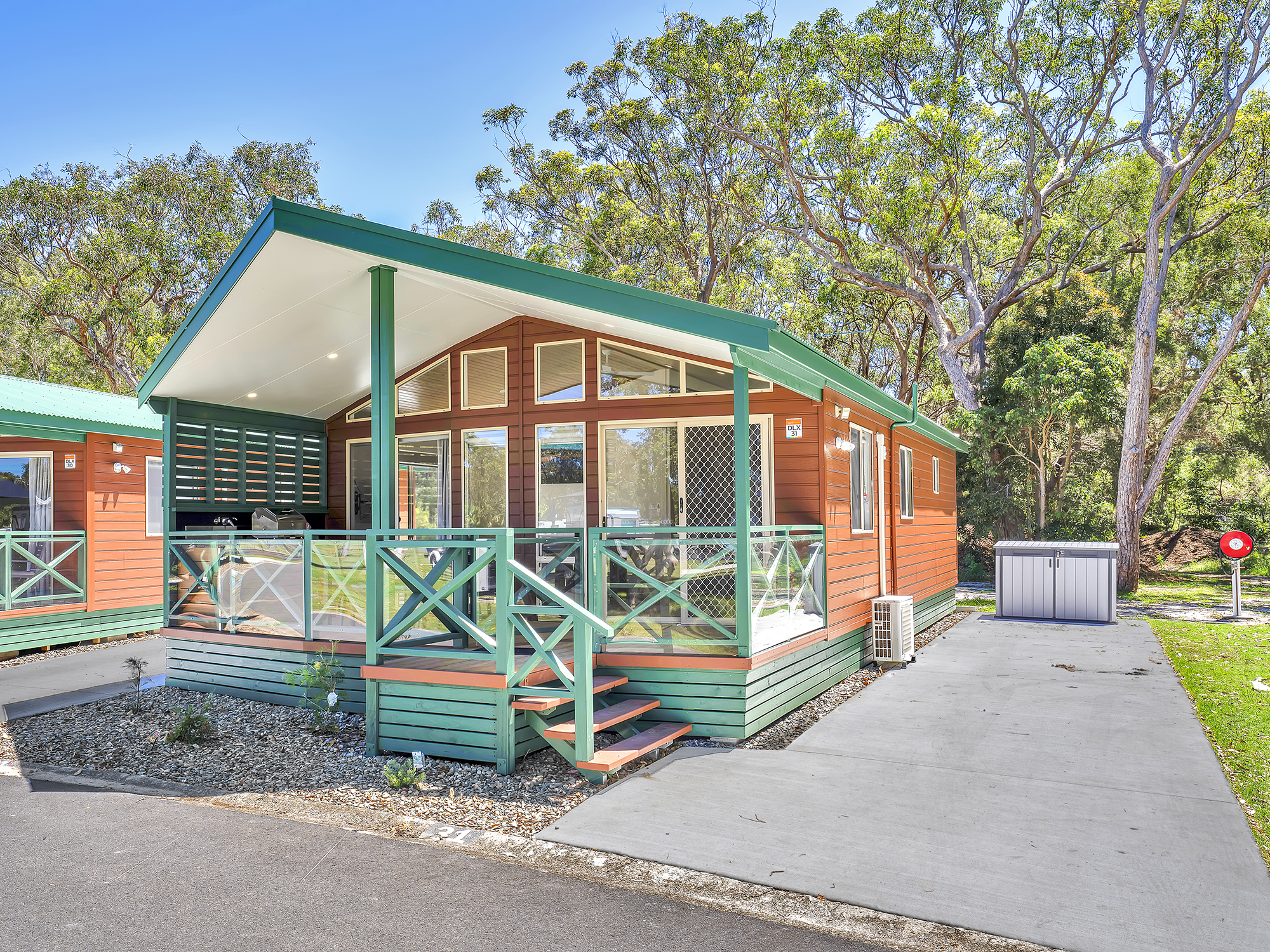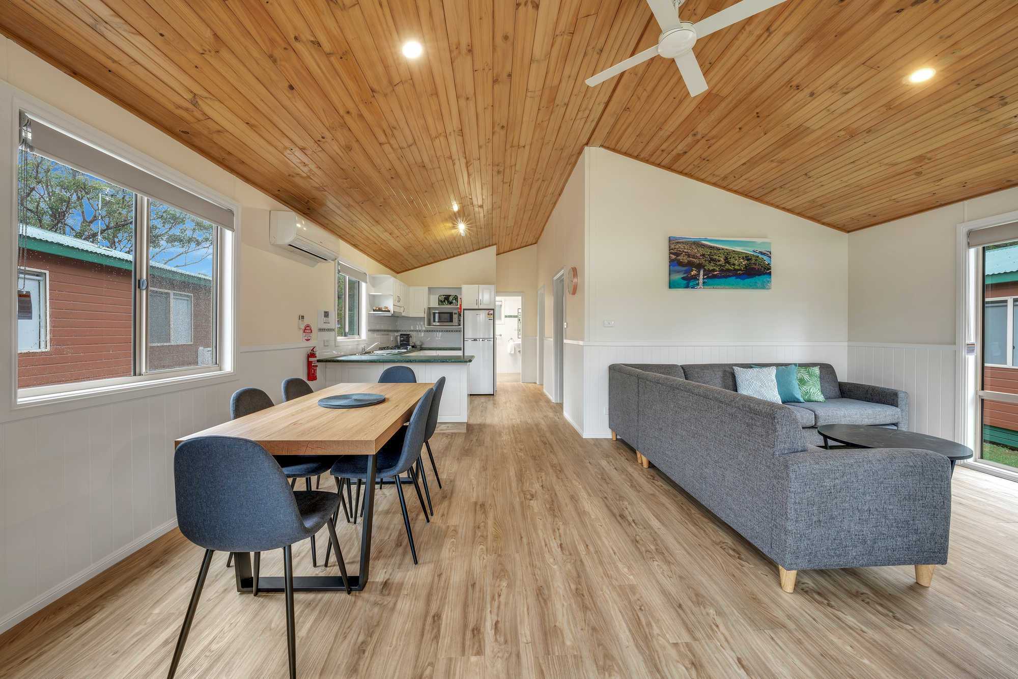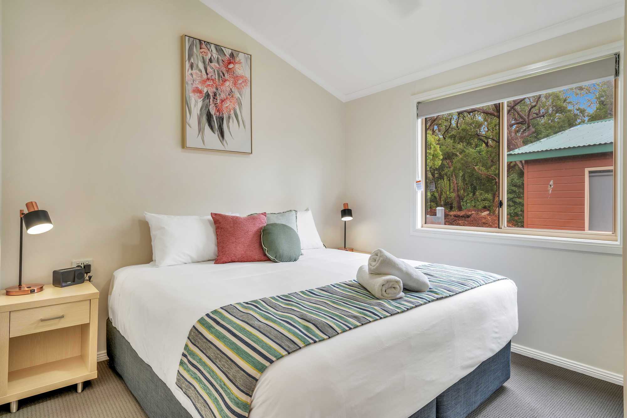 Stay in serenity at the Western end of the park amongst trees with sweeping views across the park. Our Deluxe Park View Cabin sleeps up to six guests with a king bed in the main bedroom and either two bunks or a queen bed in the second bedroom, as well as a bathroom, living area, kitchen, internal laundry, private deck with BBQ, and lock-up shed for storage.