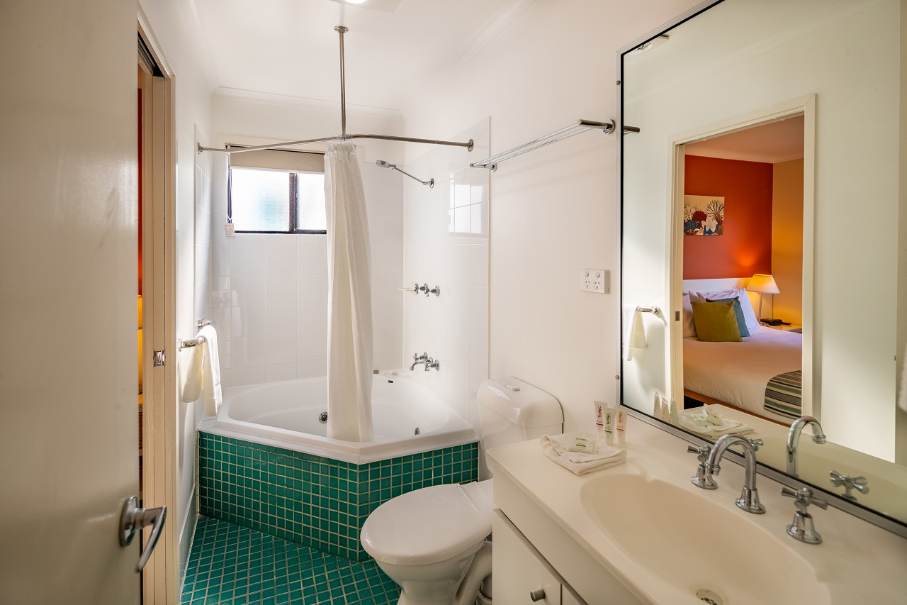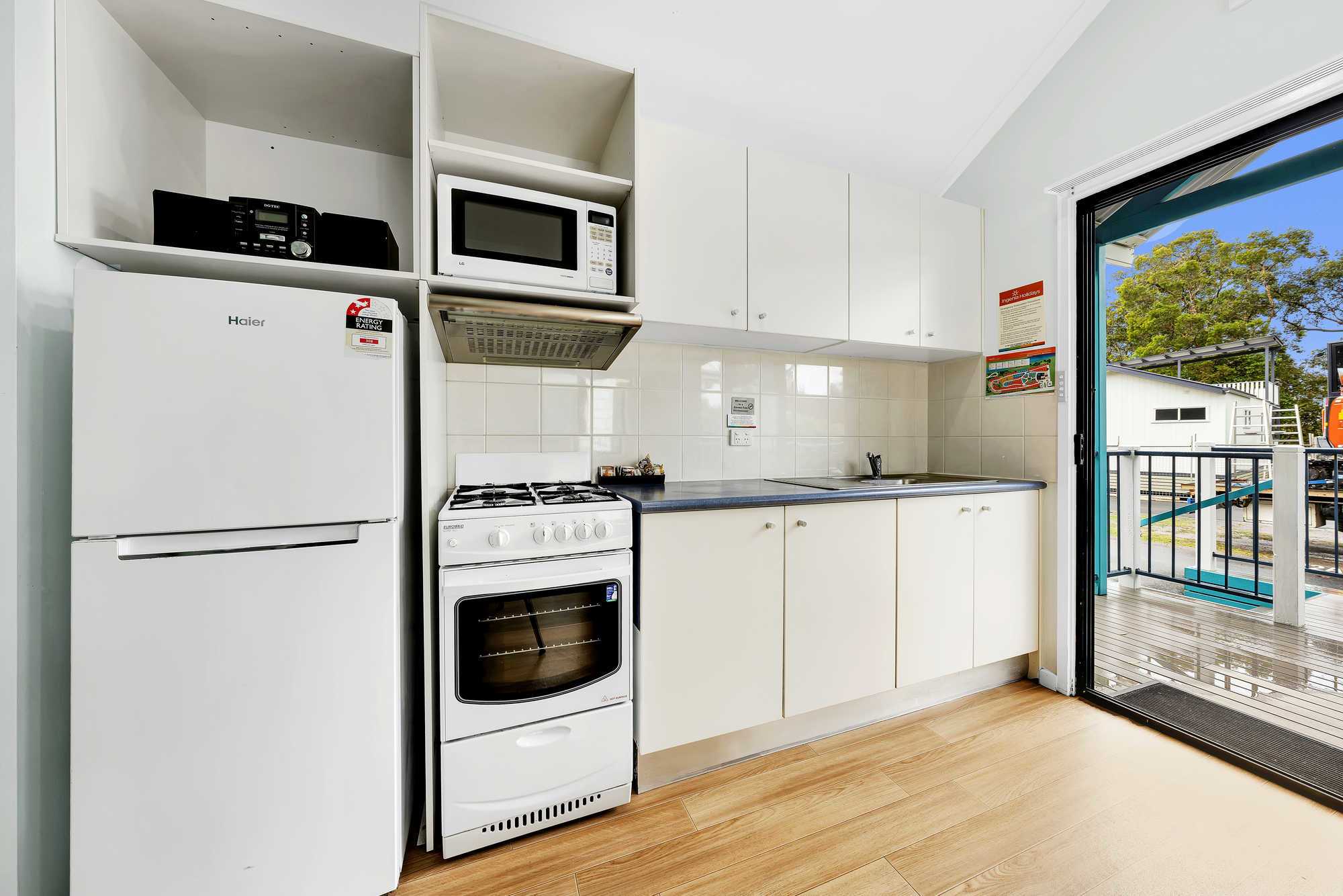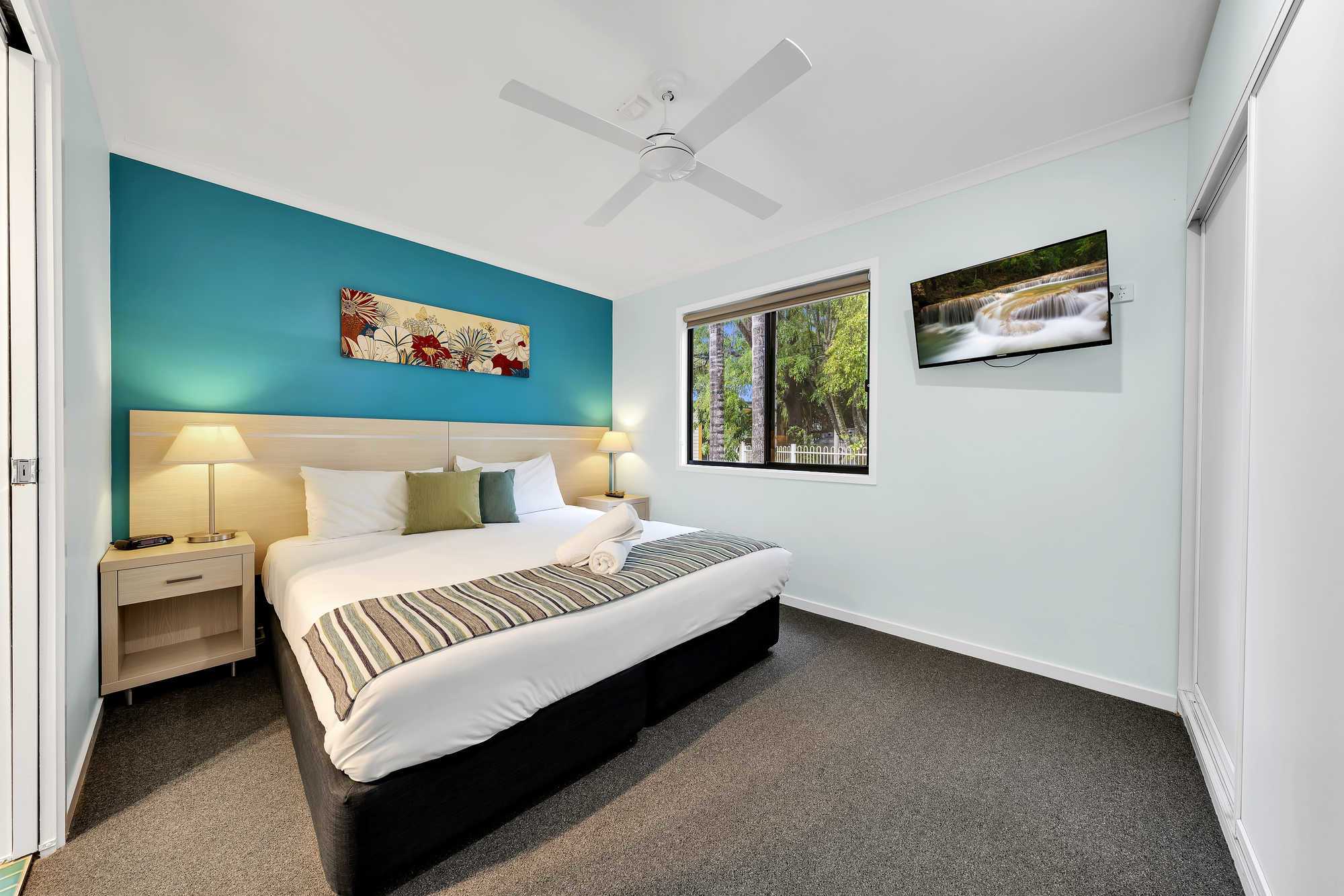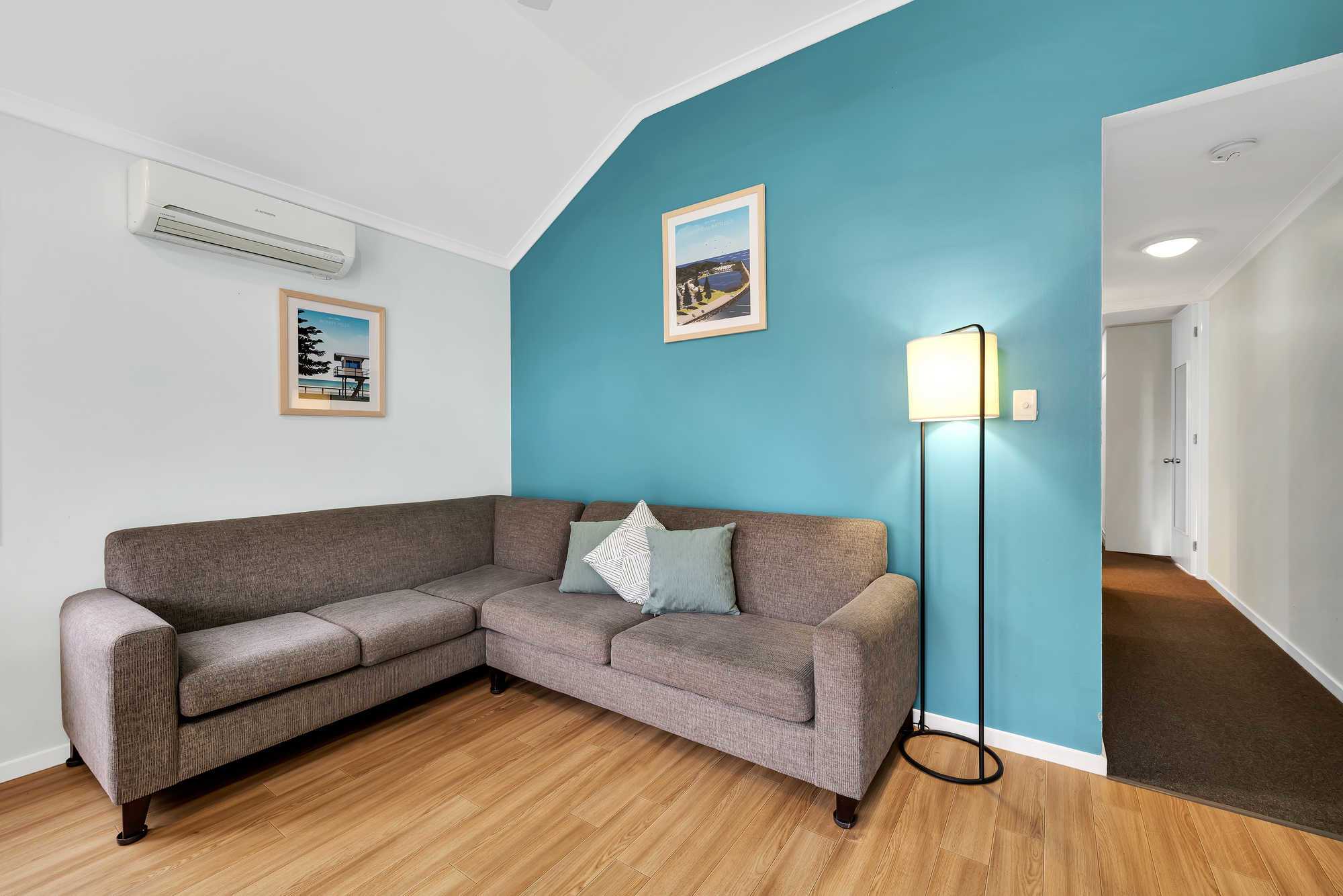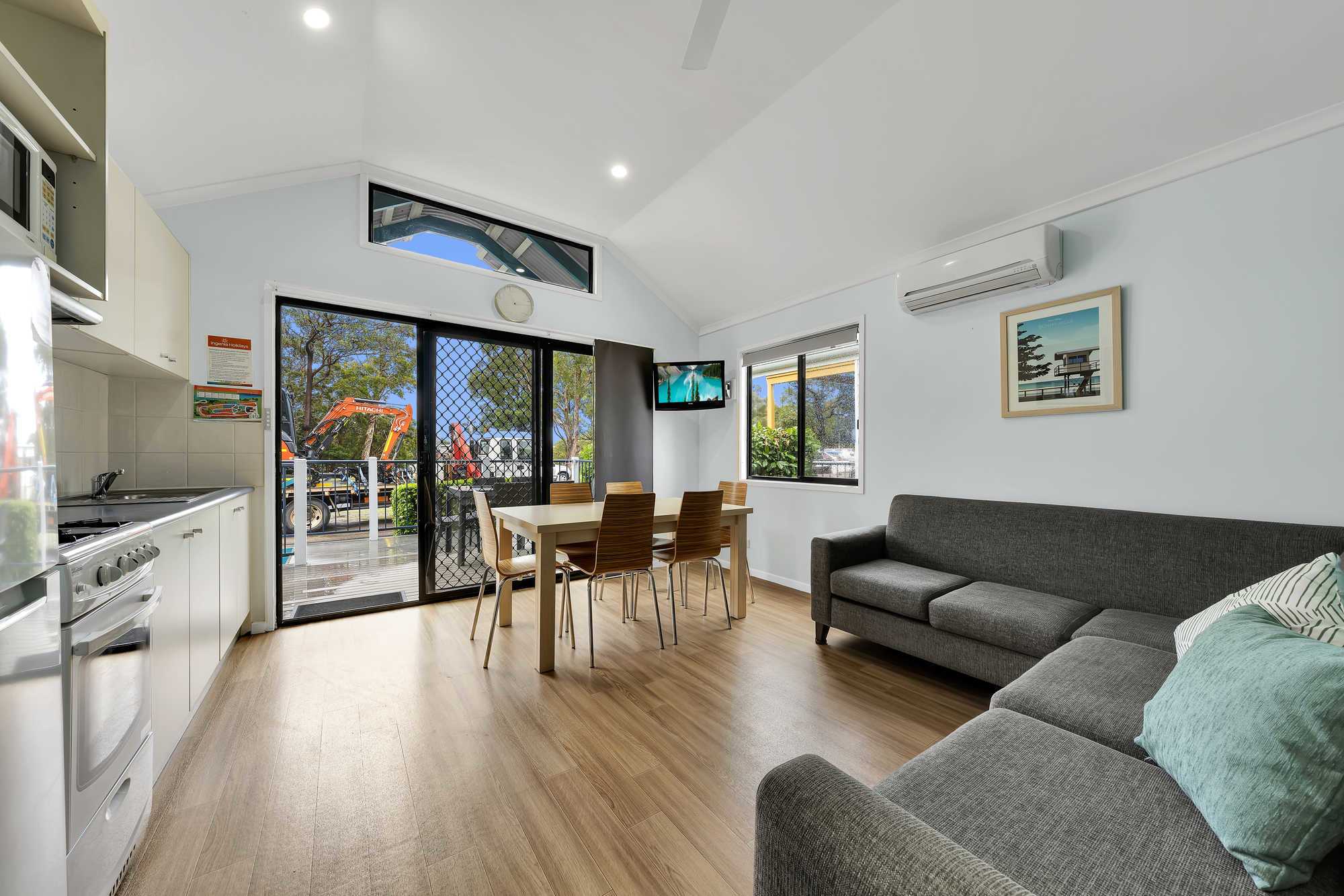 Enjoy a bright and spacious getaway. Our Spa Villas sleep up to five guests with a king bed in the main bedroom and either a bunk and single or two bunks in the second bedroom, as well as a bathroom with a shower over spa bath, living area, kitchen, and private deck.