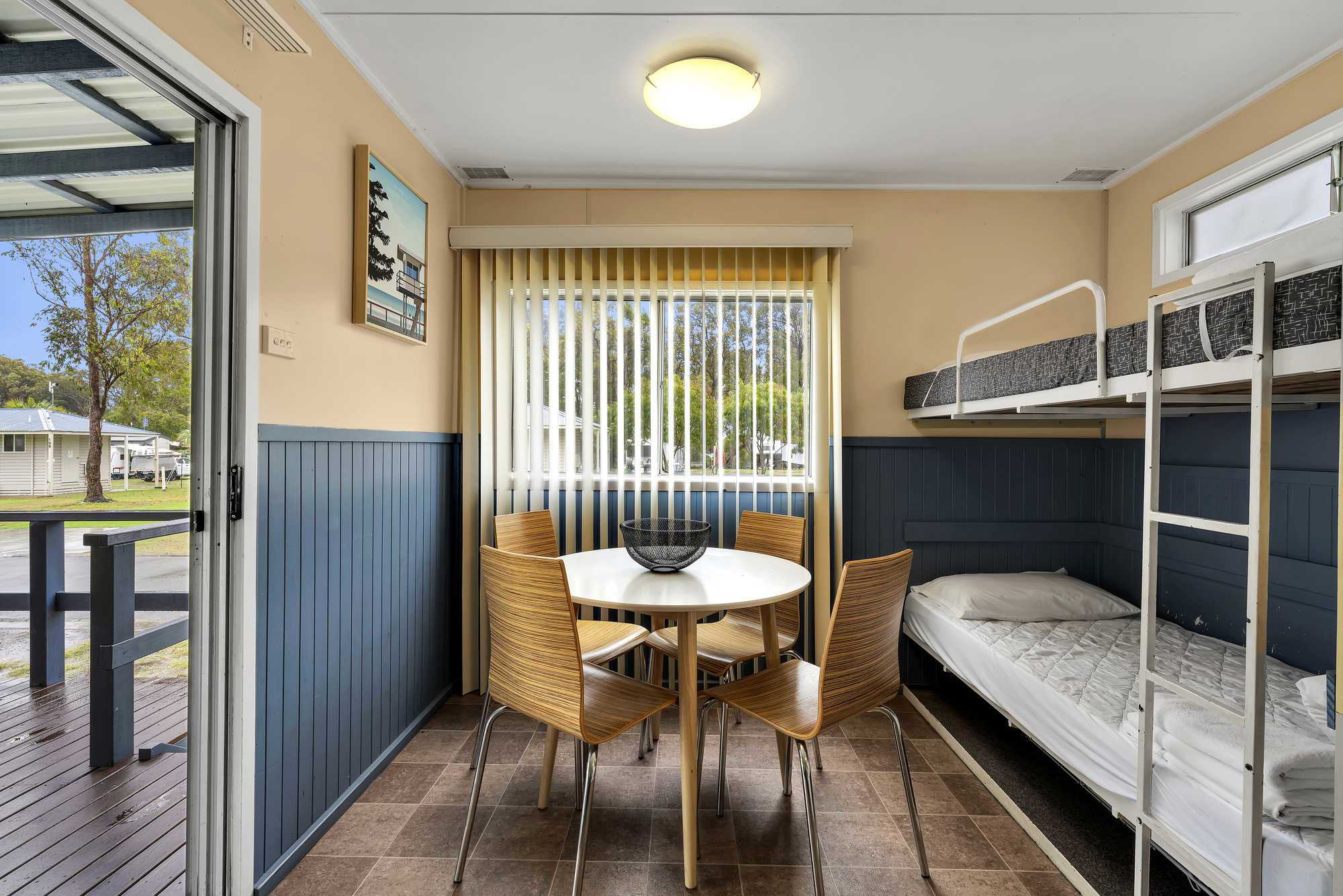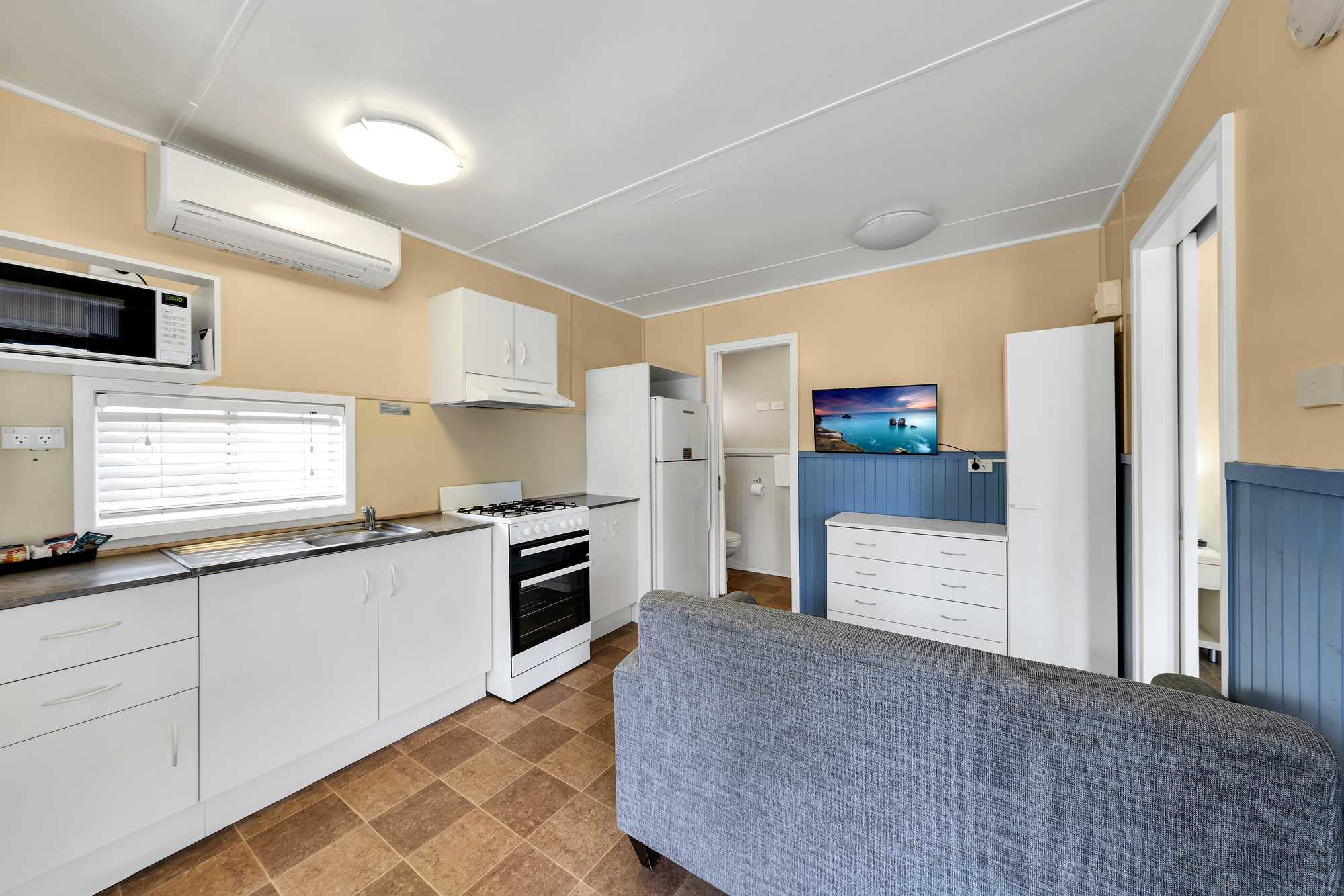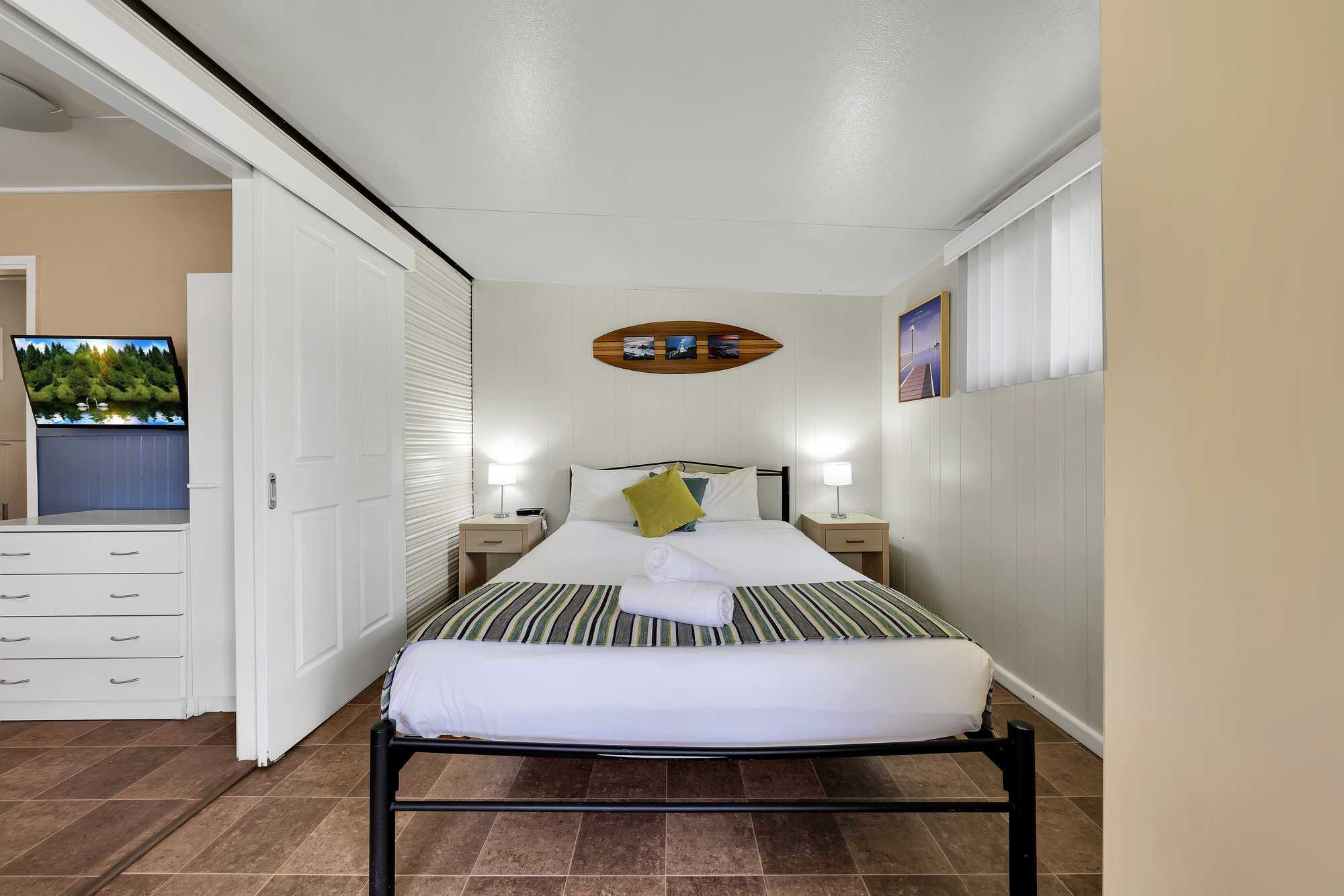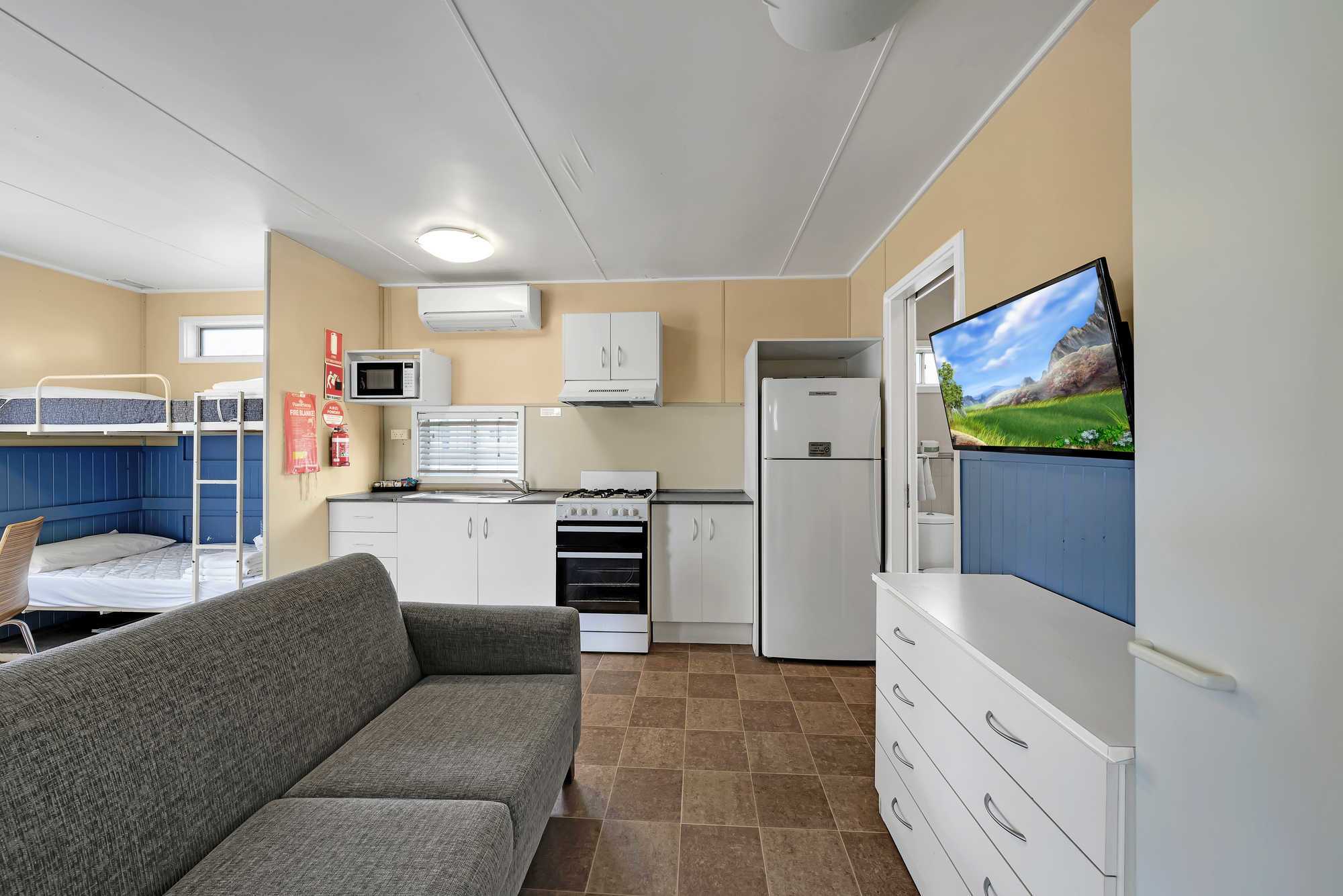 Enjoy budget accommodation with a bit of extra privacy. Our Standard 1 Bedroom Cabins sleep up to four guests with a queen bed in the bedroom and bunks in the living area, as well as an ensuite bathroom, kitchen, and private deck.