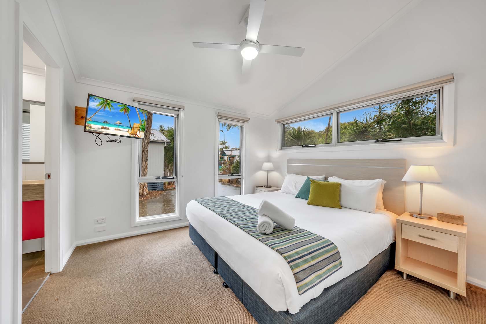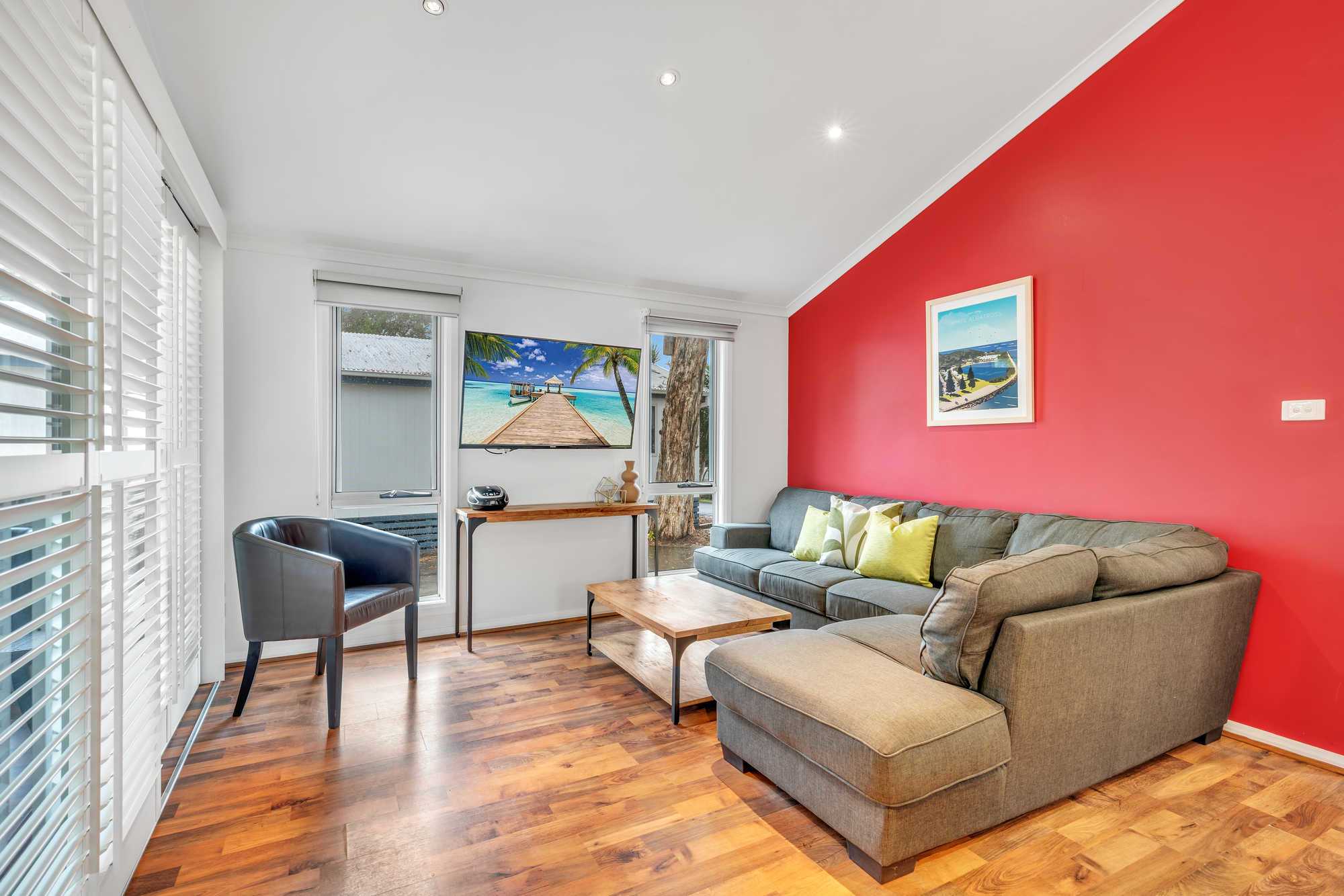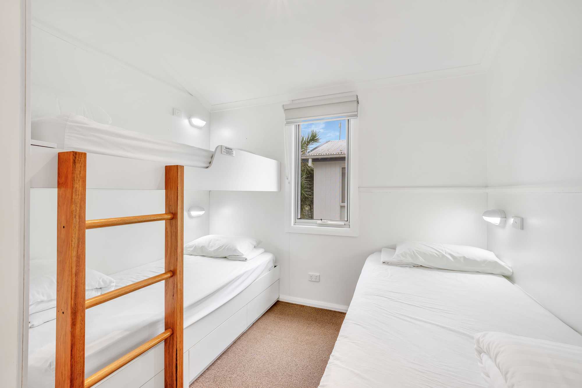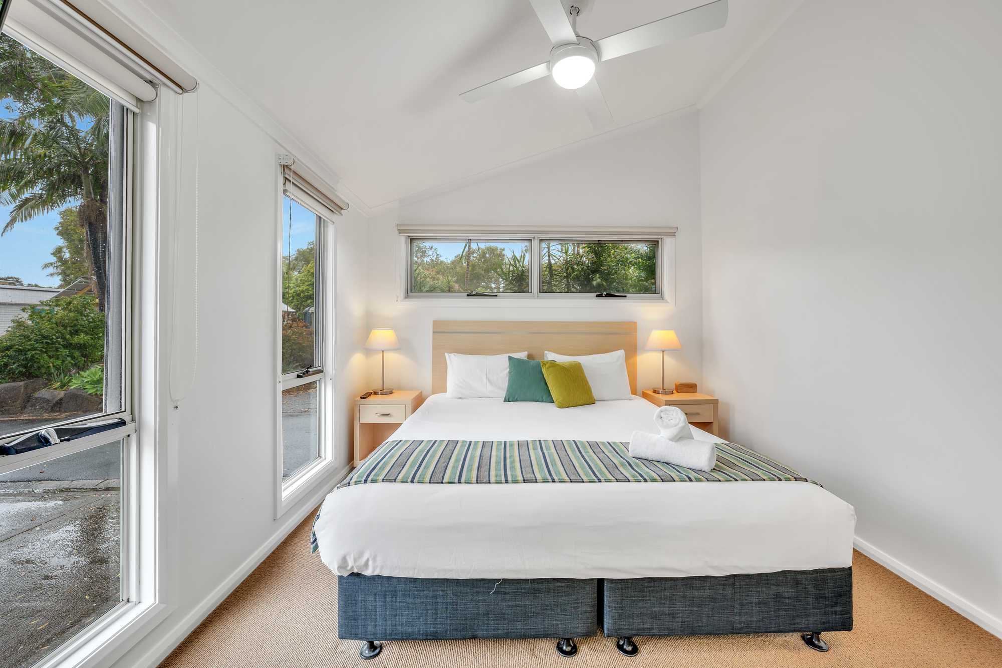 Stay on the waterfront in modern comfort. Our Superior Waterfront Villas sleep up to five guests with a king bed and ensuite in the main bedroom and bunk and single bed in the second bedroom, as well as an additional bathroom, living area, kitchen, internal laundry, and outdoor deck with spectacular water views and a BBQ.