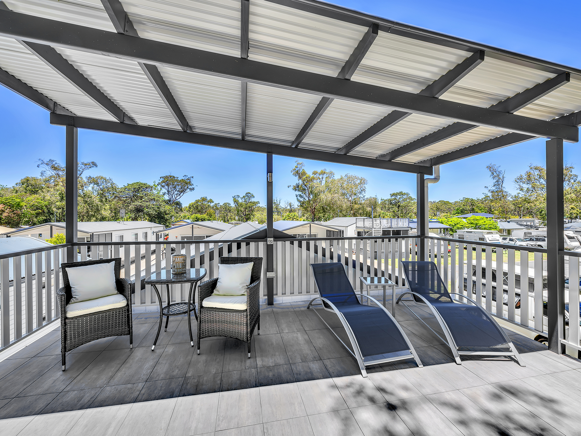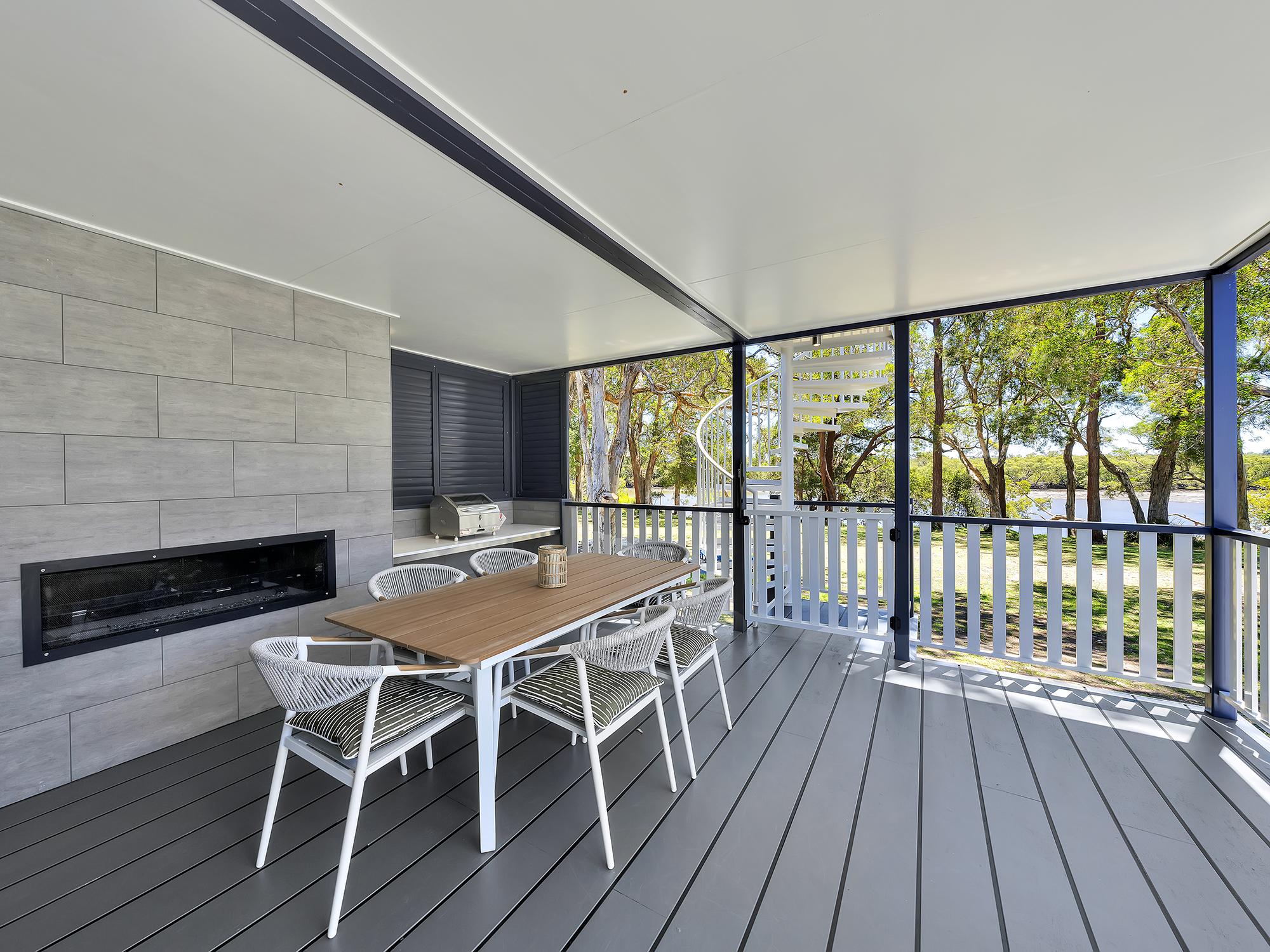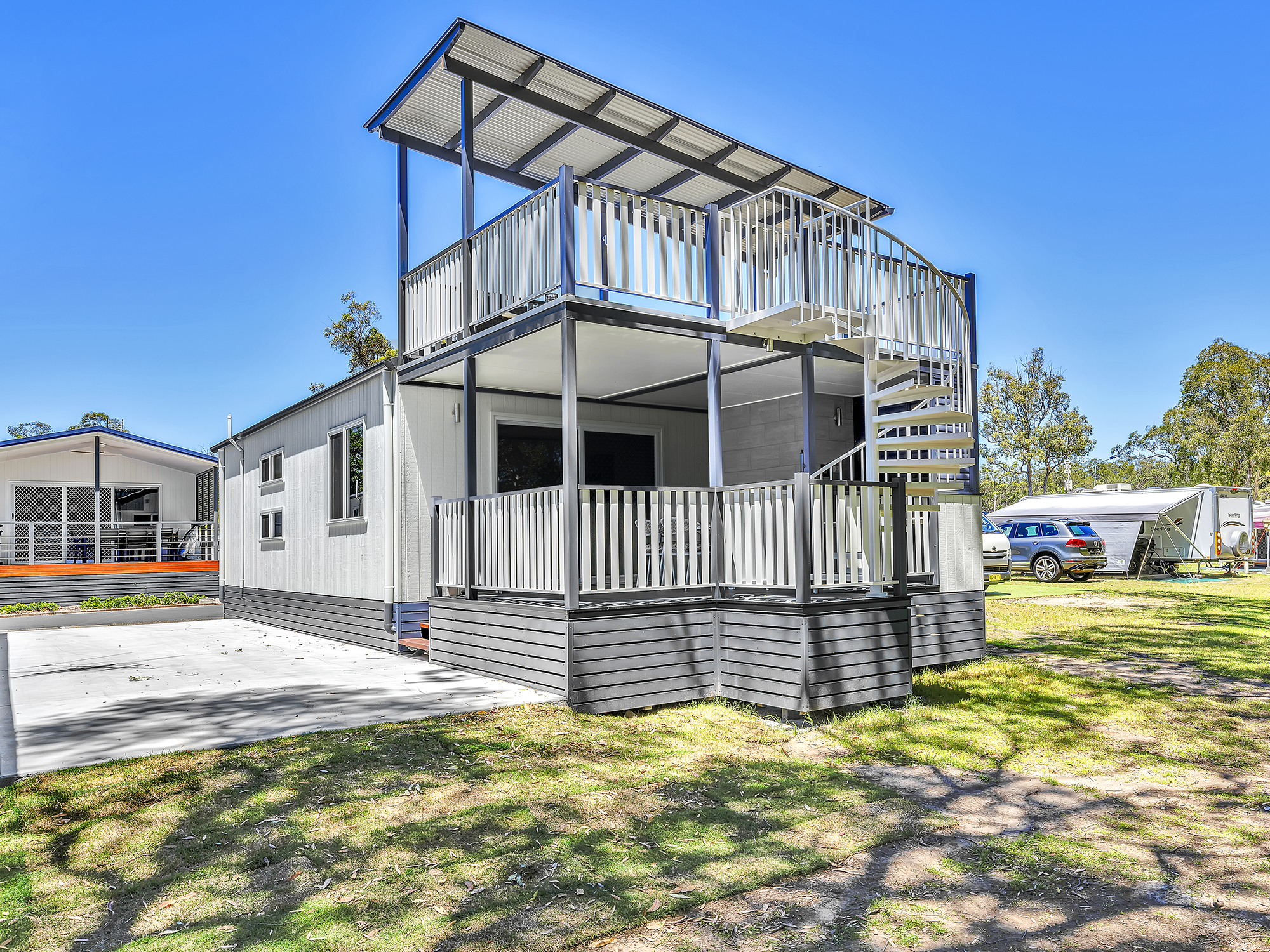 Enjoy a modern coastal aesthetic and stunning views of Back Creek. Our Two Bedroom Waterfront Sky Deck Villa sleeps up to four or six guests with a queen in the main bedroom and either a queen or two bunks in the second bedroom. These Villas also feature a bathroom, modern living area, kitchen, internal laundry, and private deck with BBQ, both on the ground floor and accessible via a spiral staircase on the rooftop.