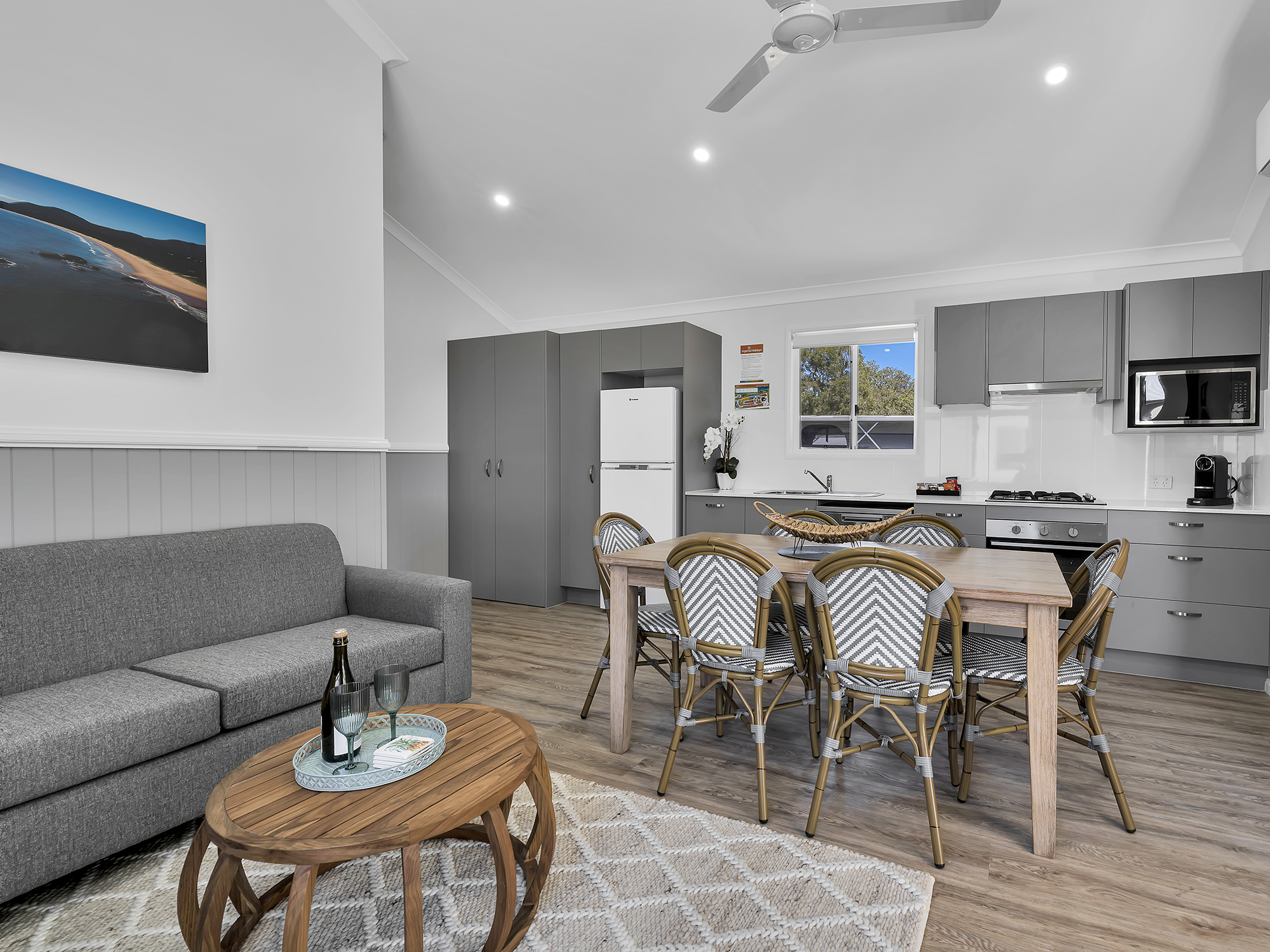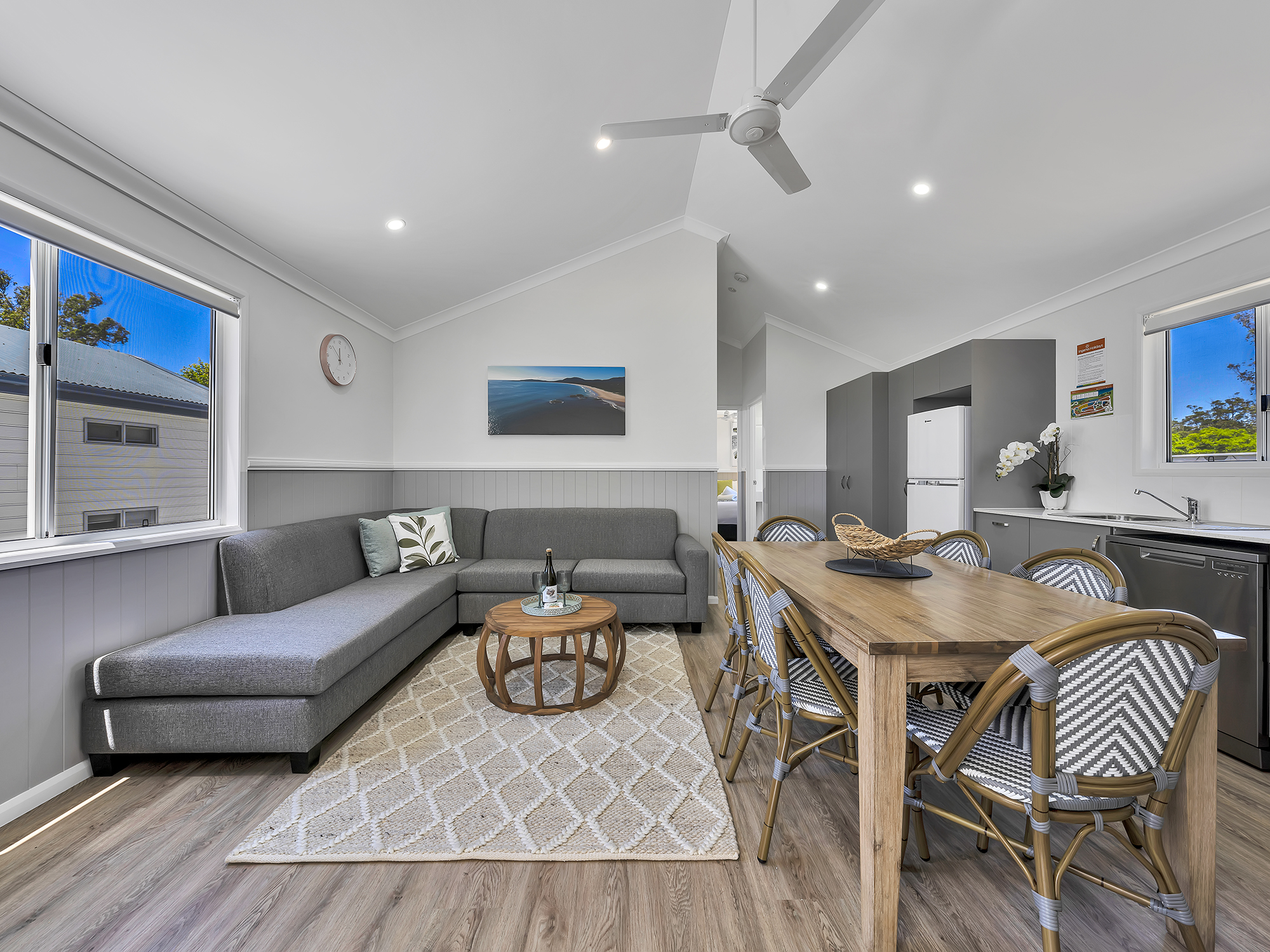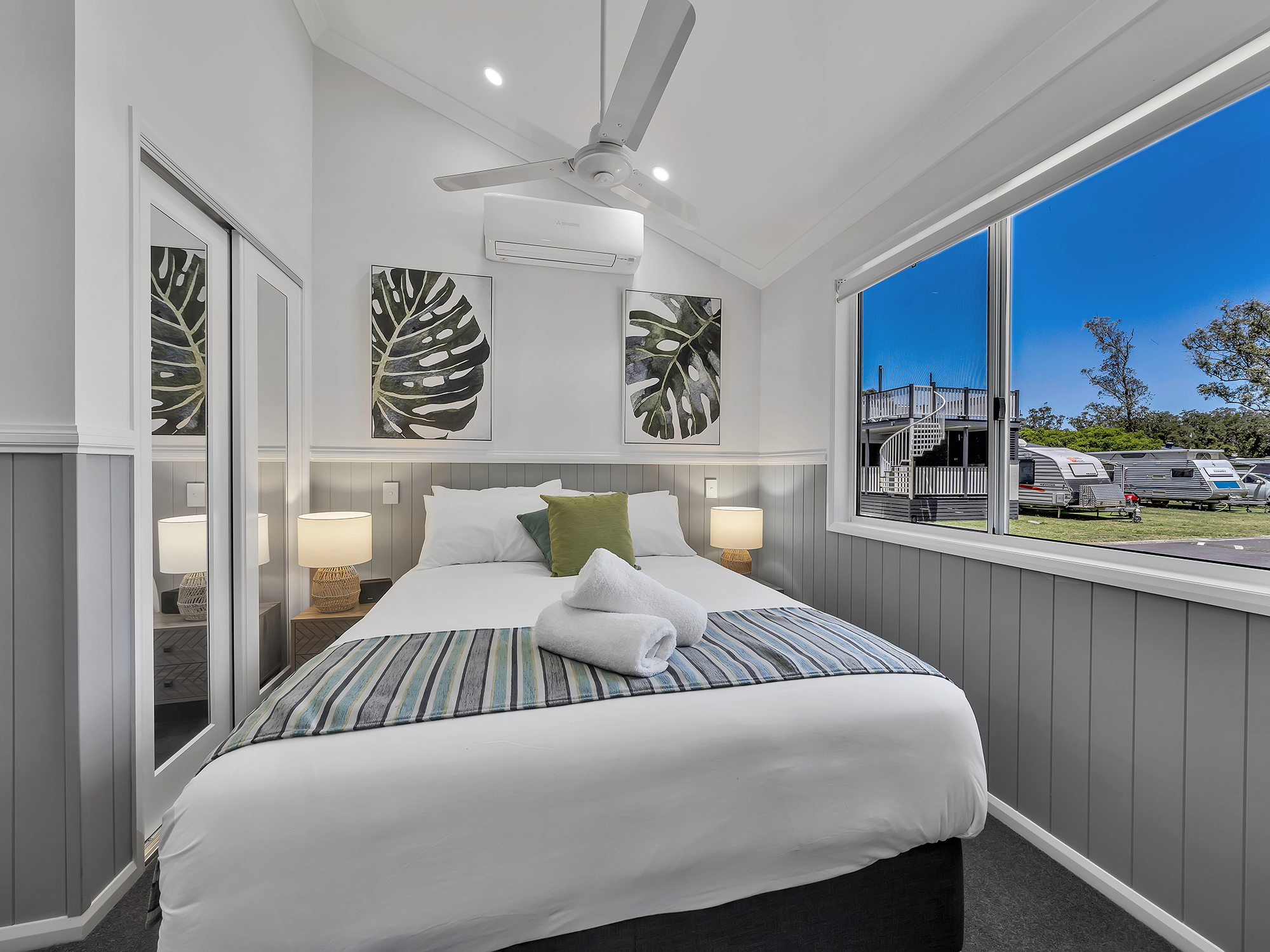 Enjoy a modern coastal aesthetic and stunning views of Back Creek. Our Two Bedroom Waterfront Sky Deck Villa sleeps up to four or six guests with a queen in the main bedroom and either a queen or two bunks in the second bedroom. These Villas also feature a bathroom, modern living area, kitchen, internal laundry, and private deck with BBQ, both on the ground floor and accessible via a spiral staircase on the rooftop.