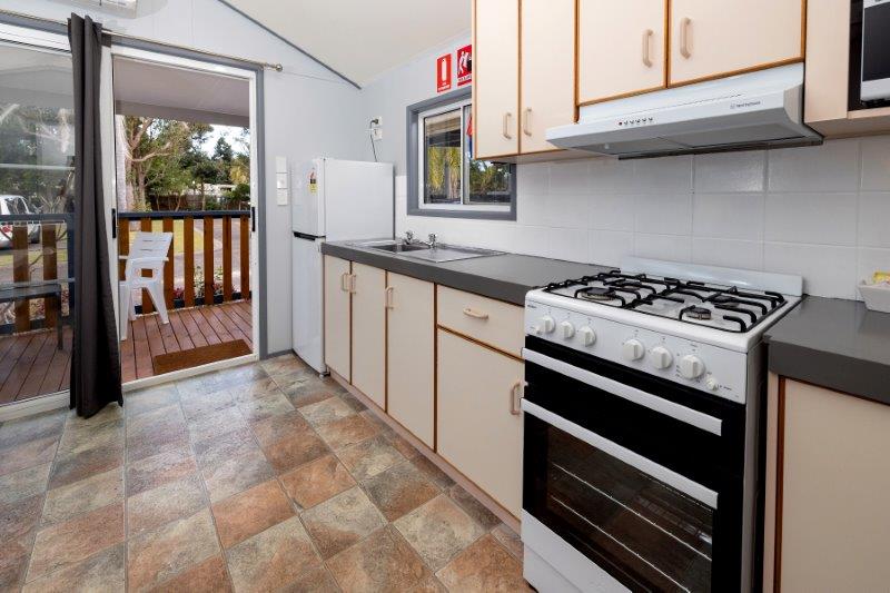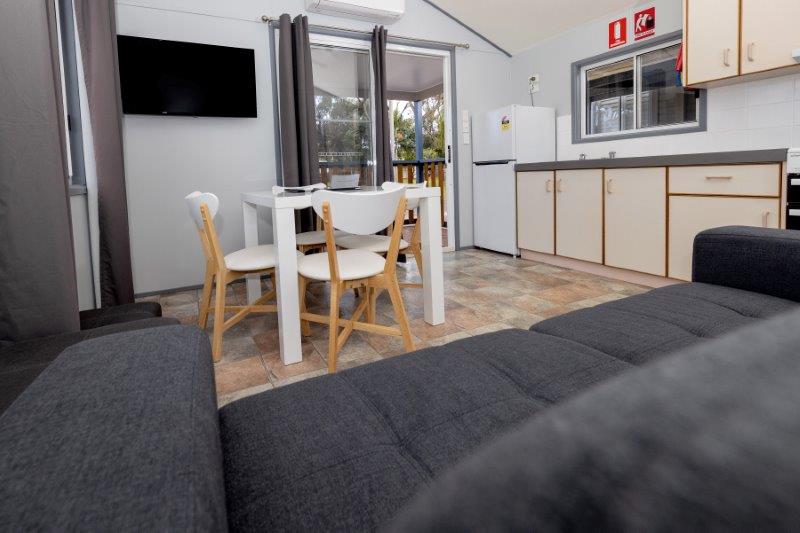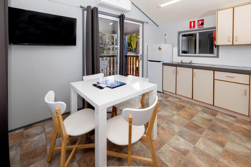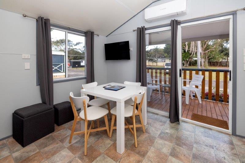 It features a double bed and a full kitchen with gas oven, stovetop, microwave, and fridge. Enjoy the comfort of air conditioning, a dining area, and flat screen TV, with a private bathroom for added convenience. A cosy and affordable pet-friendly option, ideal for a laid-back coastal stay.