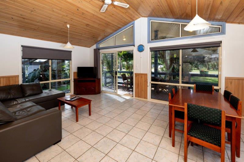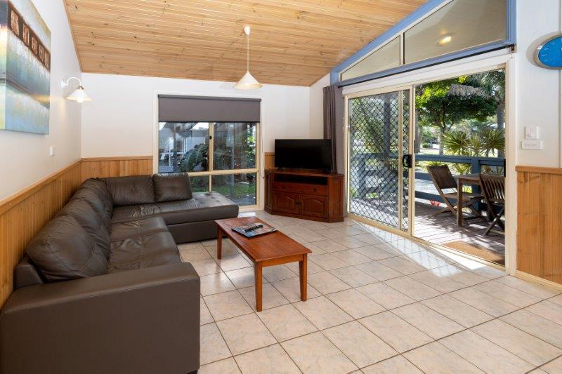 Featuring a queen bed in the main bedroom and a double plus single in the second, it’s ideal for a restful stay. The full kitchen includes a gas oven, stovetop, dishwasher and microwave for easy home-style meals. Unwind in the open plan living and dining area with TV, or enjoy a soak in the corner spa bath. Air conditioning ensures comfort, with a private patio to complete the retreat.