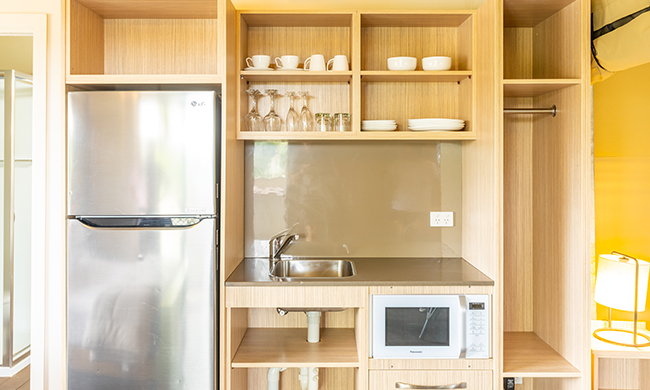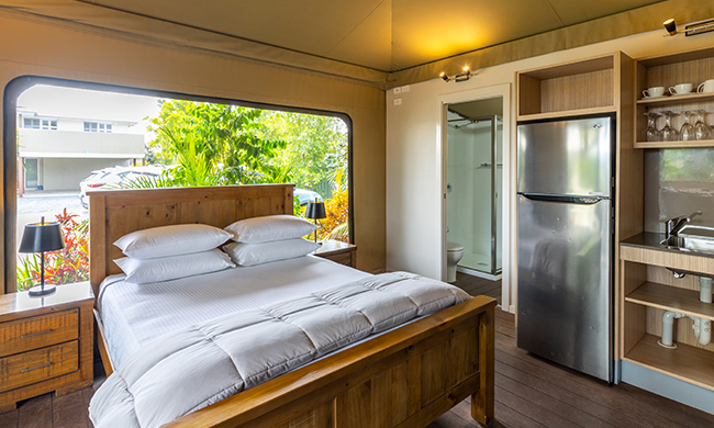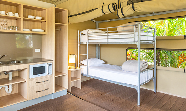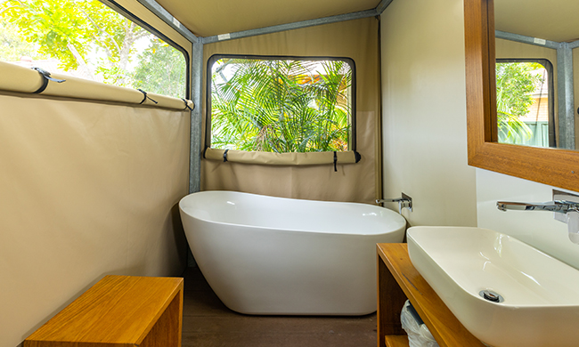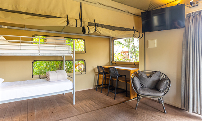 Luxury camping overlooking the quiet lap pool. One queen bed and set of bunk beds. Featuring air conditioning; open plan with canvas wall separating the bunk beds; 1 bathroom with shower and free standing bath; kitchenette with microwave, fridge and tea and coffee making facilities; outdoor bar seating.