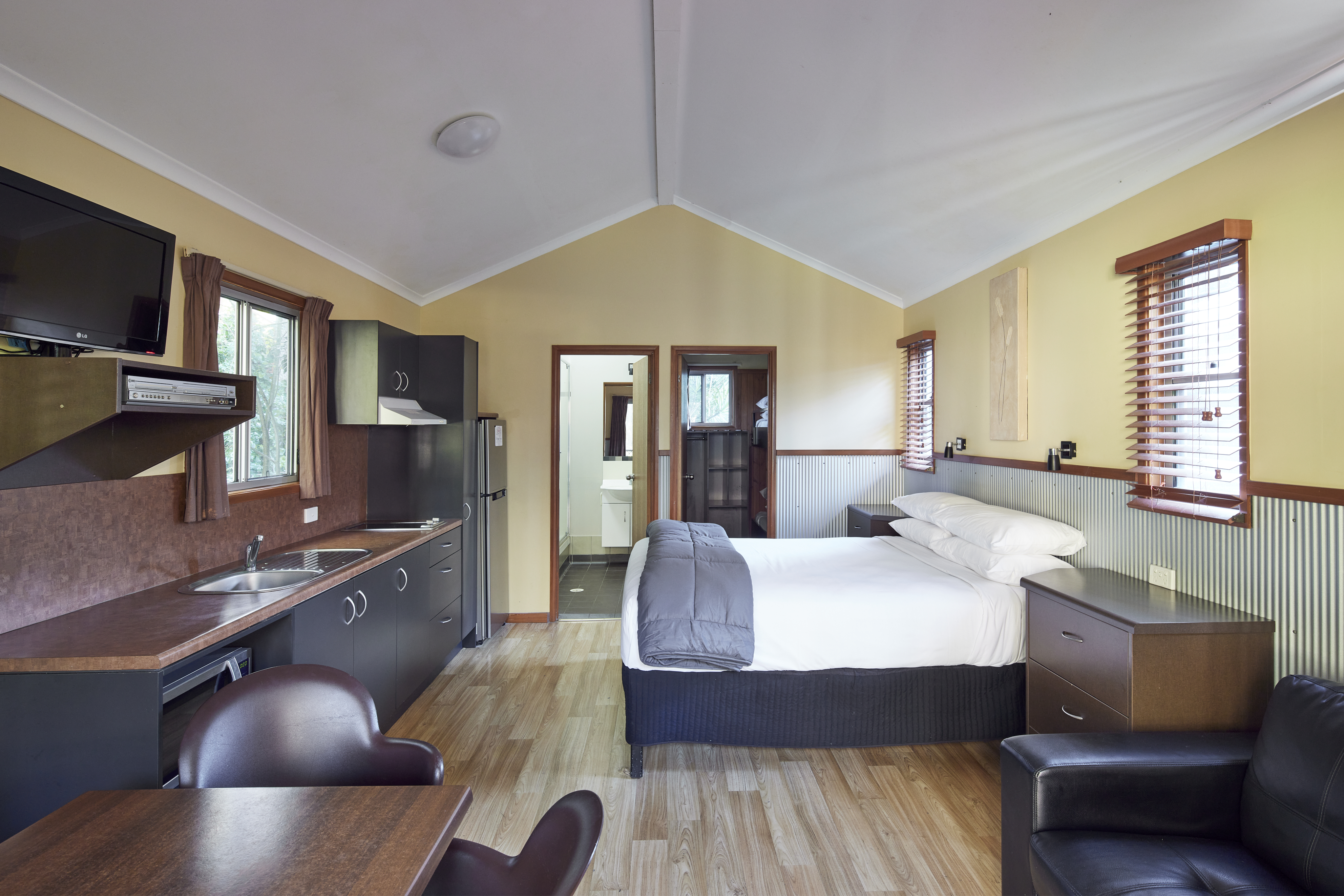 Open plan, one bedroom villa surrounded by nature. One queen and one single bunk. Featuring air-conditioning; kitchen including fridge, hotplates and microwave; dining and lounge area with leather seating; TV; bathroom; outdoor area with dining. Pet friendly conditions apply and are only allowed during low and mid season.
