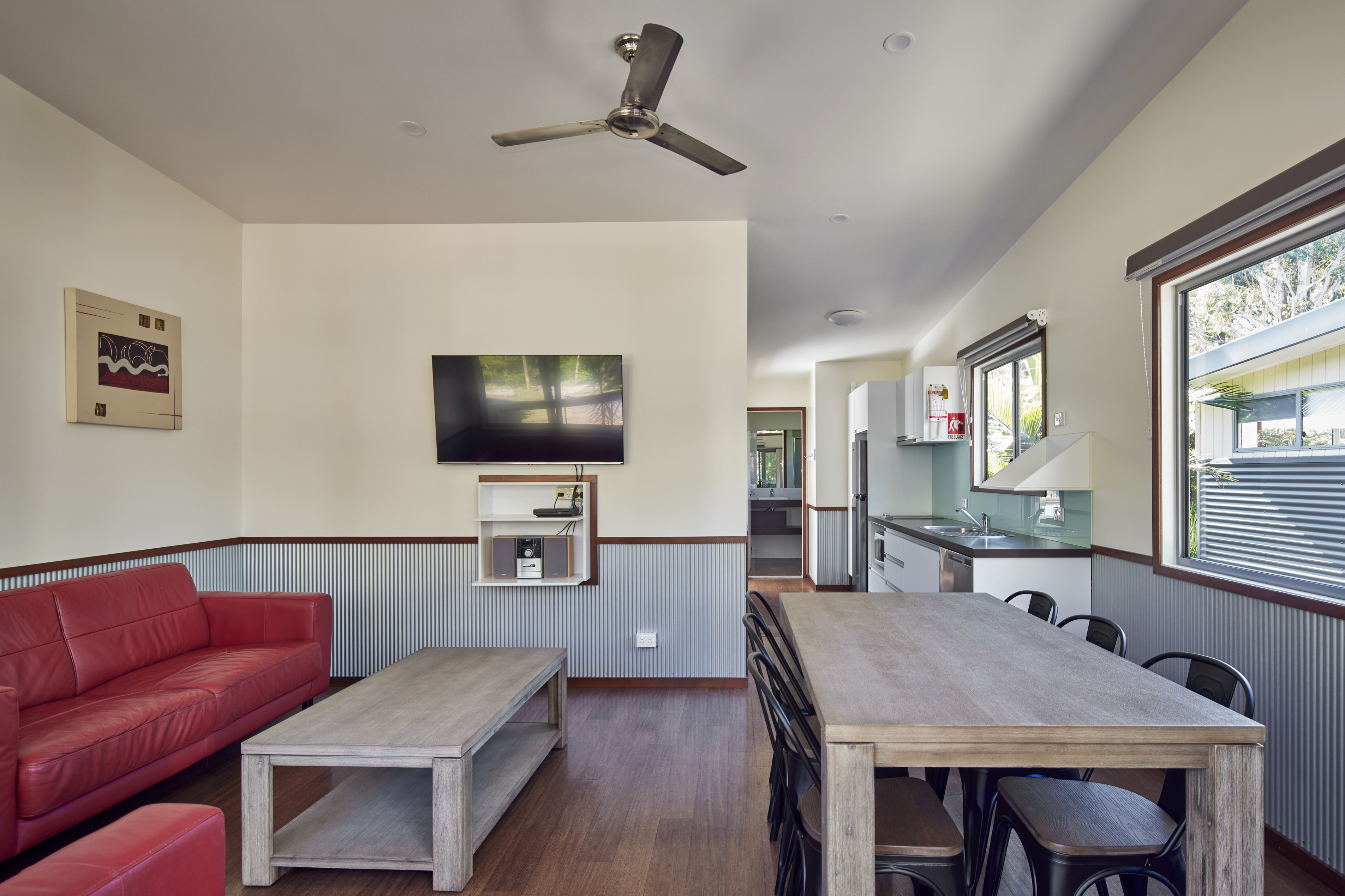 Eco two bedroom villa, bordered by the lagoon. One queen and an option of two single bunks, or one double and one single bunk. Featuring air-conditioning; kitchen including dishwasher, fridge, microwave and hotplate; dining and lounge area with leather seating; two TVs; bathroom; washing machine and dryer; outdoor veranda set overlooking national park with seating.