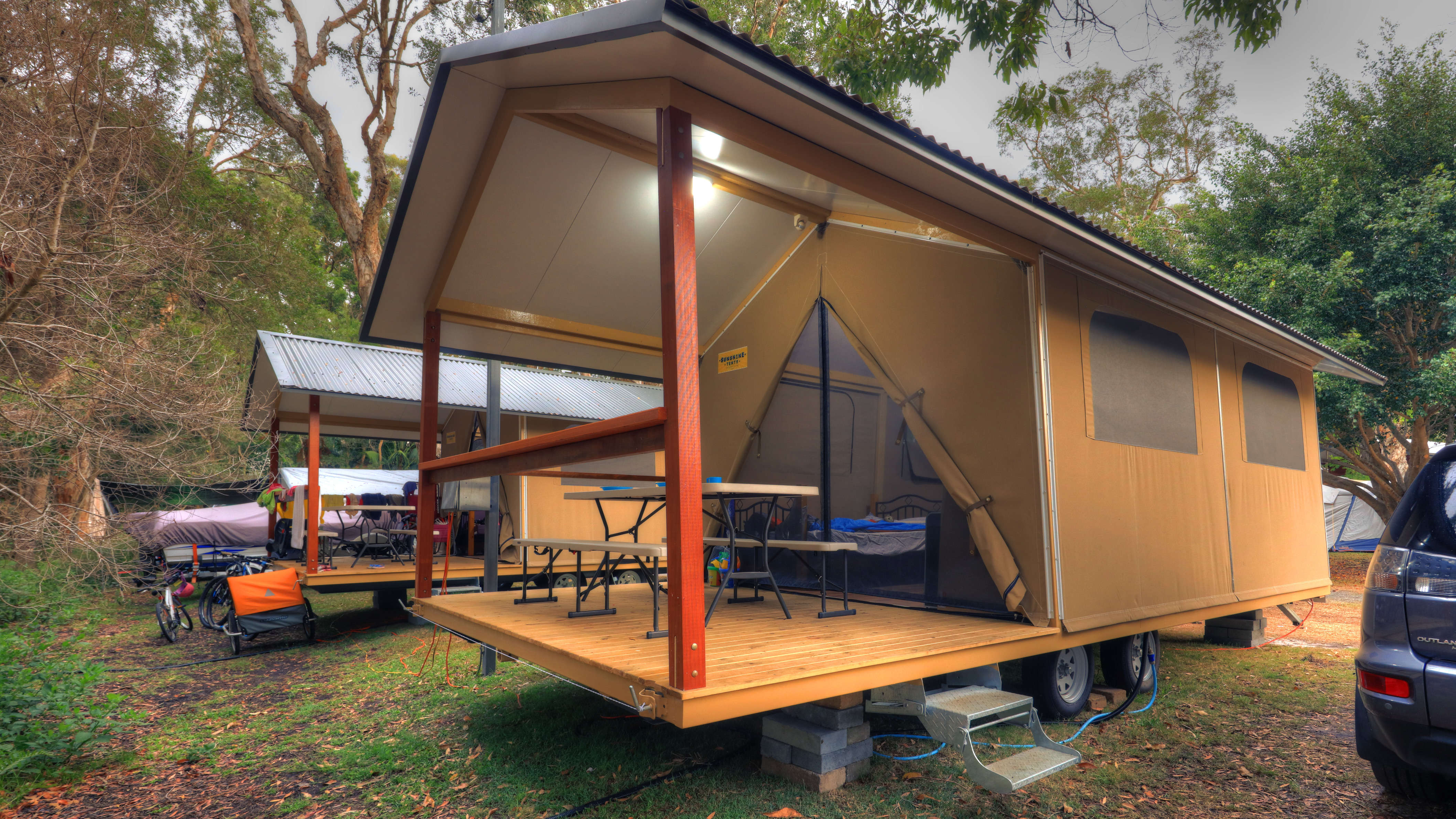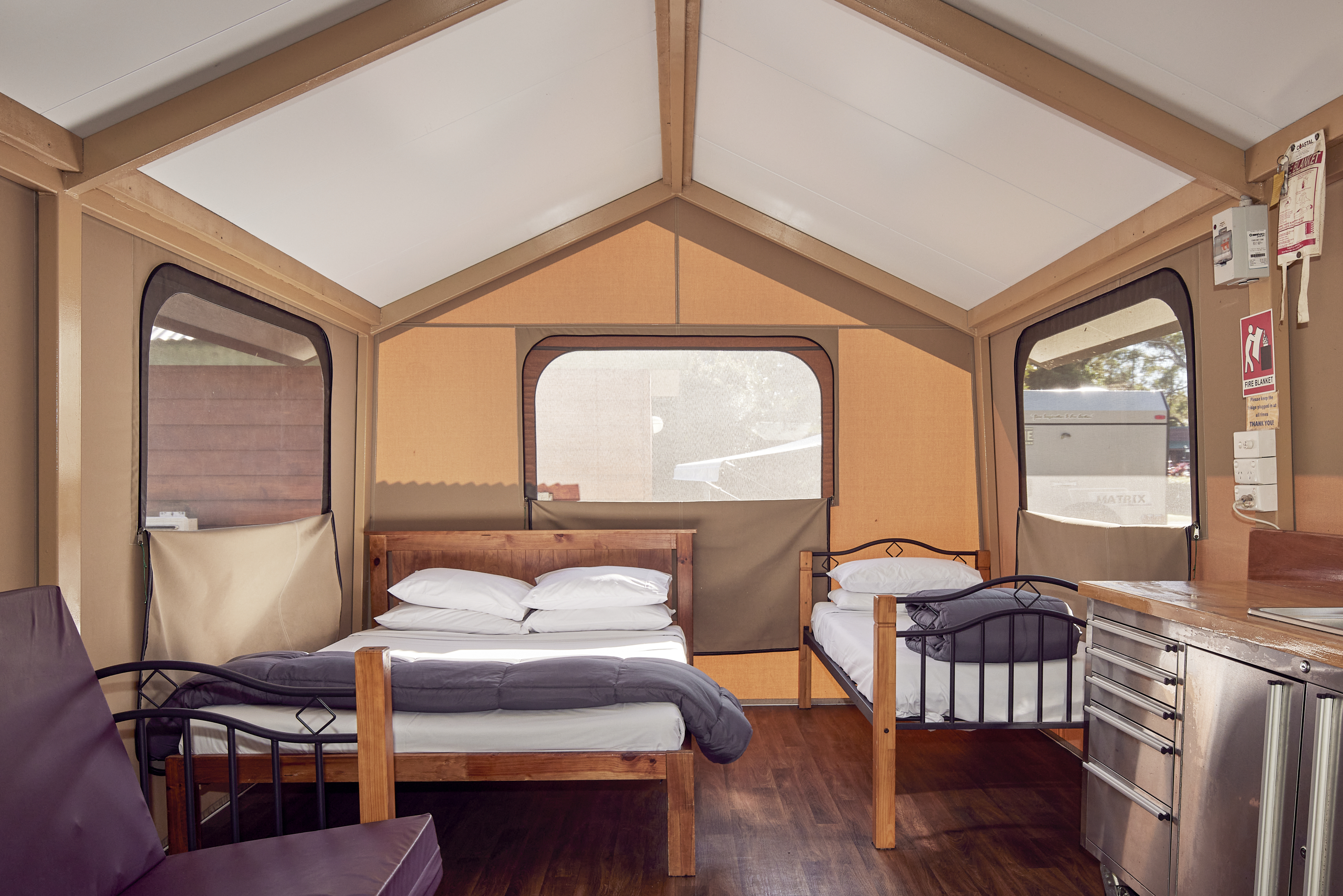 Glamping style safari tent. One queen, one single and one double fold out lounge. Featuring ceiling fan; kettle, toaster, fridge and freezer; lounge area; outdoor area with dining. Option to book a private ensuite with shower and toilet.