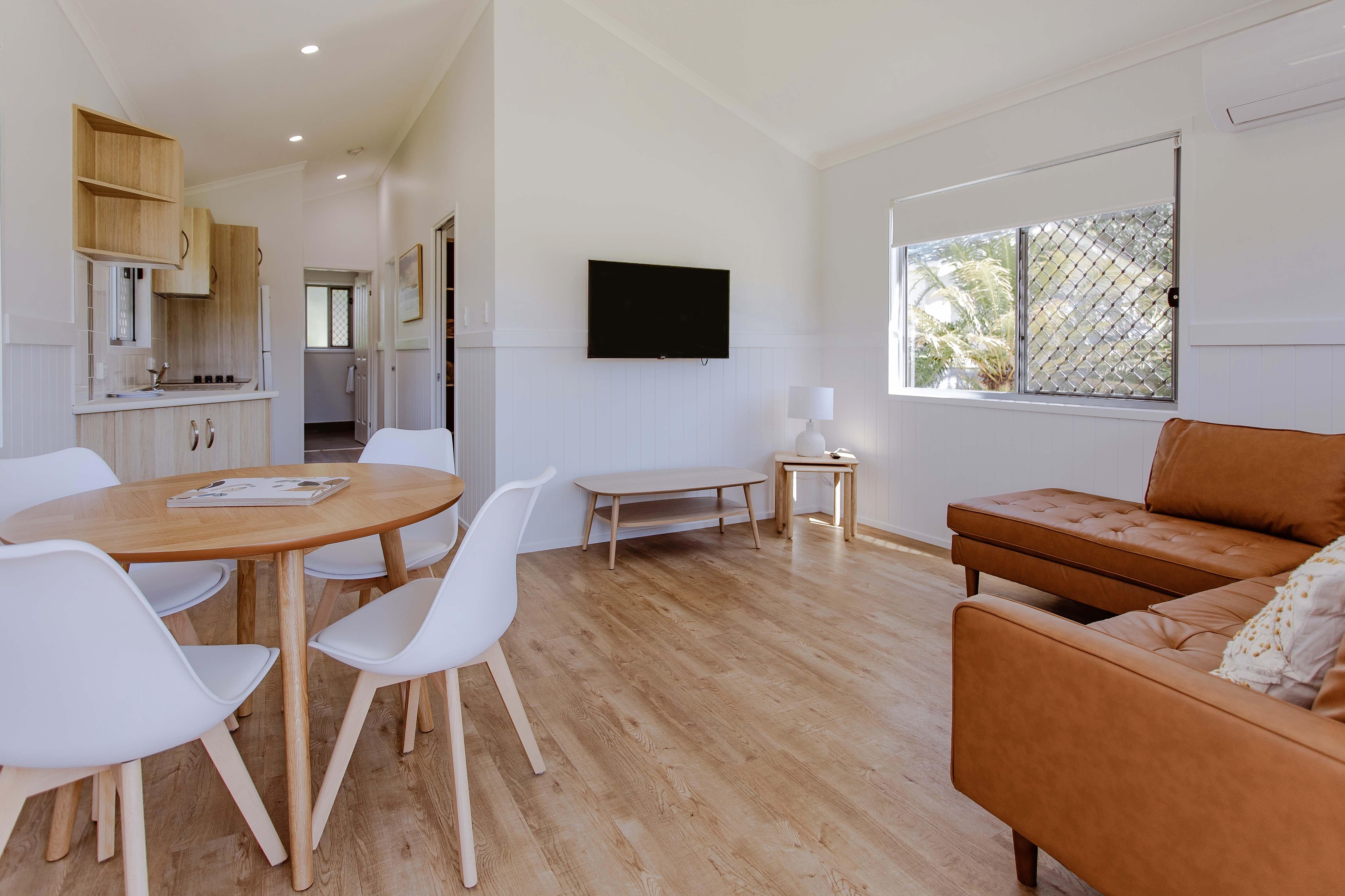 Featuring stunning leather lounge, queen bed in the main bedroom, and two bunk beds (sleeps 4) in the second room. The living area includes a smart TV and split system air conditioning. The bathroom has a shower and vanity, and there is a separate toilet. Enjoy the outlook from the veranda and outdoor table setting.